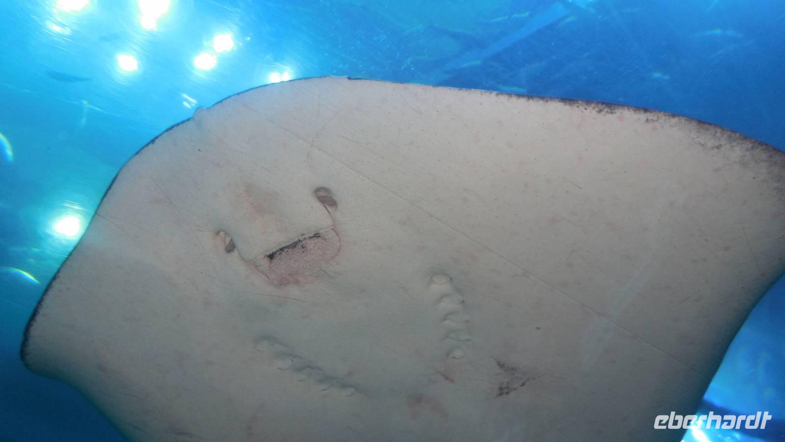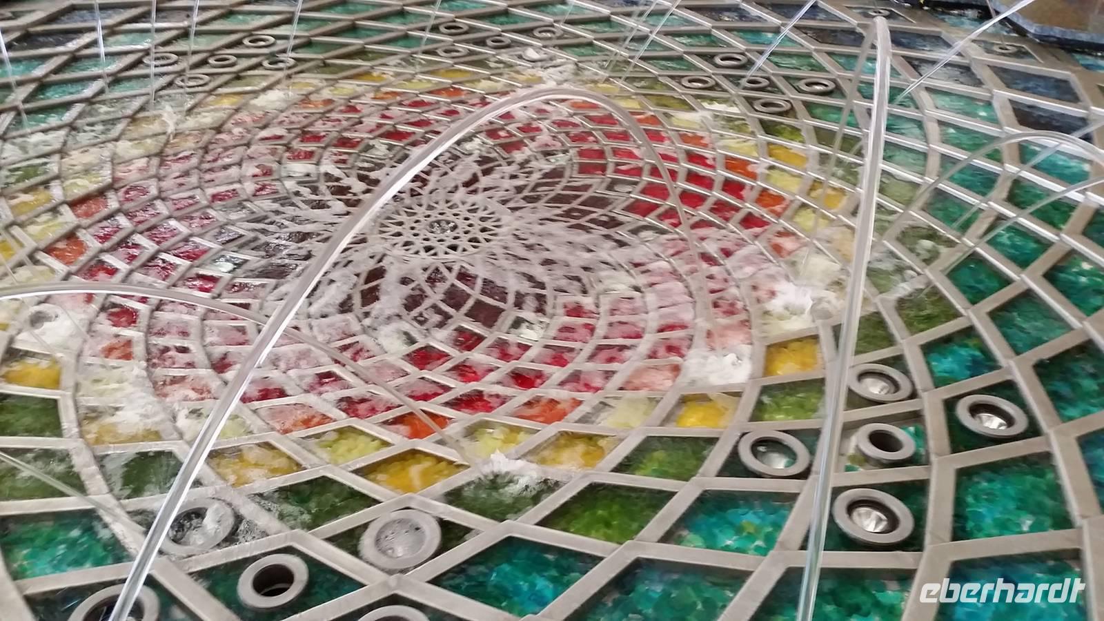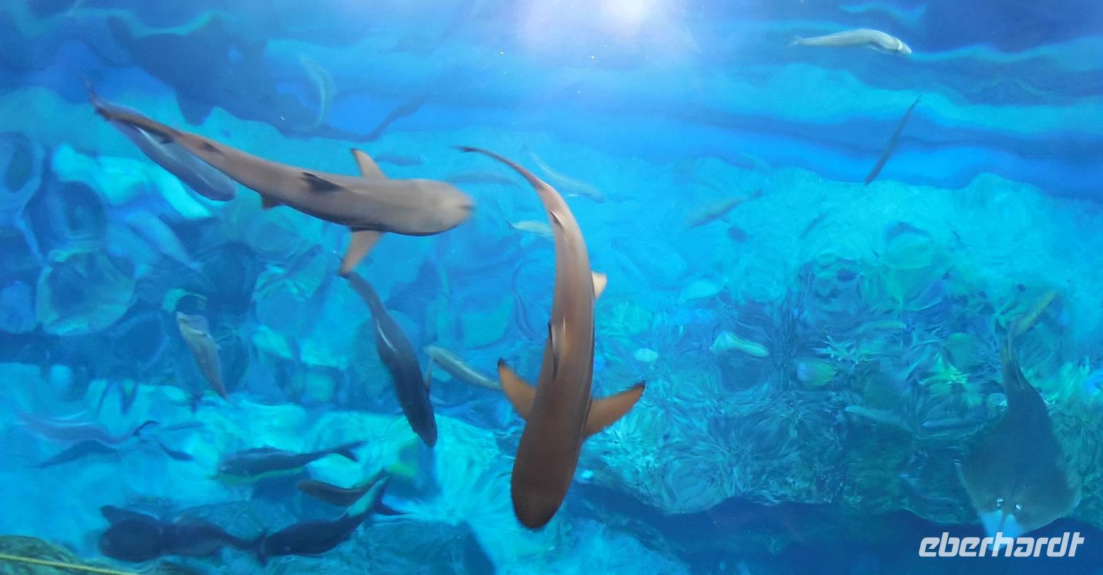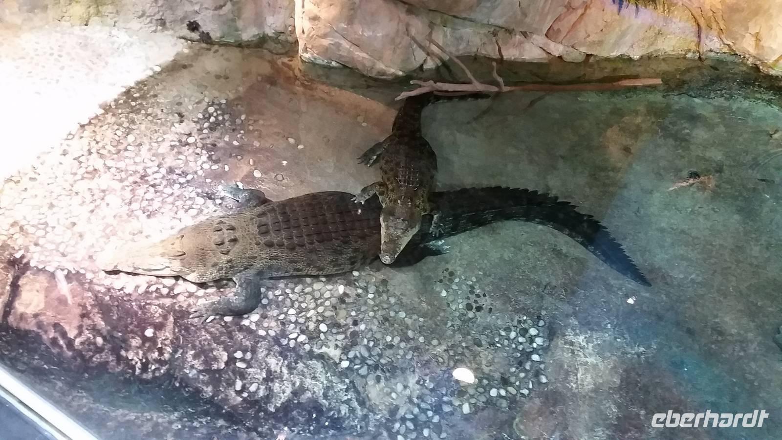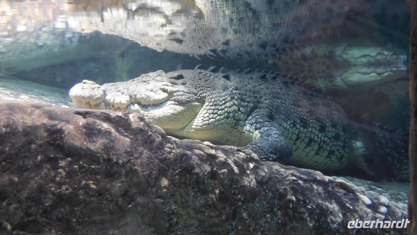 Nach einem kleiner Pause im Hotel fuhren wir zu einem der größten und legendären Einkaufszentren der Welt überhaupt: The Dubai Mall. Wahnsinn. Hier findet man alles und jede Firma der Welt, die etwas sein möchte, muss hier vertreten. Die Dubai Mall zählt bis 1.200 Geschäfte zieht jährlich ca. 37 Millionen Besucher an. Im Januar, wenn jeder mit Ermäßigungen und Rabatten wirbt, ist sie zum Beispiel 24 Stunden lang geöffnet. Das Einkaufszentrum verfügt über eine Gastronomieabteilung mit über 120 Restaurants, wo wir unsere Mittagspause verbrachten. Anschließend erkundeten wir das größte Aquarium der Welt, wo u.a. ein sehr großes Krokodil zu sehen war. Insgesamt findet man hier 33.000 Meerestiere! Natürlich spazierten wir auch durch den Tunnel des Aquariums, wo wir unter Haien und Rochen lang liefen. In dem aus 75 Zentimeter dickem Acrylglas bestehenden Becken befinden sich 10.000 Kubikmetern Seewasser, das man dem Persischen Golf entnimmt.
