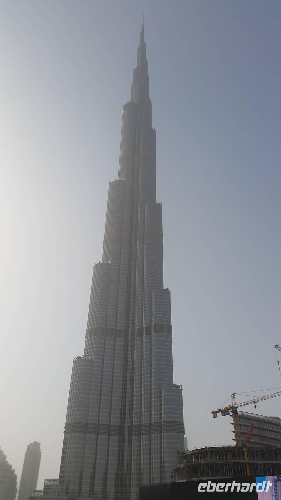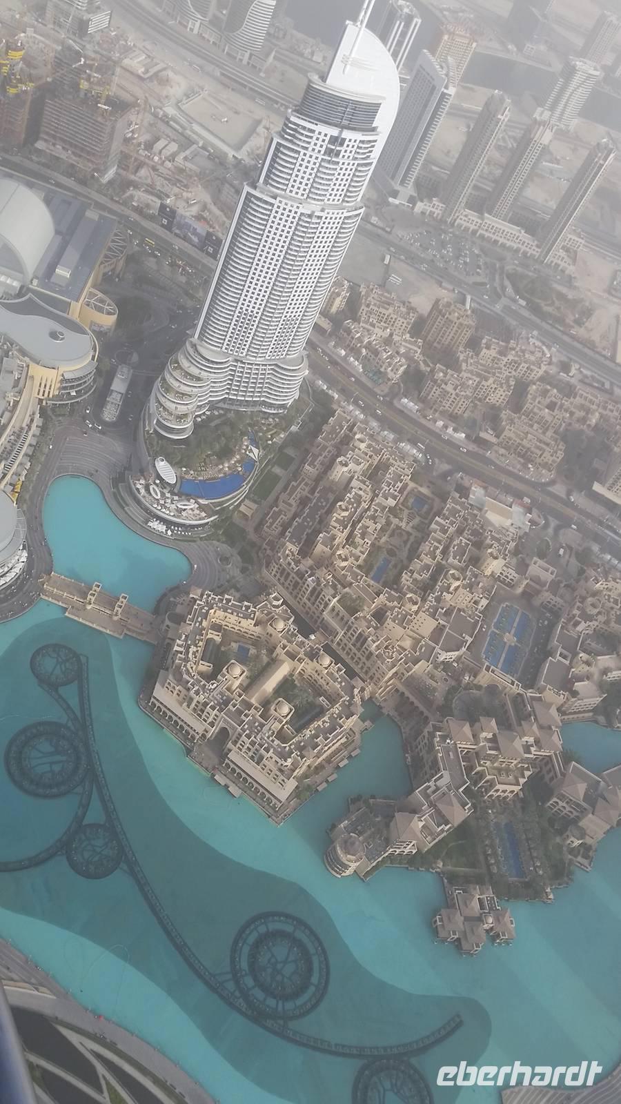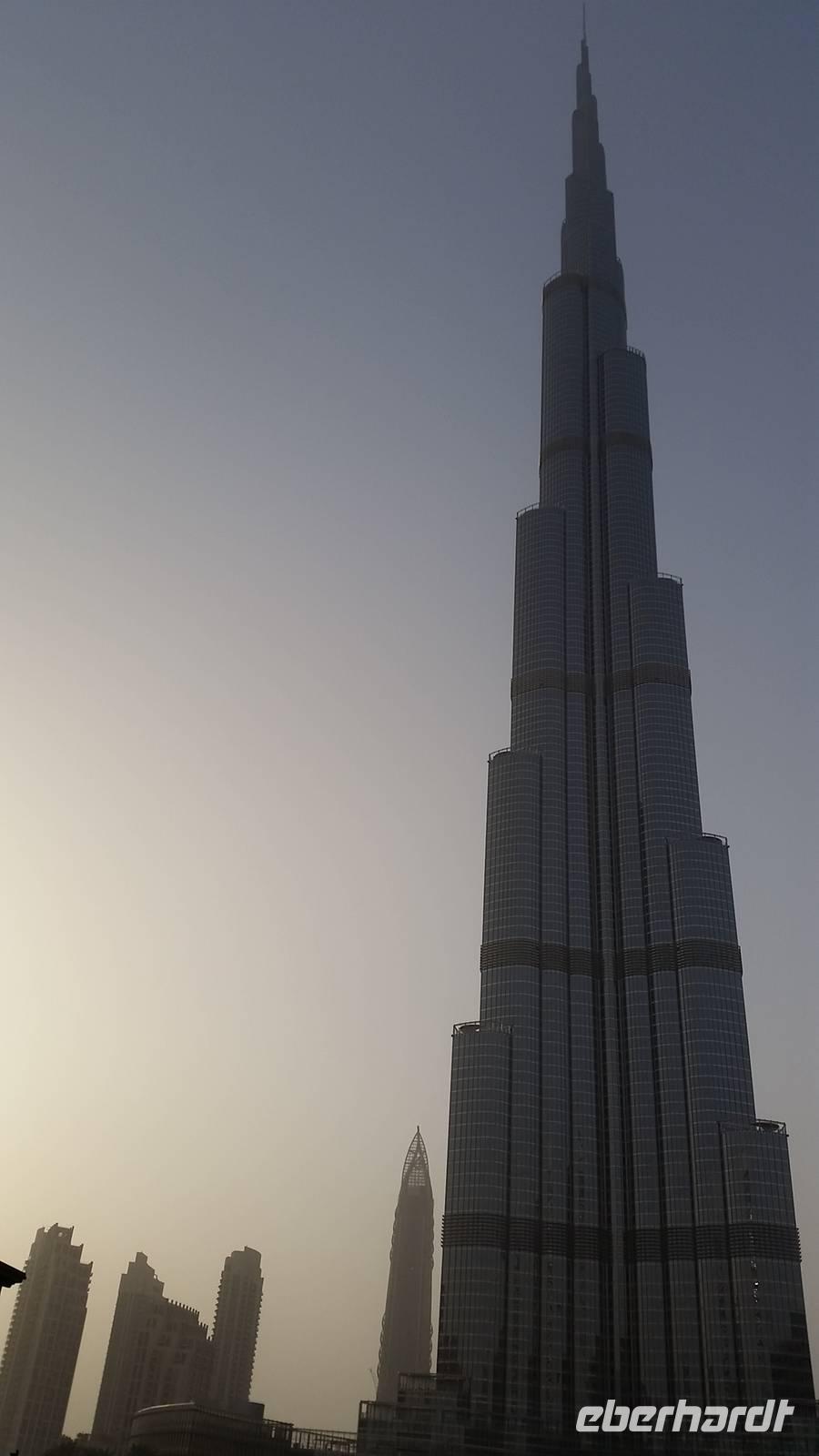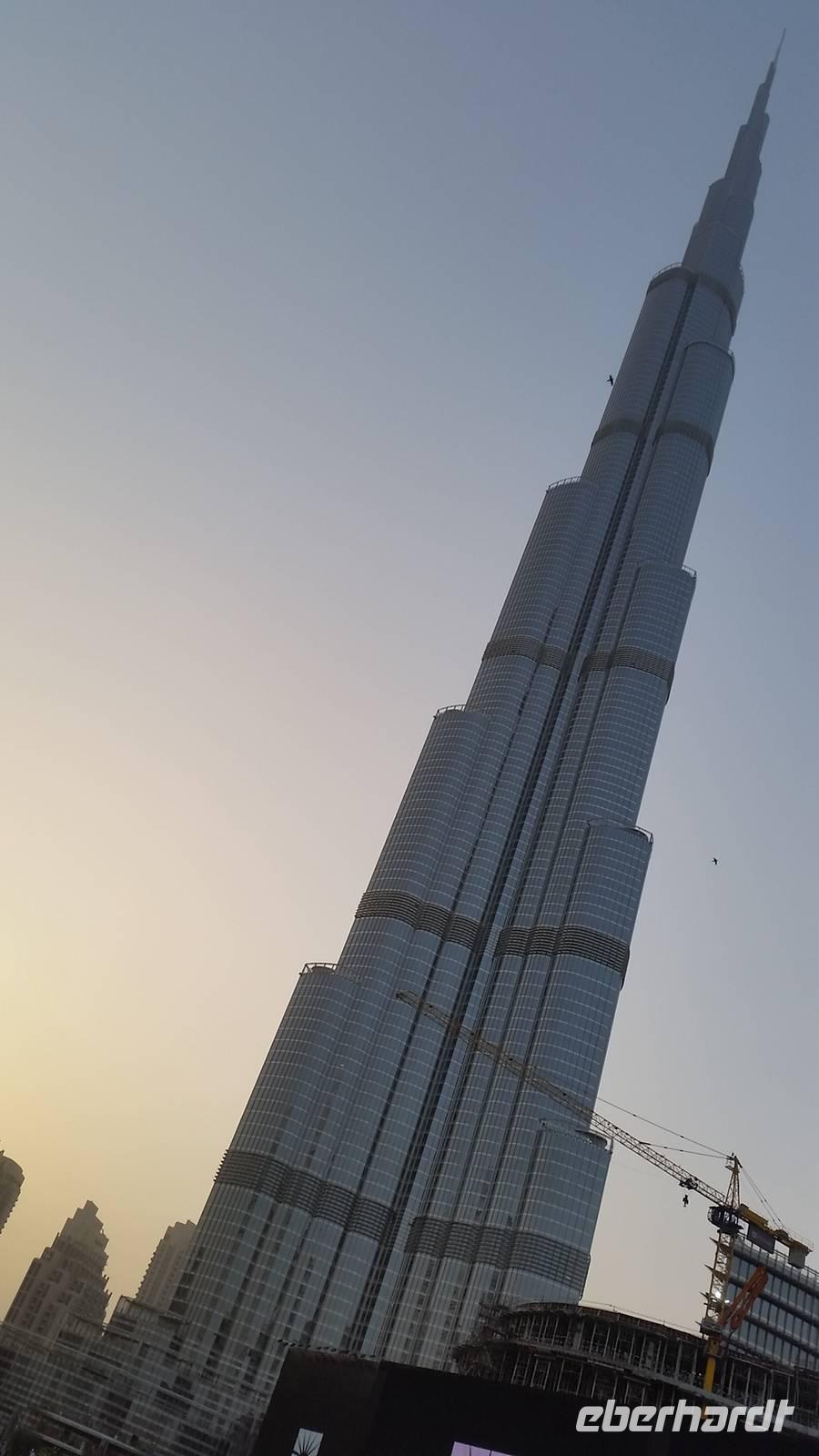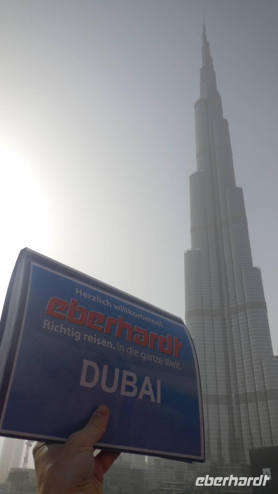 Anschließend stand ein weiterer Höhepunkt unserer Reise auf dem Programm und wir besuchten das höchste Bauwerk der Welt: Den Burj Khalifa, der in nur ca. 5 Jahren erbaut wurde mit 22 Millionen Menschenarbeitstunden. Wir bestaunten das 828 Meter hohe Gebäude mit 170 Etagen. Mit dem schnellsten Aufzug der Welt erreichten wir die Aussichtsplattform auf der 124. Etage in 452 Metern Höhe in nur 55 Sekunden. Nun gingen wir hier zur Außenterrasse "At the Top", der dritthöchsten Aussichtsplattform der Welt. Von hier hatten wir einen gigantischen Blick auf die Dubai Fountain, welche wir später um 18 Uhr mit Wasser und Musik sehen würden. Leider war es heute ein bisschen diessig, sodass wir keine so gute Sicht hatten wie gestern, aber trotzdem bot sich uns ein fantastisches Panorama. Als wir wieder auf dem Erdboden angekommen waren, genossen wir um 18 Uhr die traumhaften Wasserspiele mit arabischer Musik. Unsere Füße waren ein bisschen müde und wir freuten uns auf das arabische Buffet beim Abendessen bei den Rolex Zwillingestürmen, auch „Twin Towers" genannt, wo wir den Geburtstag eines Reisegastes feierten. Er bekam auch ein typisch arabisches Scheich-Kopftuch, damit Reisebegleiter Benjamin einen Kronprinzen hatte, falls etwas passieren sollten. Von der Terrasse, auf welcher wir das Abendessen genossen, hatten wir einen malerischen Ausblick über das Dubai-Creek, wo alles beleuchtet war und genossen die herrlichen Temperaturen. Müde und geschafft von diesem ereignisreichen Tag kamen wir wieder im Hotel an und fielen in unsere Betten bis der Muezzin uns alle um 5.30 Uhr mit seinem Gesang aufwecken würde.