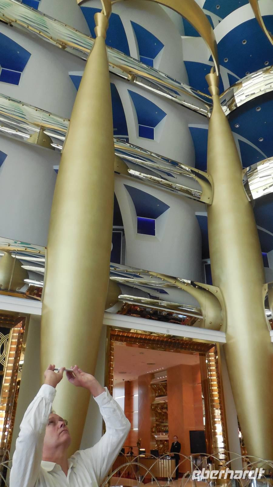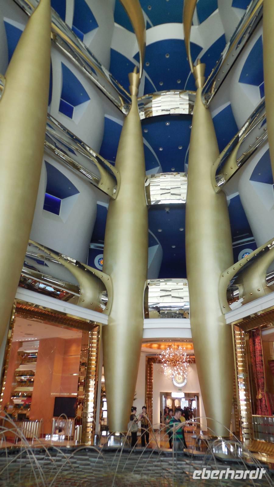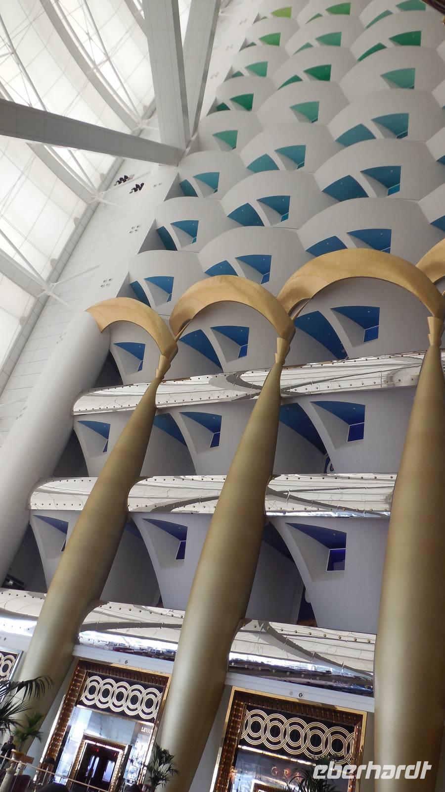 Als hier in den sechziger Jahren Öl gefunden wurde, hatte sich in dem Land, in dem einst nur Tauchperlen, Fischerei oder Handeln wichtig waren, sehr verändert. Genau diese 3 Elemente wollte der Architeckt von dem Burj Al Arab Hotel der Welt zeigen. Ein Gebäude, 321 Meter hoch und in der Form eines Segelbootes ist heute Wahrzeichen von Dubai. Wenn in der Stadt viel Stau ist, kann man sich von hier mit einem Hubschrauber direkt zum Flughafen bringen lassen. Natürlich ist es sehr preisintensiv. Eine Runde Kaffee kostet 80 Euro, für eine Übernachtung muss man mindestens 2.000 Euro zahlen.
