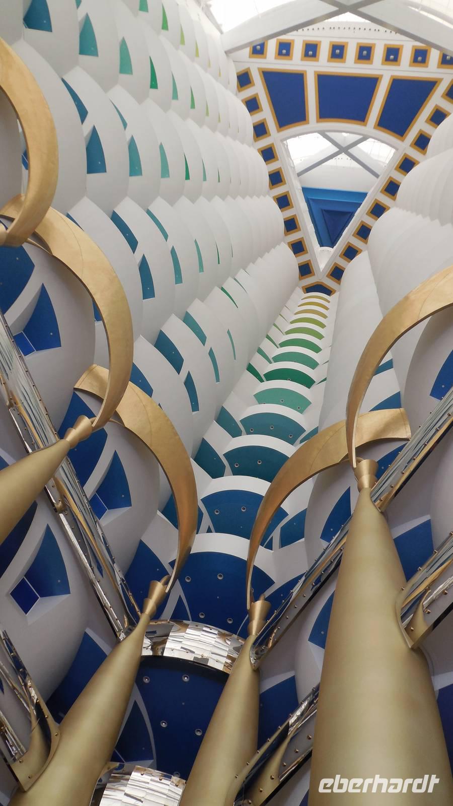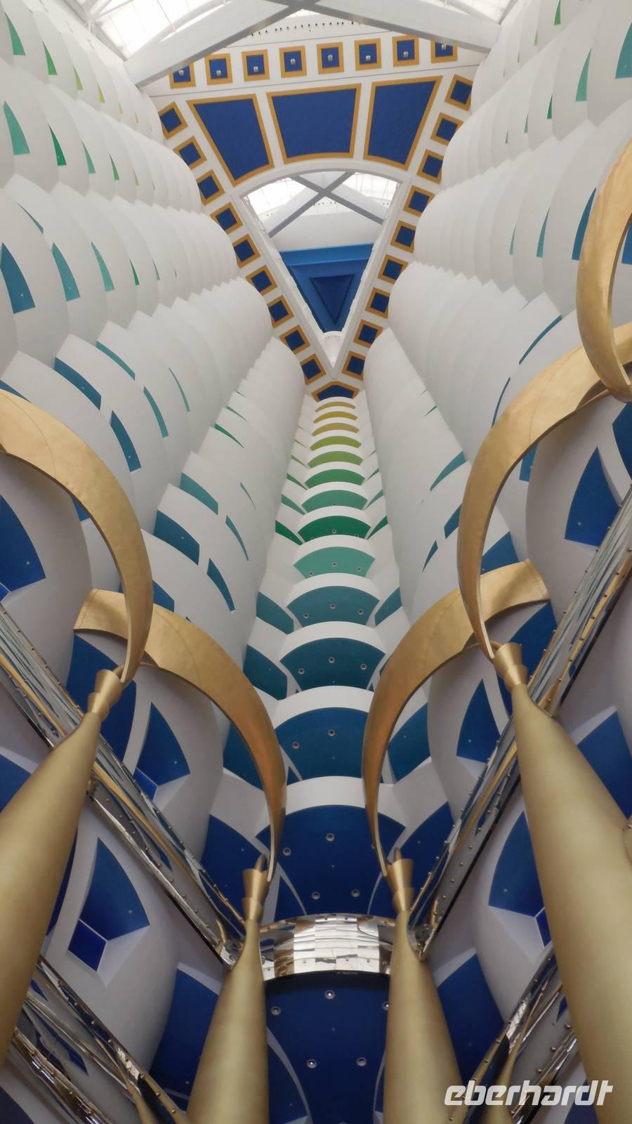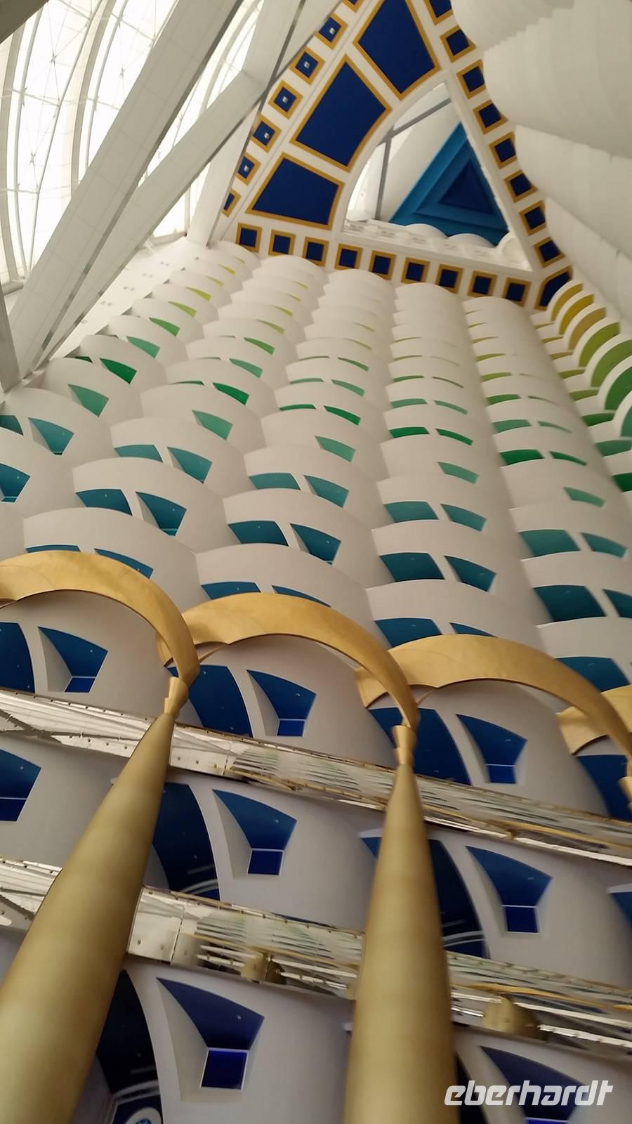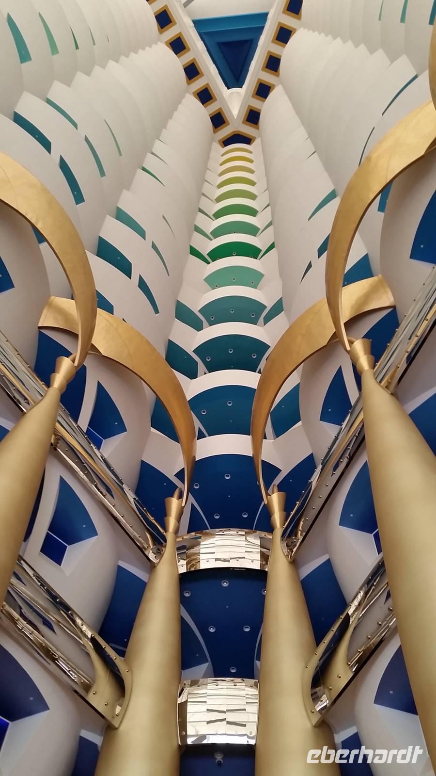 Als hier in den sechziger Jahren Öl gefunden wurde, hatte sich in dem Land, in dem einst nur Tauchperlen, Fischerei oder Handeln wichtig waren, sehr verändert. Genau diese 3 Elemente wollte der Architeckt von dem Burj Al Arab Hotel der Welt zeigen. Ein Gebäude, 321 Meter hoch und in der Form eines Segelbootes ist heute Wahrzeichen von Dubai. Wenn in der Stadt viel Stau ist, kann man sich von hier mit einem Hubschrauber direkt zum Flughafen bringen lassen. Natürlich ist es sehr preisintensiv. Eine Runde Kaffee kostet 80 Euro, für eine Übernachtung muss man mindestens 2.000 Euro zahlen.