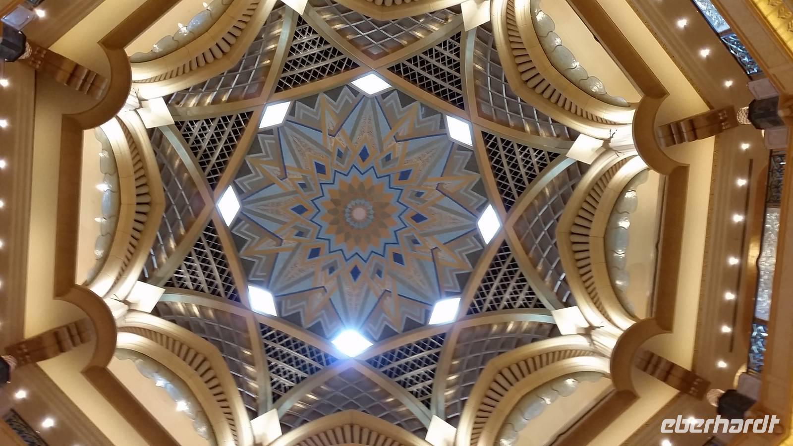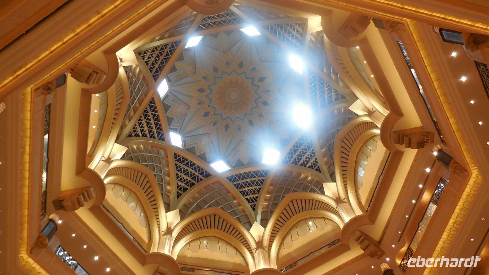 Bevor wir zur Teestunde fuhren, machten wir einen Stopp gegenüber der Strandpromenade beim Heritage Village, ein Freilichtmuseum mit atemberaubenden Blick auf die Skyline von Abu Dhabis. Hier konnten wir uns für das 5 Sterne Hotel Emirates Palace chic machen. Langsam hatten wir uns an Luxus und Eleganz dieser Welt gewöhnt. Das Hotel Emirates Palace der Luxus-Klasse verzauberte uns alle durch majestätische Eleganz und die malerischen Wasserspiele vor dem imposanten Eingang. Die Wände waren voller Blattgold und die Atmosphäre war einfach klasse. Ein Piano im Hintergrund war der einizige Klang zusammen mit unseren Kaffeetassen. Wir ließen uns Törtchen und herzhaften Häppchen aller Art verwöhnen und kosteten schließlich sogar Erdbeeren mit Gold. Als wir das Hotel wieder verlassen hatten, bewunderten wir die Kuppel des Hauses, welche größere ist als im Vatikan.