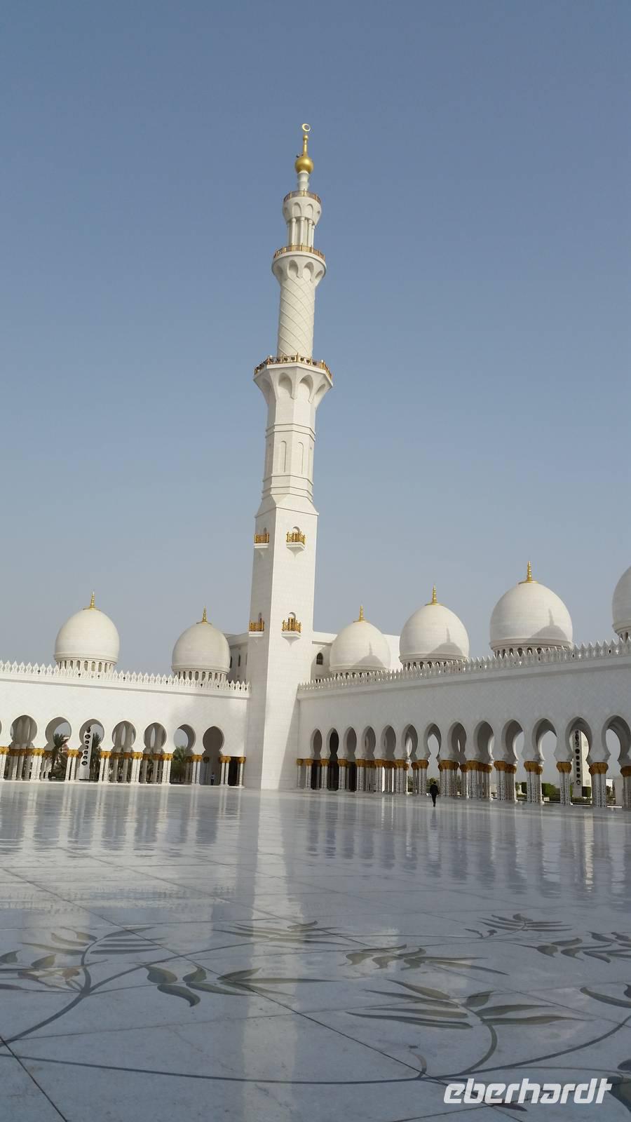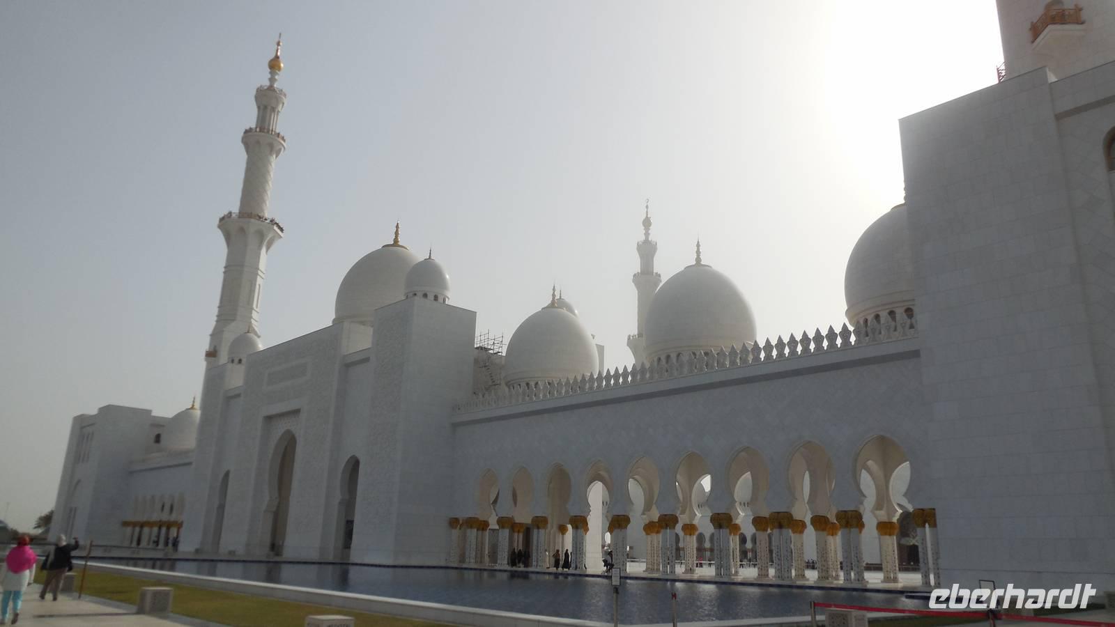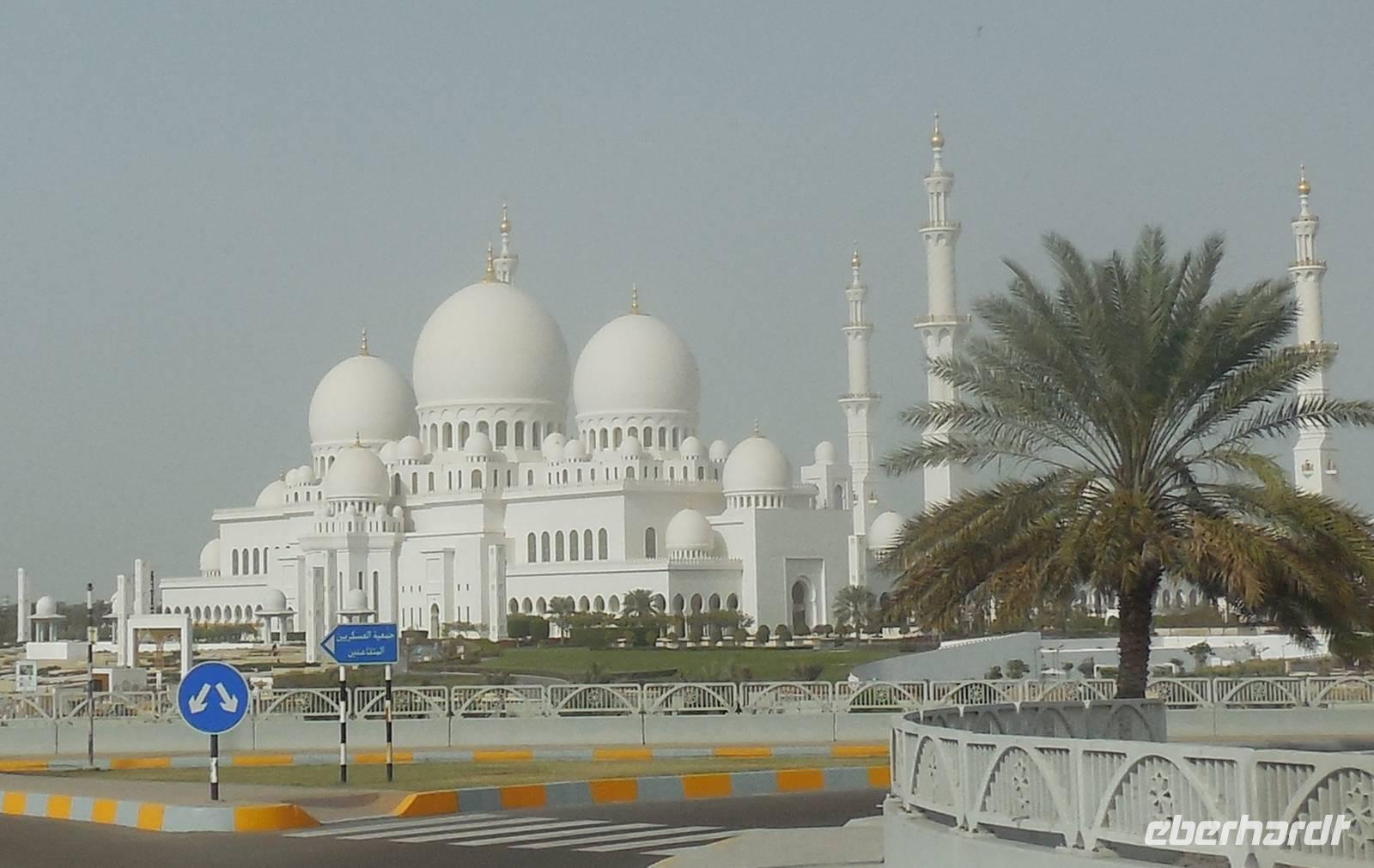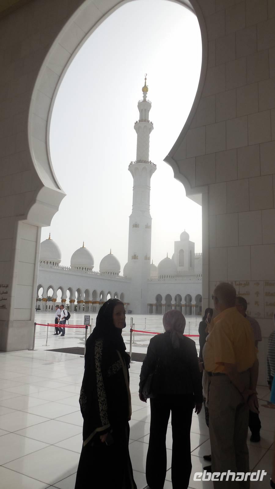 Heute mussten wir schon etwas eher aufstehen, da uns ein langer Tag mit vielen Erlebnissen erwartete. Wir fuhren anderthalb Stunden in Richtung der Hauptstadt der 7 Arabischen Emirate - nach Abu Dhabi. Auf dem Weg erklärte uns unsere liebe Reiseleiterin Anja viel über dieses Land, seine Bevölkerung, Politik und über die Lebensweise. Die Vereinigten Arabischen Emirate bestehen aus 7 Emiraten, die mit den Bundesländern in Deutschland vergleichbar sind. Die beiden bekanntesten Emirate sind Dubai und Abu Dhabi. Ihre Geschichte ist bestimmt vom Scheich, seinen Familienverhältnissen und seiner Macht. Für den Scheich bedeutet Macht auch Verantwortung und so wurde er so beliebt. Wenn es ihm gut geht, soll es auch den anderen gut gehen. Das ist seine Philosophie. Deswegen wird der Scheich jedes Jahr am Nationalfeiertag am 2. Dezember Nationalfeiertag gefeiert wie ein Volksheld.
