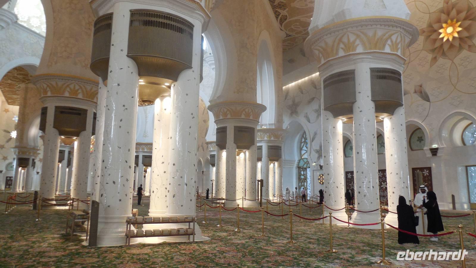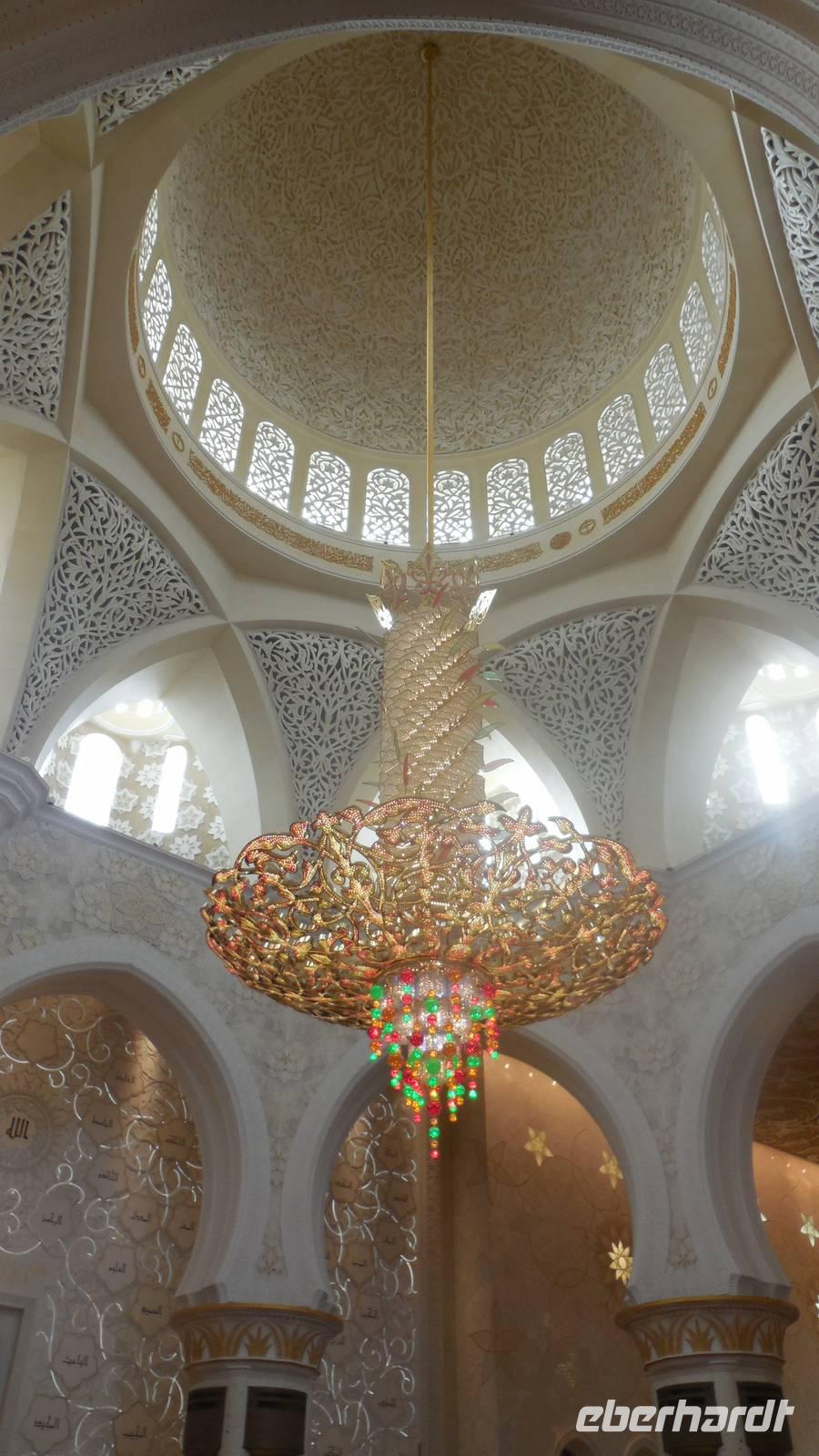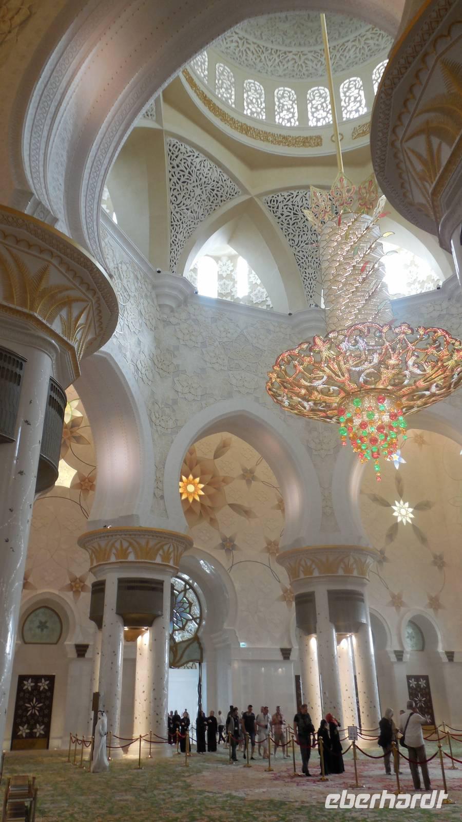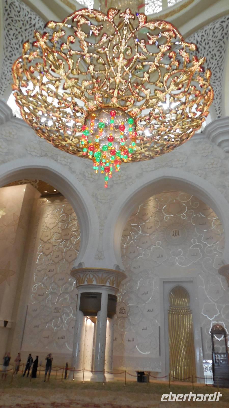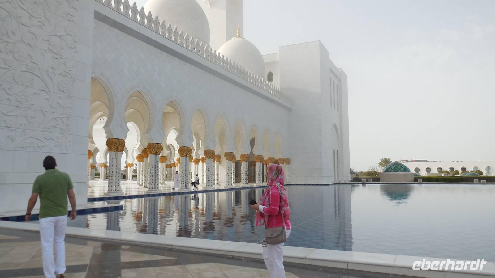Nun freuten wir uns auf den nächsten Stopp, die Große Sheikh-Zayed-Moschee in Abu Dhabi. Die Frauen müssen hier lange Hose und eine Jacke tragen, Kopftuch ist ebenfalls Pflicht und natürlich mussten die Schuhe vor der Moschee ausgezogen werden. Anja, unsere Reiseleiterin, erklärte uns die 5 Säulen des Islams. Dazu gehören der Glaube an den einen Gott, 5 Gebete am Tag, spenden, der Fastenmonat Ramadan sowie die Pilgerfahrt einmal im Leben nach Meca. Anja zeigte und auch, wo sich die Gebetsuhr befindet und was es bedeutet. Uns hat uns der Moschee sehr gut gefallen und es war sehr beeindruckend. Es ist einer der größten Moscheen der Welt, genauer gesagt die achtgrößte Moschee und wurde zwischen 1999 und 2007 gebaut.