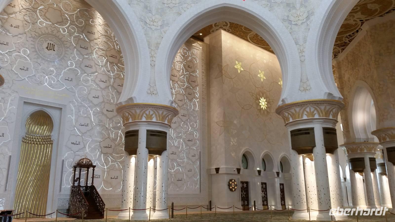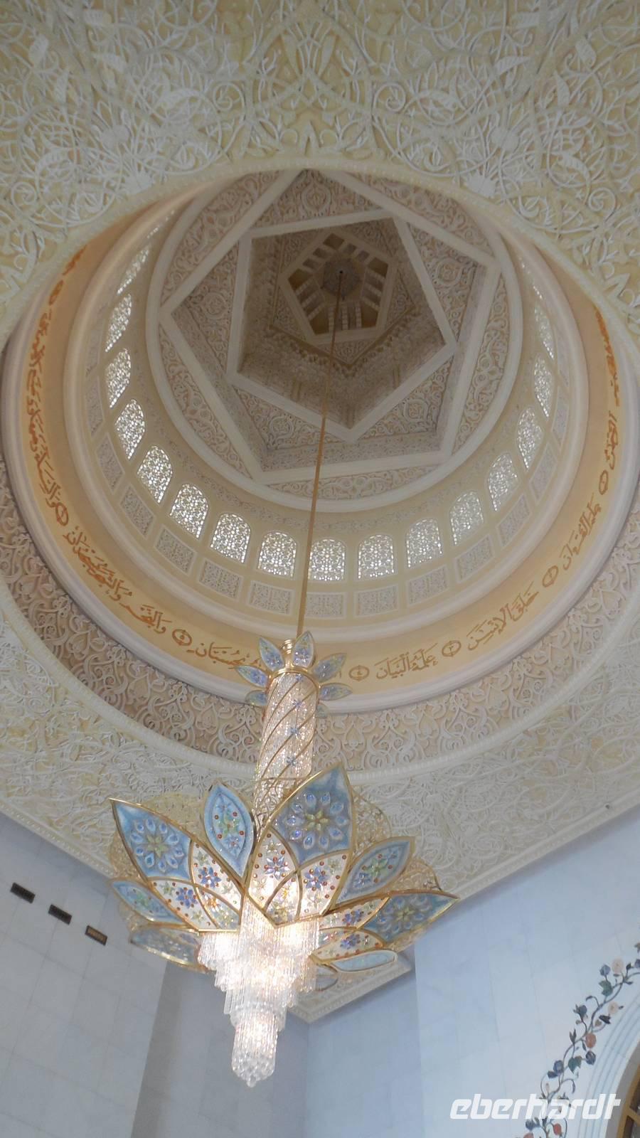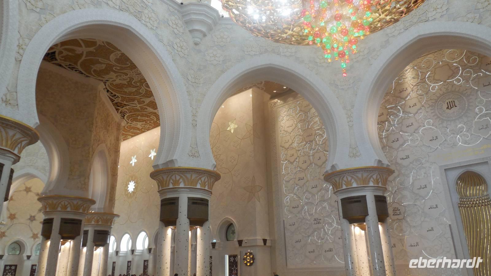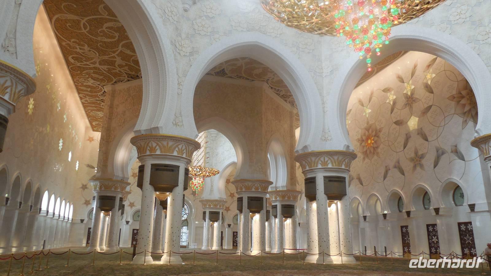 Nun freuten wir uns auf den nächsten Stopp, die Große Sheikh-Zayed-Moschee in Abu Dhabi. Die Frauen müssen hier lange Hose und eine Jacke tragen, Kopftuch ist ebenfalls Pflicht und natürlich mussten die Schuhe vor der Moschee ausgezogen werden. Anja, unsere Reiseleiterin, erklärte uns die 5 Säulen des Islams. Dazu gehören der Glaube an den einen Gott, 5 Gebete am Tag, spenden, der Fastenmonat Ramadan sowie die Pilgerfahrt einmal im Leben nach Meca. Anja zeigte und auch, wo sich die Gebetsuhr befindet und was es bedeutet. Uns hat uns der Moschee sehr gut gefallen und es war sehr beeindruckend. Es ist einer der größten Moscheen der Welt, genauer gesagt die achtgrößte Moschee und wurde zwischen 1999 und 2007 gebaut.