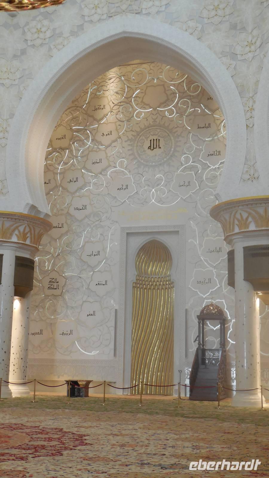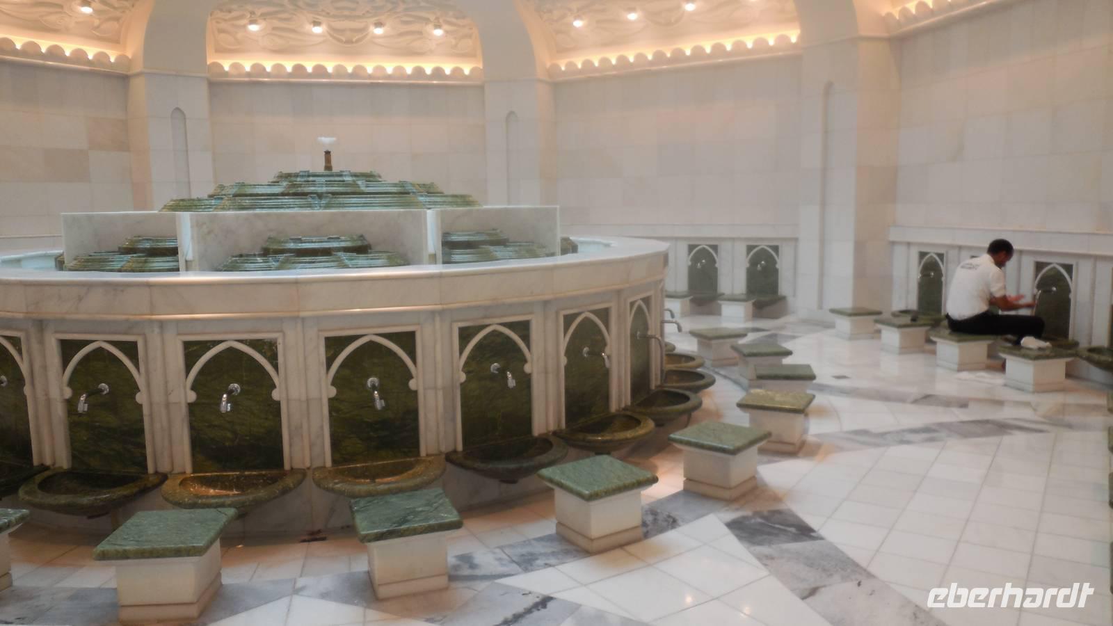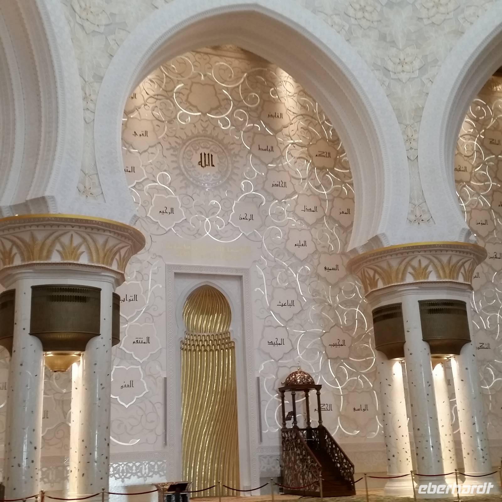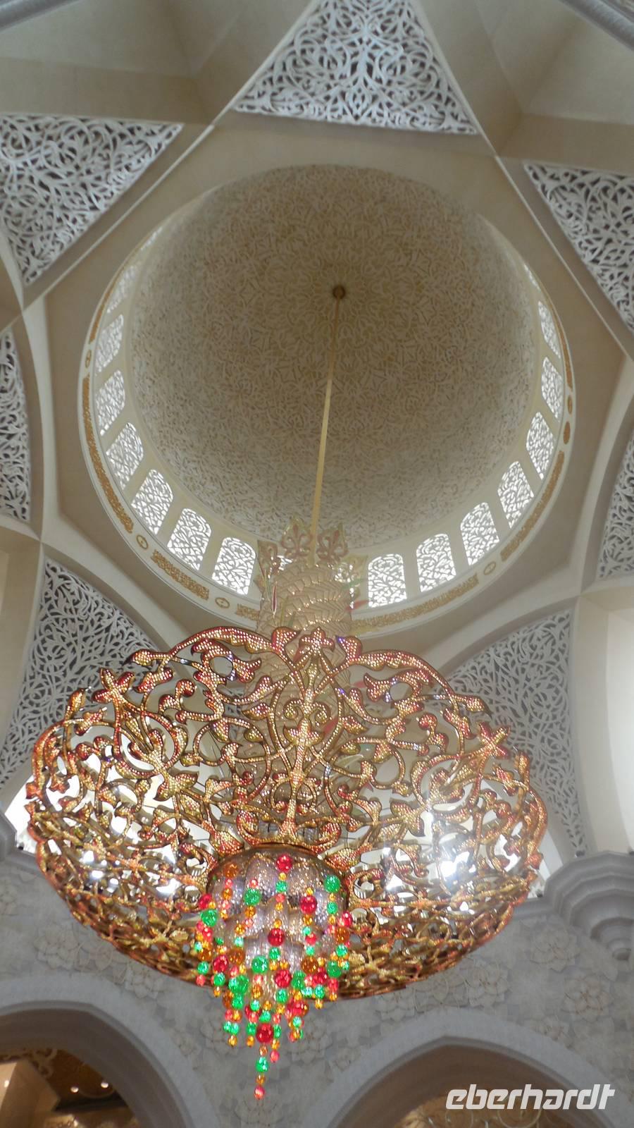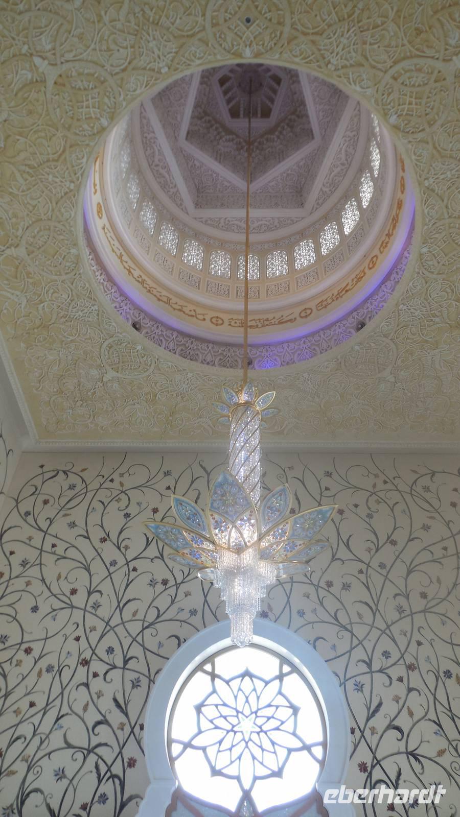 Nun freuten wir uns auf den nächsten Stopp, die Große Sheikh-Zayed-Moschee in Abu Dhabi. Die Frauen müssen hier lange Hose und eine Jacke tragen, Kopftuch ist ebenfalls Pflicht und natürlich mussten die Schuhe vor der Moschee ausgezogen werden. Anja, unsere Reiseleiterin, erklärte uns die 5 Säulen des Islams. Dazu gehören der Glaube an den einen Gott, 5 Gebete am Tag, spenden, der Fastenmonat Ramadan sowie die Pilgerfahrt einmal im Leben nach Meca. Anja zeigte und auch, wo sich die Gebetsuhr befindet und was es bedeutet. Uns hat uns der Moschee sehr gut gefallen und es war sehr beeindruckend. Es ist einer der größten Moscheen der Welt, genauer gesagt die achtgrößte Moschee und wurde zwischen 1999 und 2007 gebaut.