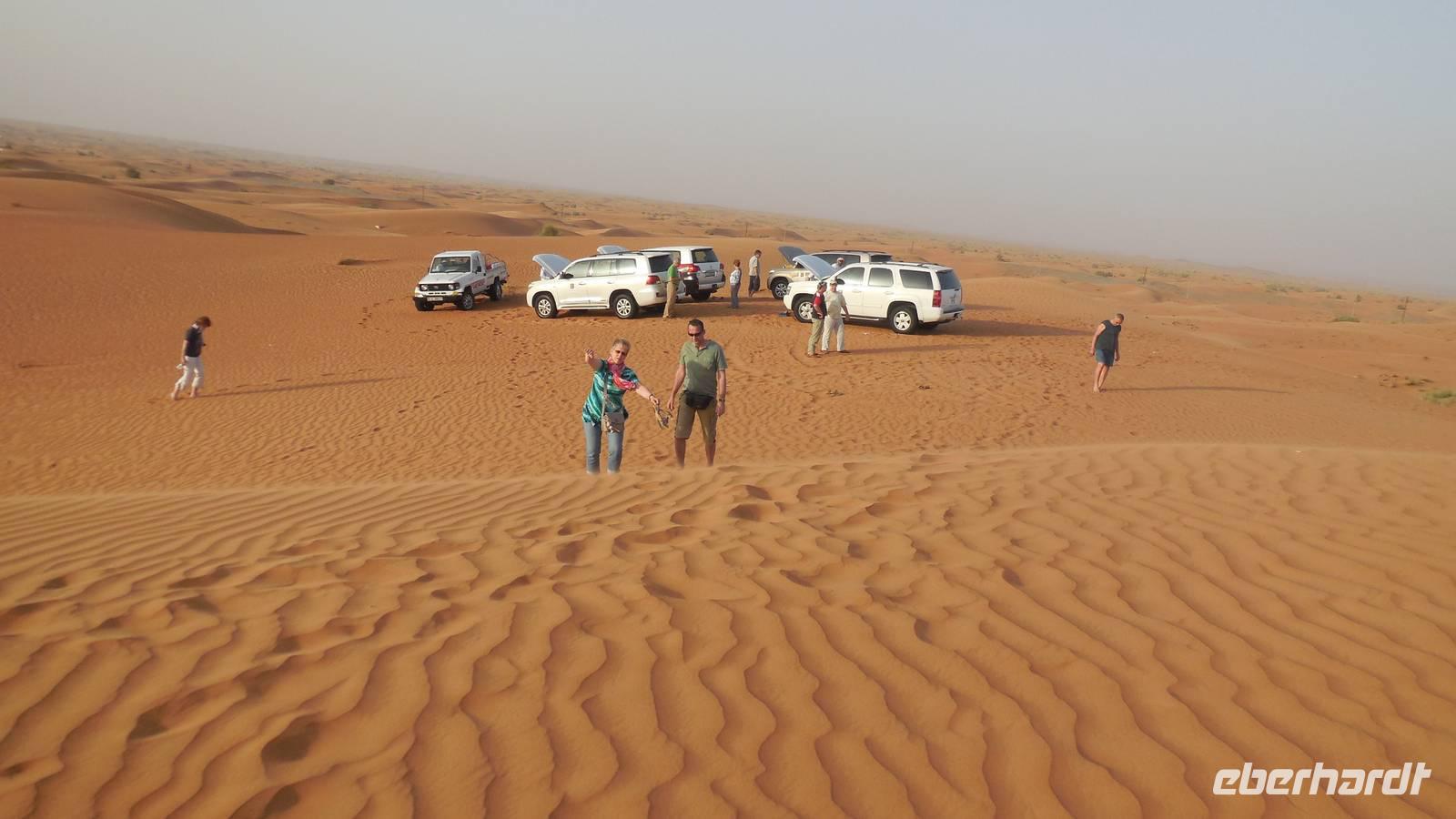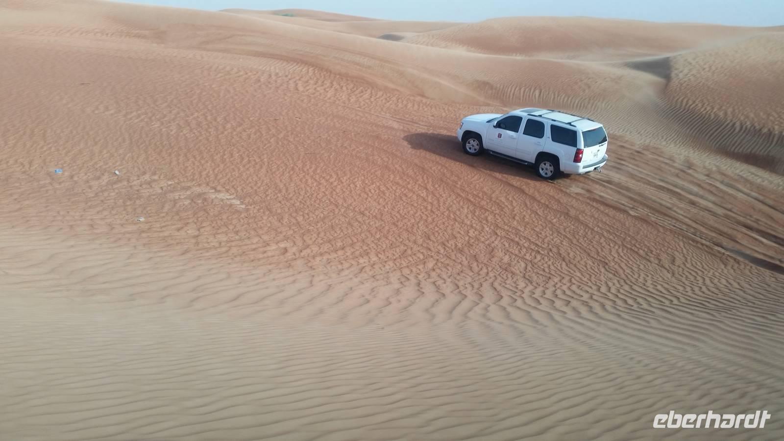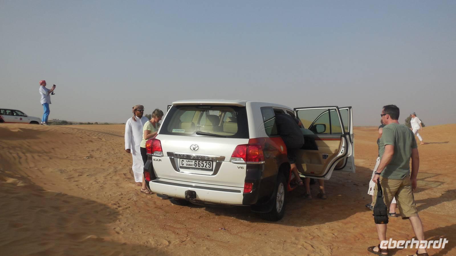 Anschließend fuhren wir zum „Blauen Souk", dem meistfotografierten Wahrzeichen Sharjahs. Dieses Souk lockt mit mehr als 600 Geschäften, welche Gold, Stoffe, Tüchr oder Elektronische Geräte zu ganz guten Preisen verkaufen. Langsam bekamen wir Appetit und fuhren zum Hotel, wo wir das leckere Buffet zum Mittagessen genossen. Heute besonders zu empfehlen war der Fisch und die Pasta. Nach einer kurzen Mittagspause trafen wir uns an der Rezeption und gegen 15 Uhr wurden wir von vier modernen, klimatisierten Jeeps abgeholt. Die geübten Fahrer fuhren uns durch die beeindruckende Dünenlandschaft Dubais und präsentierten uns ihr ganzes Können.