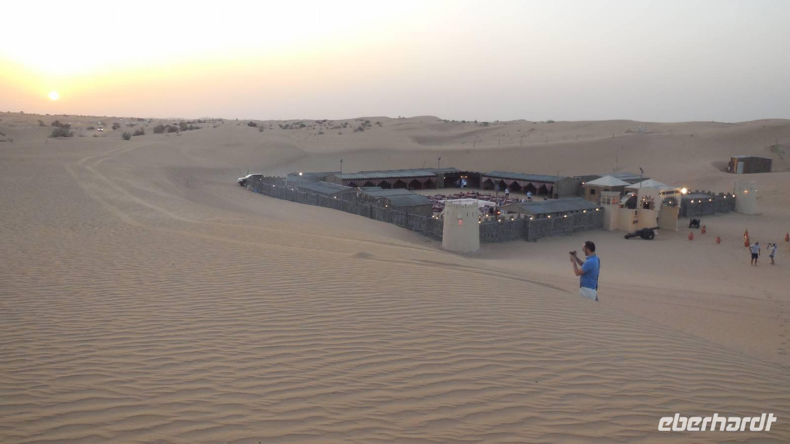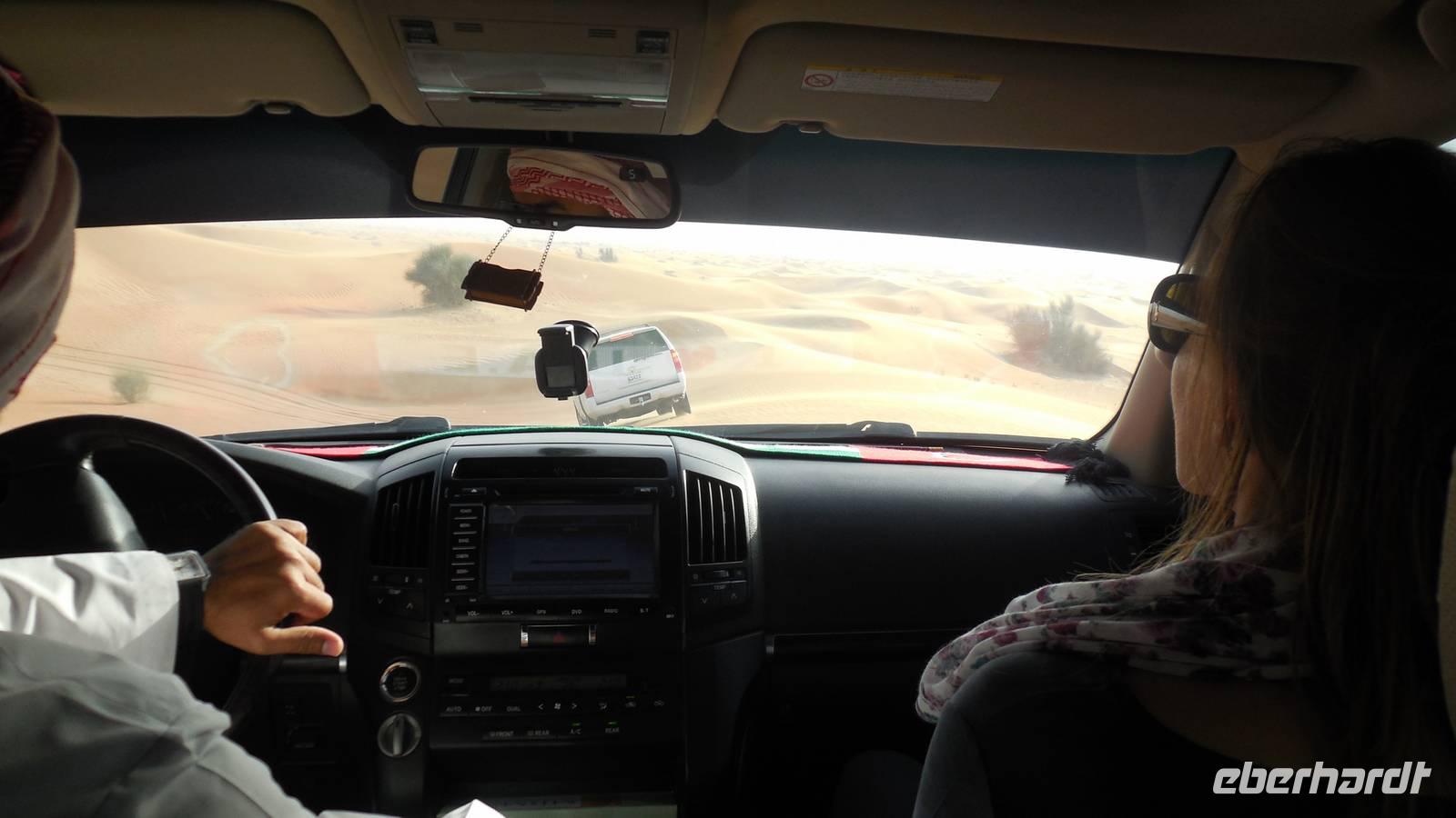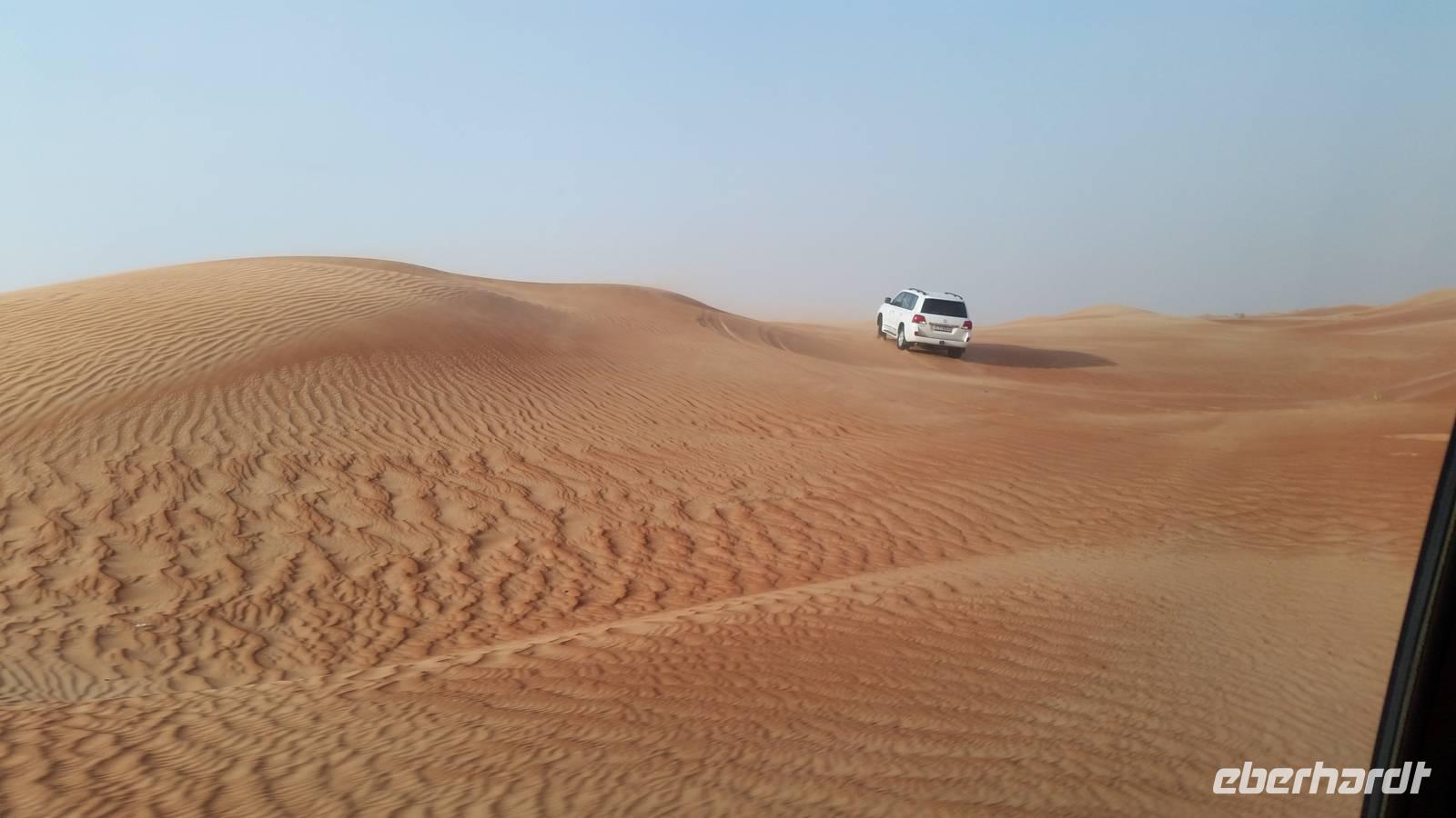 Anschließend fuhren wir zum „Blauen Souk", dem meistfotografierten Wahrzeichen Sharjahs. Dieses Souk lockt mit mehr als 600 Geschäften, welche Gold, Stoffe, Tüchr oder Elektronische Geräte zu ganz guten Preisen verkaufen. Langsam bekamen wir Appetit und fuhren zum Hotel, wo wir das leckere Buffet zum Mittagessen genossen. Heute besonders zu empfehlen war der Fisch und die Pasta. Nach einer kurzen Mittagspause trafen wir uns an der Rezeption und gegen 15 Uhr wurden wir von vier modernen, klimatisierten Jeeps abgeholt. Die geübten Fahrer fuhren uns durch die beeindruckende Dünenlandschaft Dubais und präsentierten uns ihr ganzes Können.