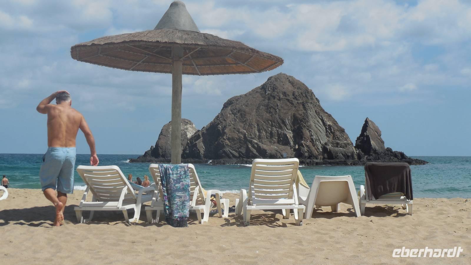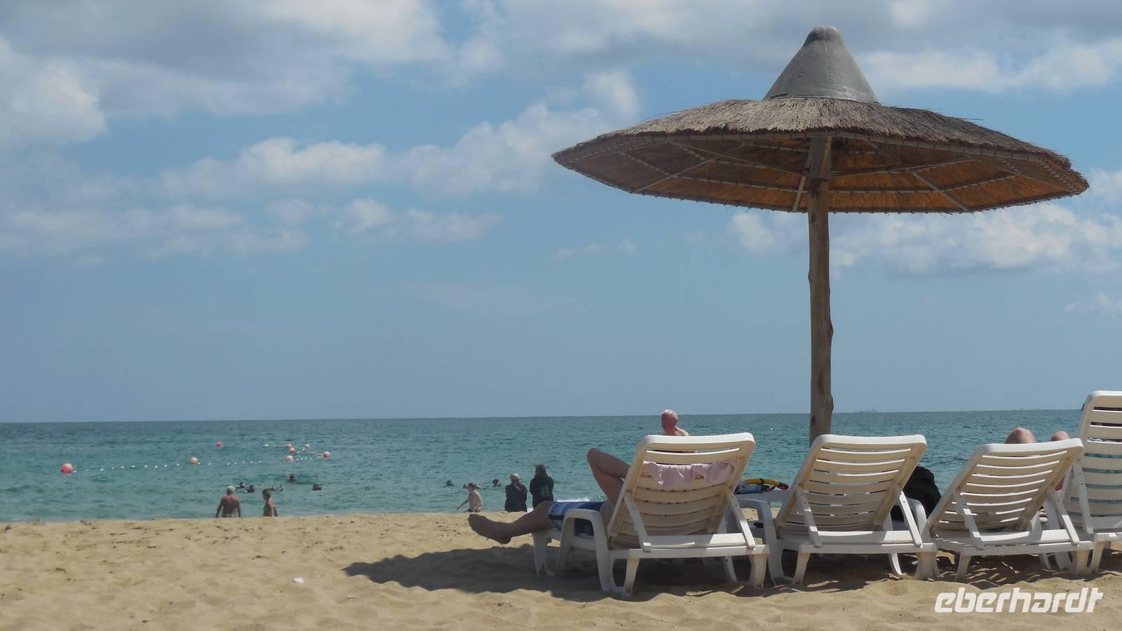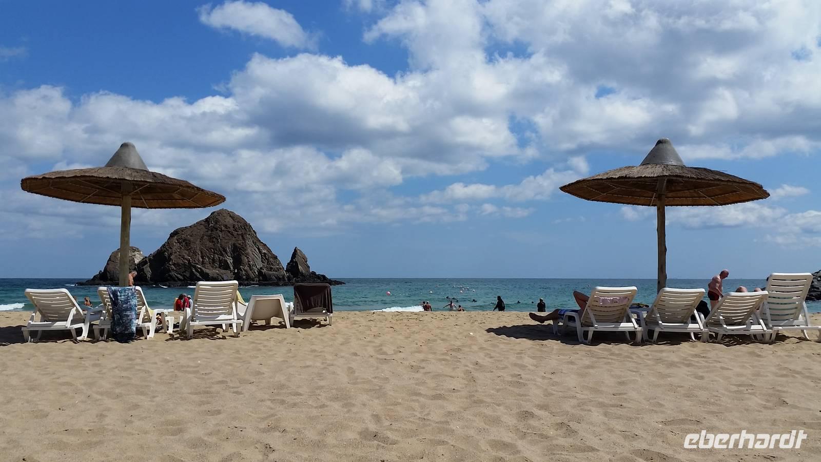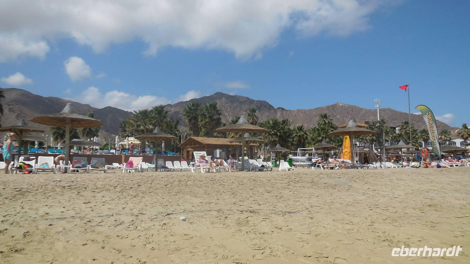 Bevor wir uns am Meer erholten fuhren wir kurz vor Fujairah zur Moschee von Bidiyah, die älteste Moschee der Vereinigten Arabischen Emiraten aus dem 1500 Jahrhundert. Ebenso besichtigten wie zwei noch gut erhaltene alte Wachtürme aus der Zeit als die Portugiesen zurück von Indien hier vorbei kamen. Unser schmackhaftes Mittagessen vom Buffet war am Sandy Beach Hotel wo wir im Meer am Golf von Oman badeten und den Pool hier im Hotel auch mehr als 3 Stunden lang genossen haben. Wir konnten uns nach dem Essen in den Sonnenliegen am Strand ausruhen und das salzige Wasser in der Sonne auf unserer Haut trocknen lassen. Herrlich. Zurück in Dubai fuhren wir wieder durch die Wüste, durch eine Landschaft wo der Sand immer roter wurde.