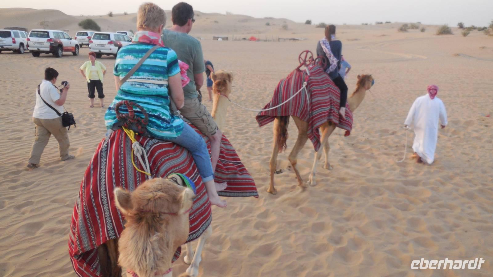 Nach einigen Fotostopps fuhren wir bis zum Wüstencamp, wo später das Abendessen stattfinden würde. Aber zunächst stand ein Kamelritt auf dem Programm. Schon lange habe ich nicht mehr so viel gelacht. Jedes Mal, wenn die Kamelen „in die Knie gingen", um jemanden absteigen zu lassen, waren unsere Gesichter sehr lustig. Die Sonne wanderte nun immer tiefer und tiefer und die Farben änderten sich schnell. Als der Sonnenuntergang kam und die Wüste in einer besonderen Farbe erscheinen ließ, spürten wir die besondere Magie, die dieser Ort ausstrahlte.