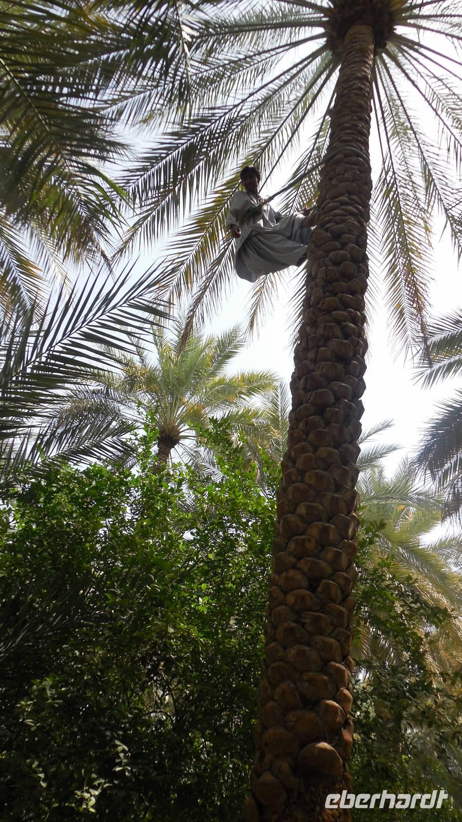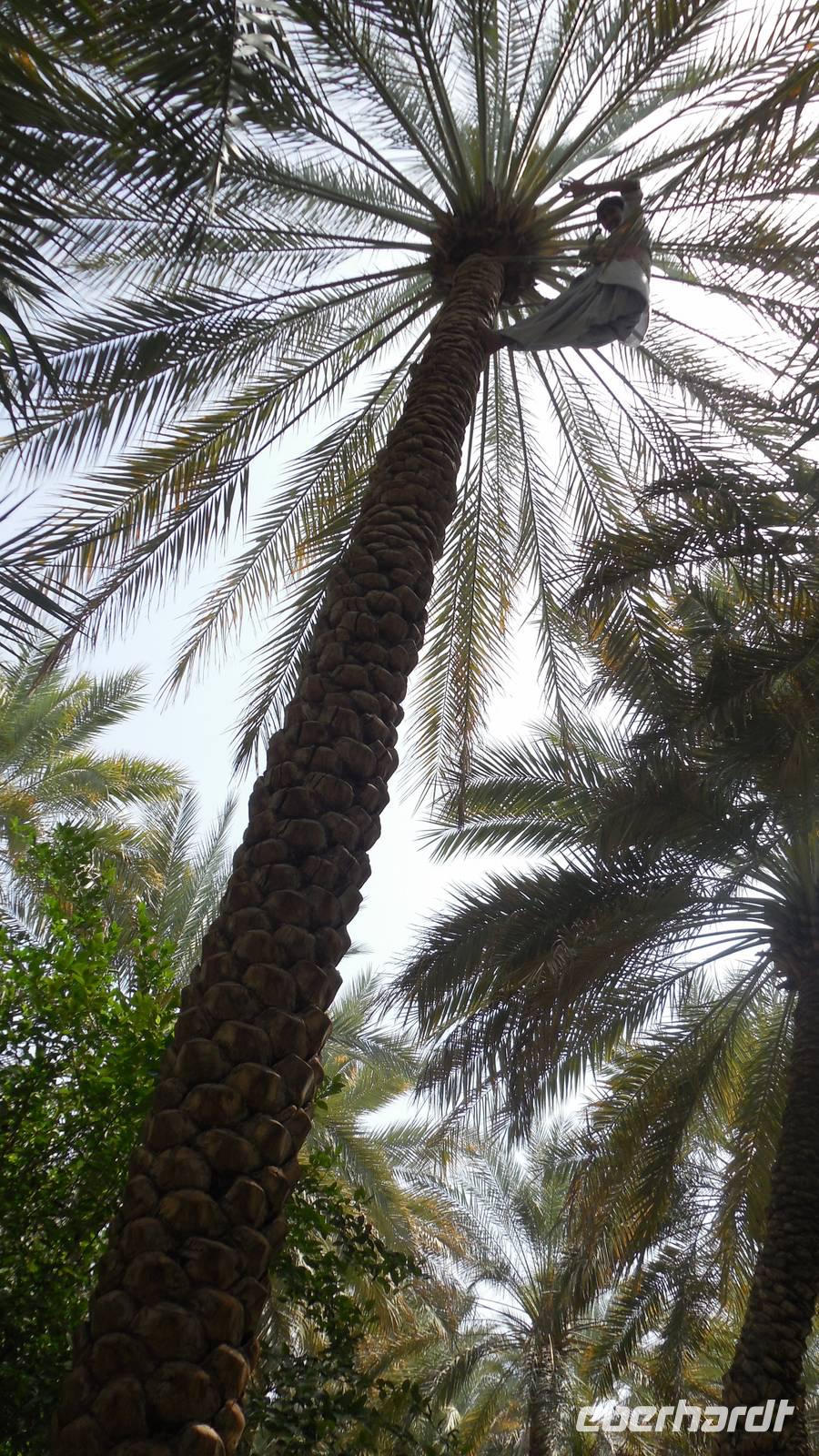 Der Palmengarten oder der spätere Kamelmarkt sind ebenso sehenswert wie das Museum von Al Ain. Wir spazierten durch die ursprüngliche natürliche Oase und lernten hier einen Palmenkletterer kennen, der für uns auf die Palme hoch und runter stieg. Er hatte für uns auch leckere Palmendatteln zu verkosten und zu verkaufen. Wenn man die Datteln mit Speck in der Pfanne brät, schmecken diese sehr gut.