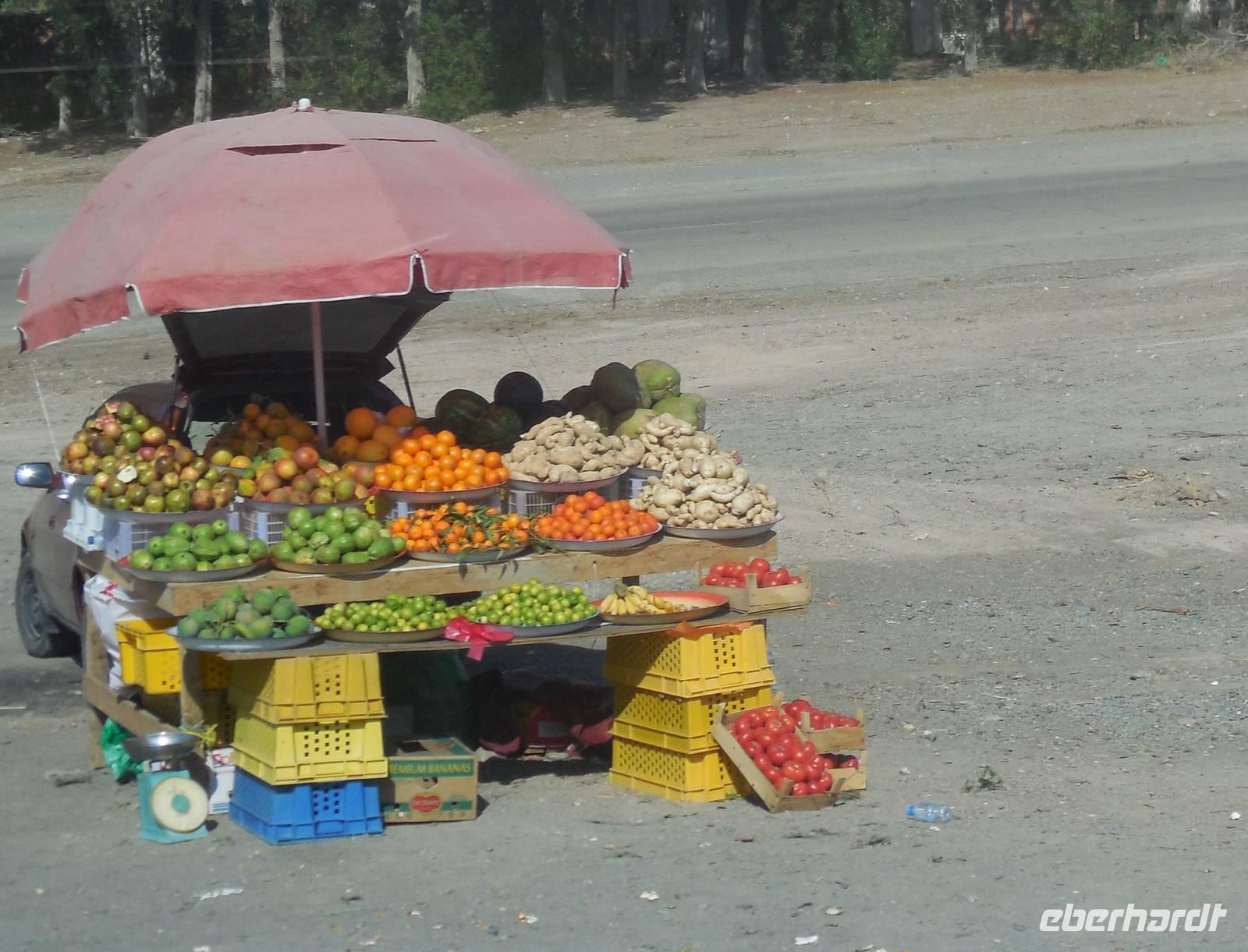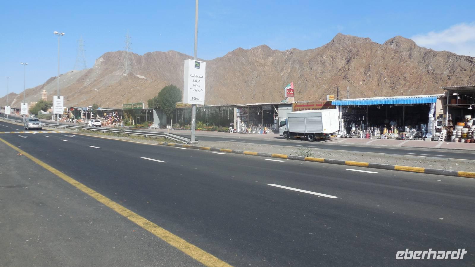 An einer Tankestelle an der Autobahn machten wir eine kurze Pause und hatten die Möglichkeit, Kamelmilch zu probieren. Wir fuhren weiter und das Harja Gebirge kam immer näher. Diese Gebirgskette entsteht in Oman, von deren Grenze wir heute nur 10 Meter entfernt sein werden. Der Sand war hier sehr rot, da in dem Boden sehr viel Eisen enthalten ist. Auf dem Weg änderte sich die Landschaft du wir sahen immer mehr Farmen und Viehfarmen.