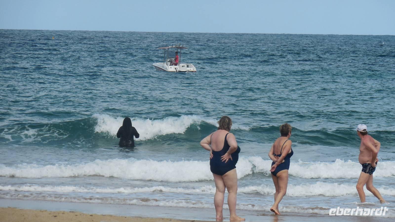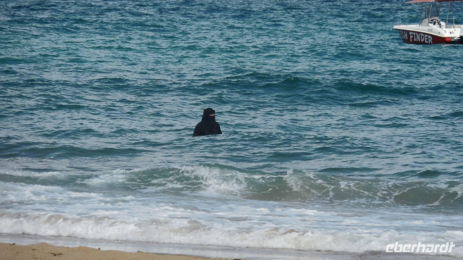 Zuerst fuhren wir an einem riesigen Kreuzverkehr vorbei, in dessen Mitte sich eine große Figur eines geöffneten Korans befindet. Die Gebäude auf dem ganzen Platz sind in typischer arabischer Architektur erbaut und passen alle ganz gut zusammen. Als wir an der Strandpromenade vorbei an das neue Sheraton Hotel fuhren, hatte unser Bus plötzlich eine Panne. Solche Dinge passieren leider, aber es hatte auch eine positive Seite, denn so konnten wir die Gelegenheit nutzen, am Strand wunderschöne Muscheln und Koralen zu sammeln oder sogar baden zu gehen. Nachdem unser neuer Bus einsatzbereit war, fuhren wir zu einer ganz kleinen, hübschen Moschee mit goldener Kuppel gegenüber vom Meer, die Anja sehr gut gefällt.
