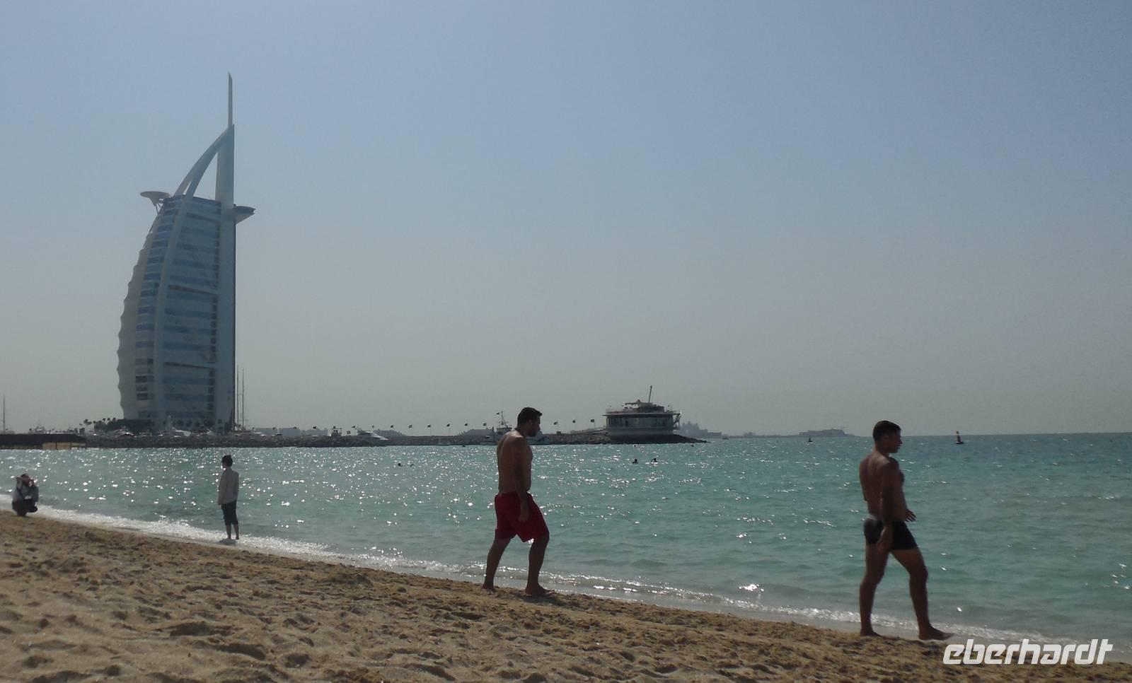 Nach einem reichhaltigen Frühstück und gestärkt durch einen guten Kaffee, begannen wir um 10 Uhr unsere heutige Stadtrundfahrt in das modernes Dubai. Schon heute erwartet uns bereits der erste Höhepunkte unserer Reise. Erste Stopp war die Jumeirah Moschee, die in nur einem Jahr, 1978, gebaut wurde. Weiter fuhren wir zu dem Strand, an welchem sich das Burj al Arab Hotel befindet. Dort konnten wir zum ersten Mal mit den Füßen die Wassertemperatur im Persisch-Arabischen Golf testen und Muscheln sammeln. Anja erzählte uns im Bus, wie der Scheich Rashid bin Said Al Maktum Dubai in den letzten 20 Jahren total verändert und seine Träume verwirklicht hatte. Dabei merkten wir, dass wir uns in einem Land des „Sehens und Gesehen werden" befanden, wo sich alles am Wohlstand orientiert.