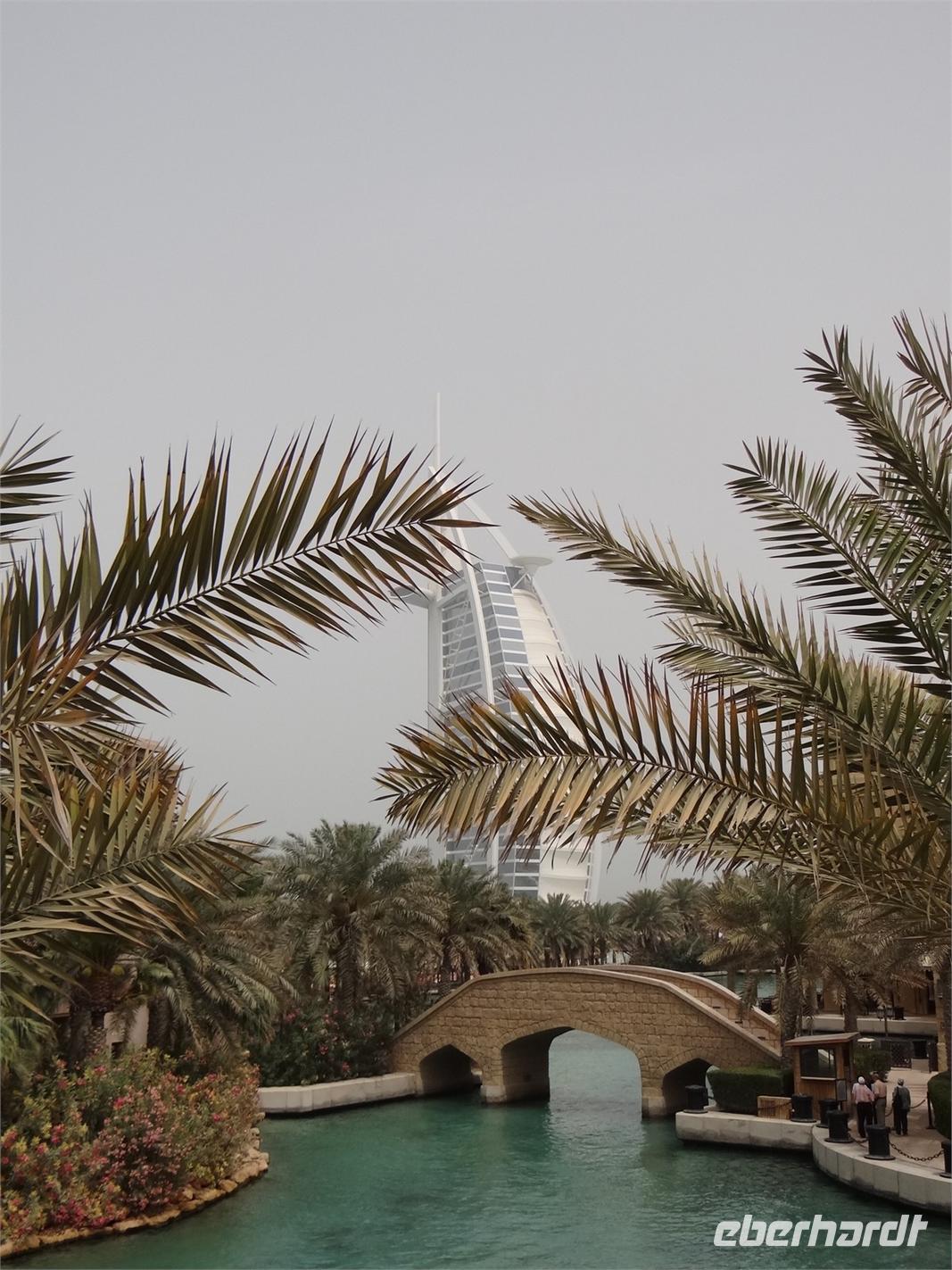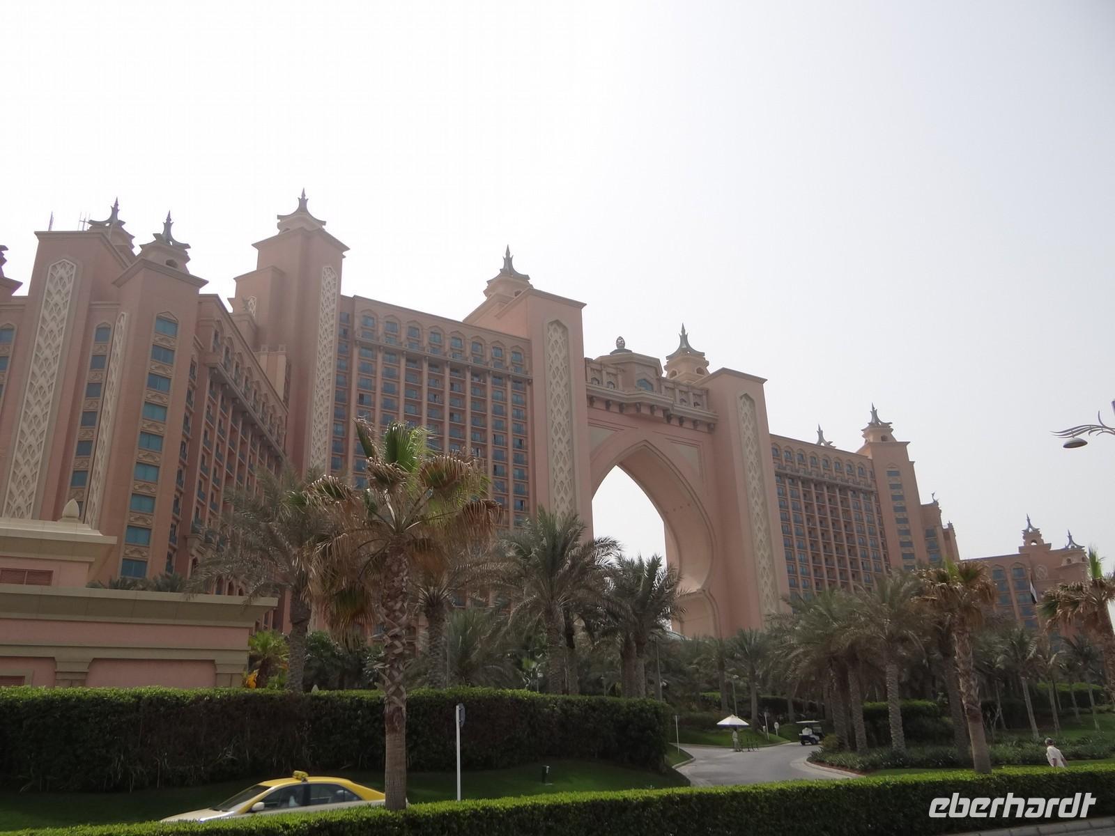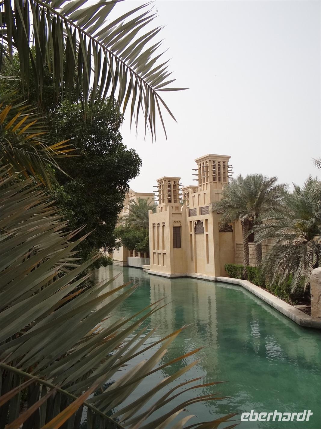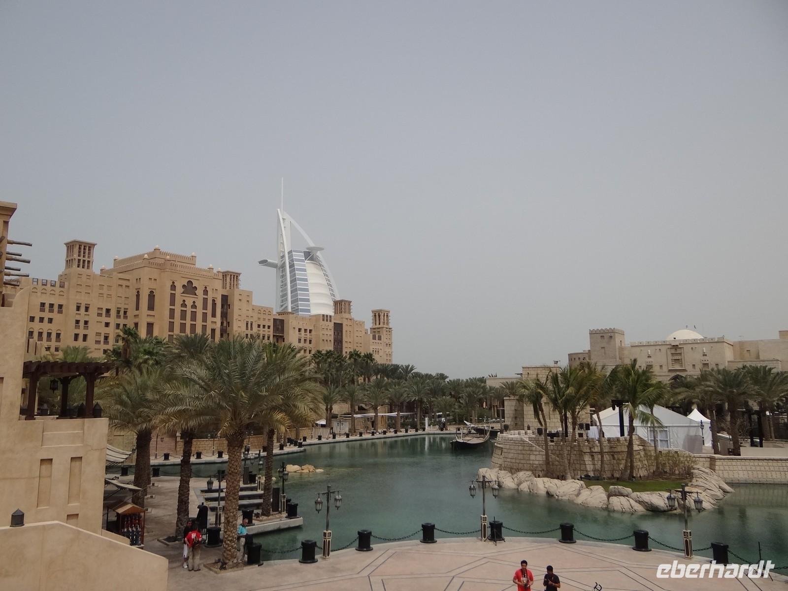 Danach fahren wir zur Palmeninsel oder „The Palm Jumeirah“, wo sich das Hotel Atlantis befindet. Die Insel erstreckt sich 4,5 km ins Meer und wir fahren durch einen Tunnel, um in der Nähe vom Hotel Atlantis wieder heraus zu kommen. Wir dürfen leider nicht auf die 16 Wedel gehen, da die Leute, die es sich leisten können, dort Häuser zu mieten (man kann nur Häuser für 99 Jahre mieten), ihre Ungestörtheit mögen. Danach fahren wir zum Madinat Jumeirah, die als das Venedig von Dubai bekannt ist. Die Madinat ist ein wunderschöner Komplex mit einem arabischen Souk, Restaurants, Cafes sowie ein Theater. Dort haben wir auch Geld getauscht.