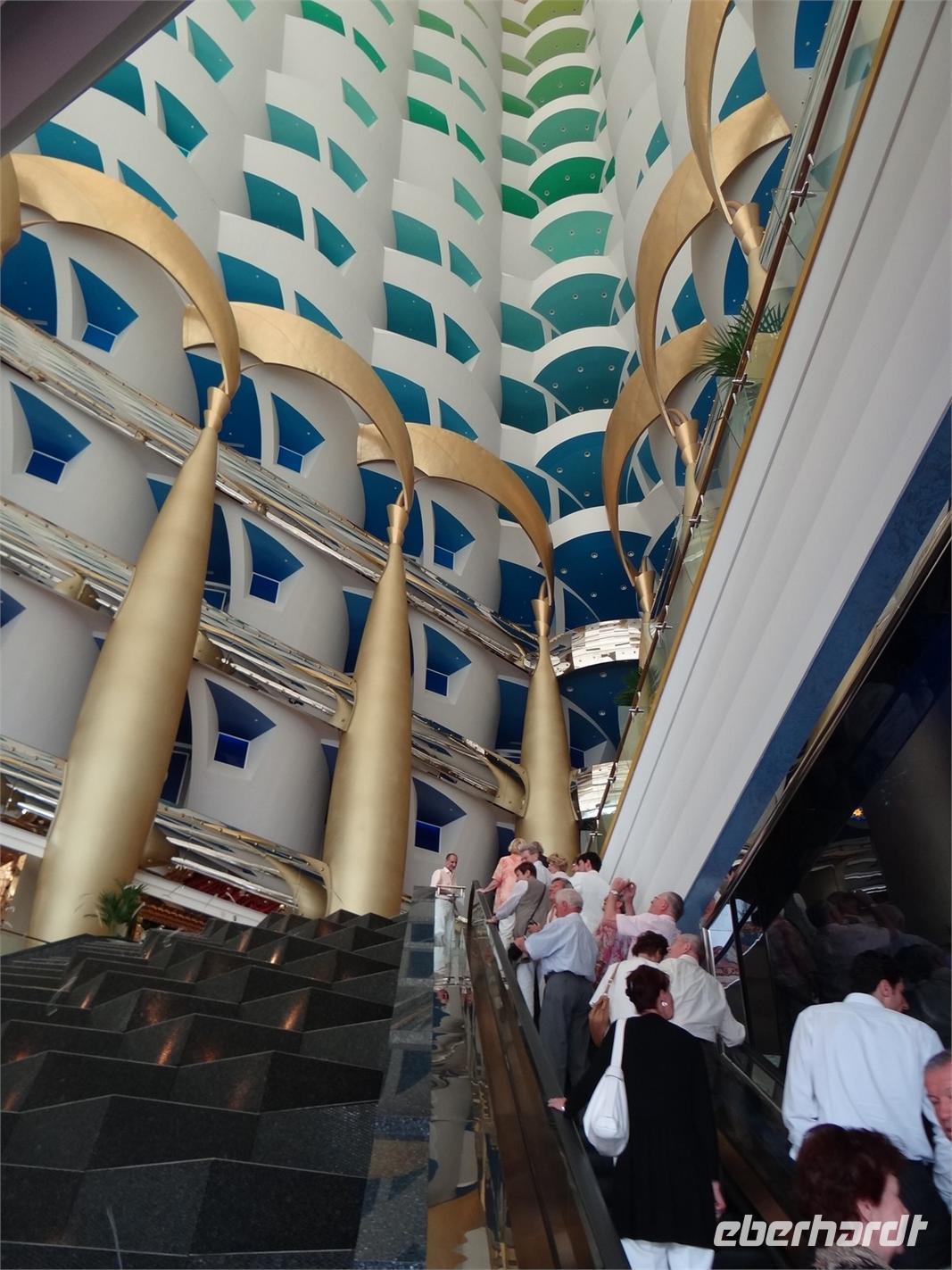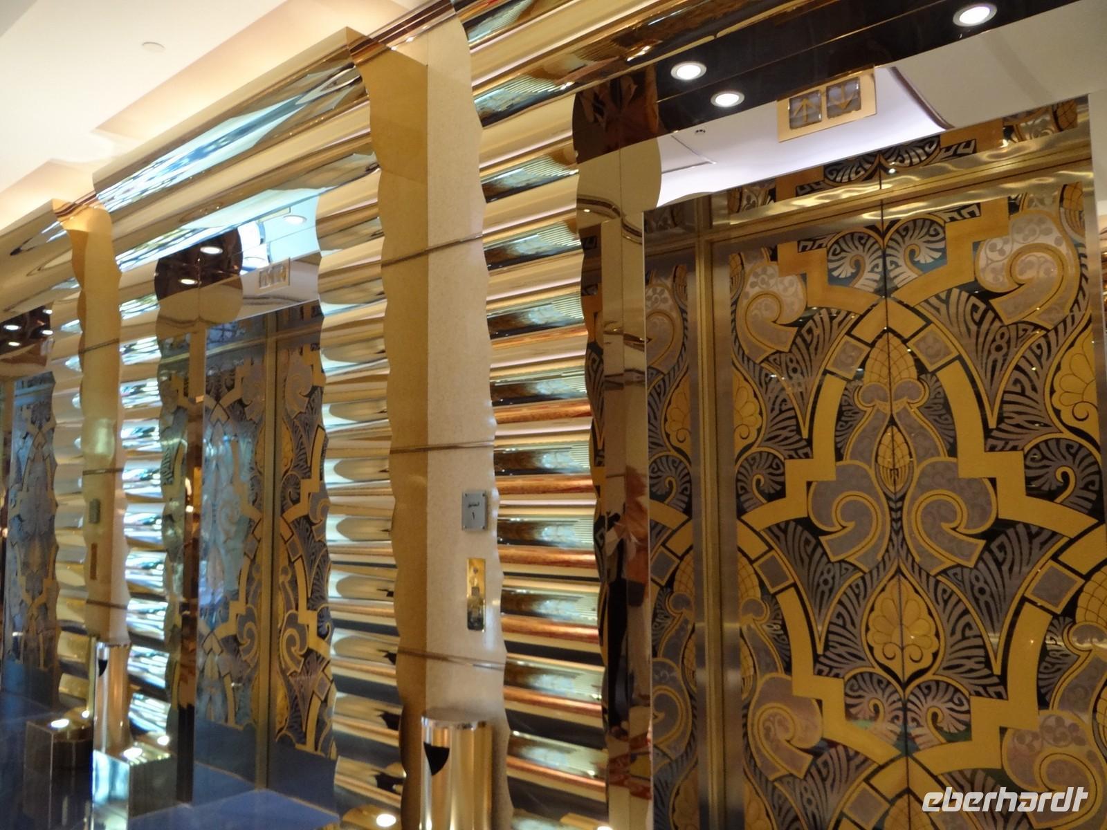 Da ein Besuch von Burj al Arab eine einmalige Erfahrung ist, wollten wir so viel wie möglich sehen. Es ist leider sehr kompliziert sich in Burj al Arab frei zu bewegen und wir hatten gehört, dass es fast unmöglich sein würde, in den Fahrstuhl zu kommen. Trotzdem sind wir fast alle in einen Fahrstuhl gegangen und wir sind stumm und ängstlich hochgefahren, da wir vermuteten, dass uns jemand herausbitten würde. Die Fahrstühle sind sehr schön und viel mehr haben wir auch nicht gesehen, da jede Etage ihre eigene Rezeption hat. Obwohl wir nicht weit gekommen sind, haben wir uns gefreut, die Fahrstühle zu nutzen und das Gefühl zu haben, dass wir trotzdem ein bisschen weiter gekommen sind als andere.