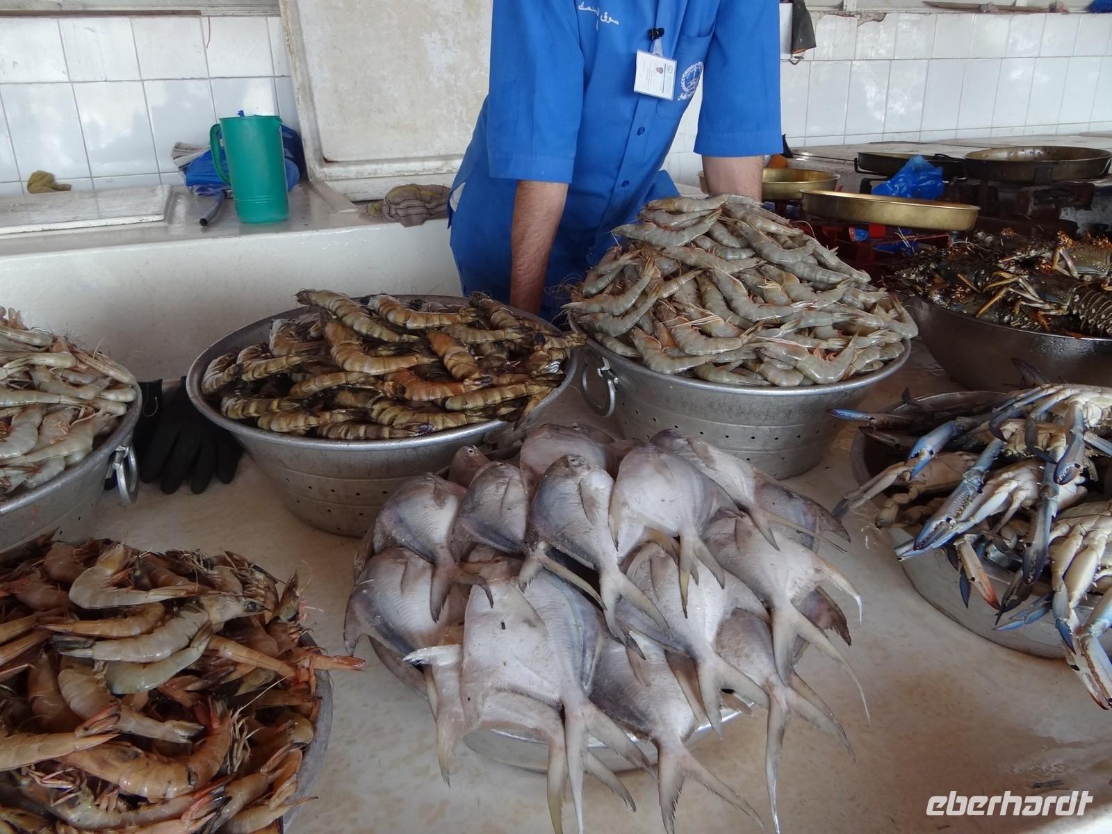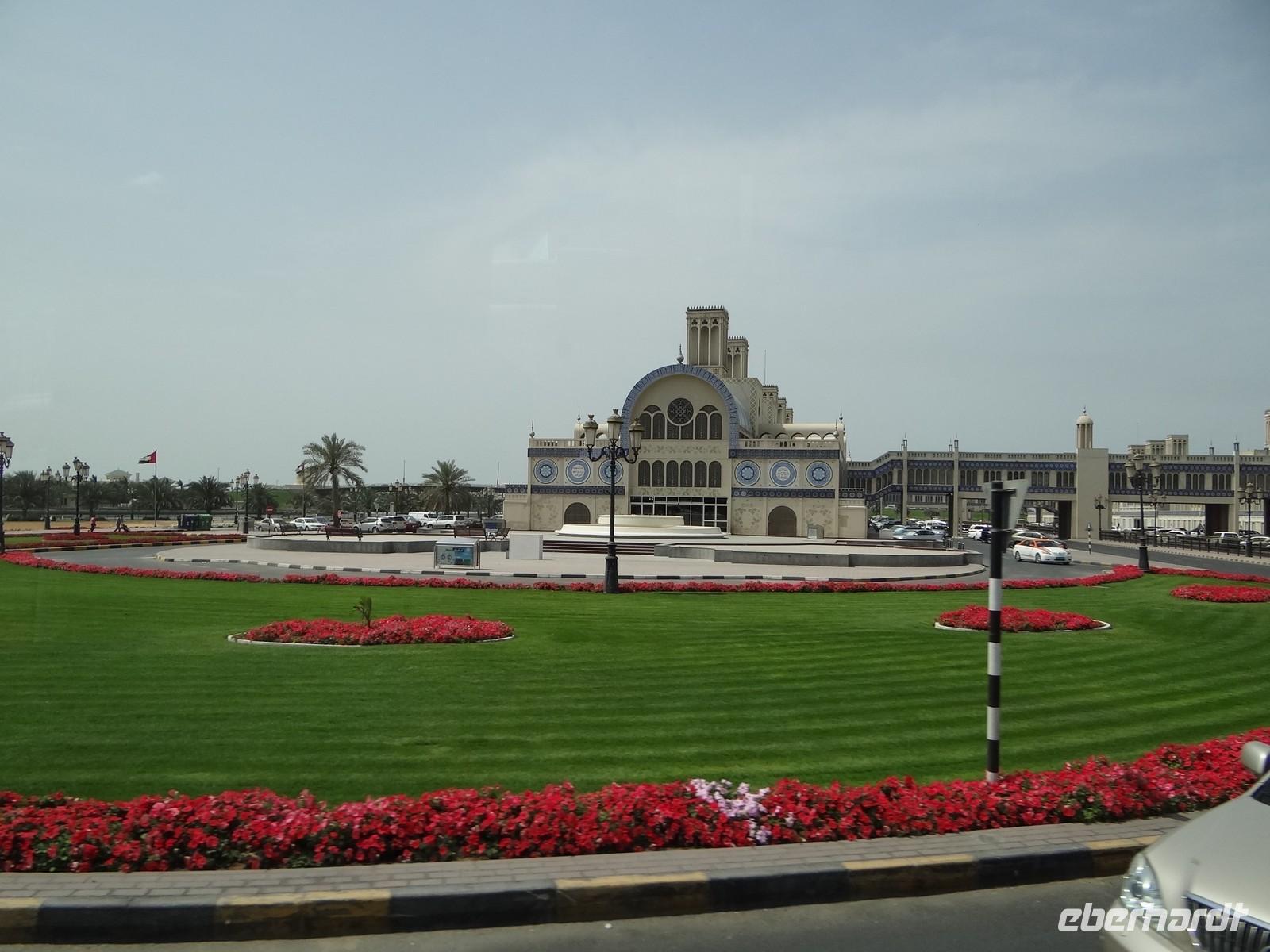 Erst besuchen wir die riesige Anlage von Sharjah Universität: sauber und voller Garten. Hier dürfen die Studenten nicht gemeinsam die Lehrgänge besuchen. Frauen und Männer haben getrennte Gebäude. Danach fahren zu verschiedenen Märkten, die sehr naturgetreu das ruhiges Flair von Sharjah zeigen: weit weg von Touristen und vom „Massenkonsum“ Dubais. Die Gemüse- und Fischmärkte sind farbig und die Verkäufer lassen uns gern die Produkte kosten (es geht natürlich einfacher mit Gemüse als mit Fisch). Nach den Märkten laufen wir zum Blauen Souk oder Souk Al-Markazi, das meistfotografierte Bauwerk des Emirates. Das Gebäude hat ein Belle-Epoque Flair, aber es ist viel schöner von draußen als von innen.