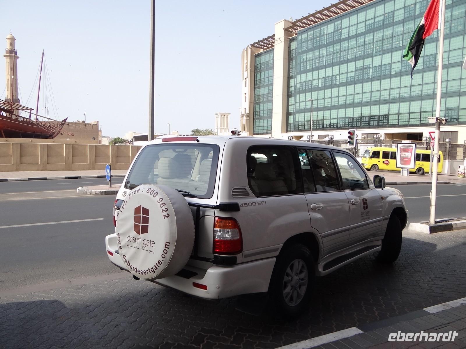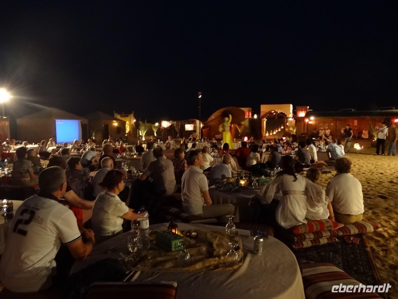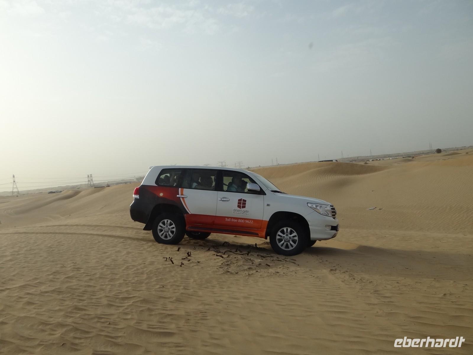 Nach dem Ausflug nach Sharjah sind wir kurz zurück zum Hotel gekehrt, um unsere Kleidungen zu wechseln und uns für die Wüstensafari vorzubereiten. Um 15.30 Uhr treffen wir uns alle vor dem Hotel und warten auf unsere luxuriösen Jeeps. Einer nach dem anderen starten die Jeeps Richtung Wüste. Eine kleine Stunde, bis wir die Wüste erreichen und unsere richtige Safari anfangen. Die Fahrer passen wirklich auf, dass die Gäste sich nicht schlecht fühlen werden und, dass alle eine wunderschöne Erfahrung haben. Die Wüsten sind bildhübsch und obwohl der Sonnenuntergang nicht sagenhaft war, war es ein sehr gutes Gefühl, in den Wüsten Dubais zu sein. Im Camp erwarten uns Tee, Kaffee, Falafel, Barbecue und Buffet sowie Entertainment durch einen Derviche-Tänzer und eine Bauchtänzerin. Danach sind wir zurück zum Hotel gefahren und glücklicherweise haben wir die Straße genutzt, da unsere vollen Mägen die Wüsten vielleicht nicht ertragen würden.