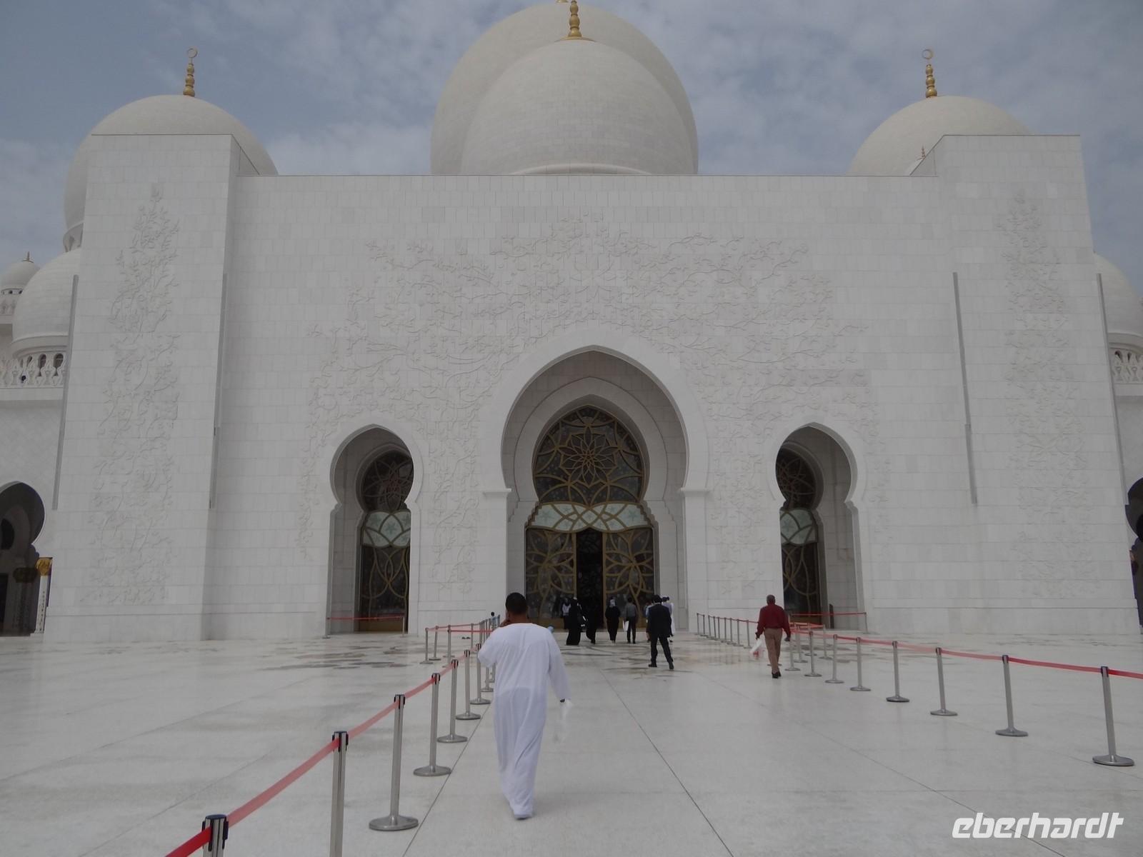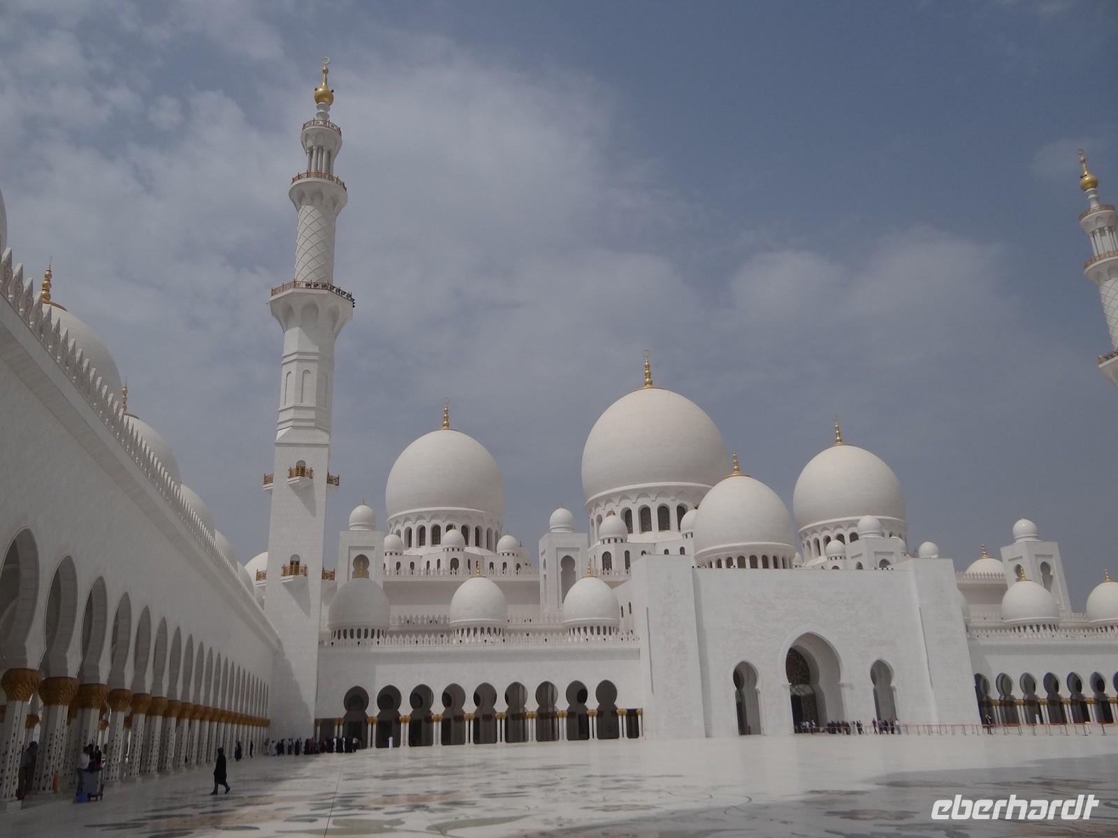 die Schaich-Zayid-Moschee, genannt nach Emir Zayid bin Sultan Al Nahyan. Scheich Zayid bin Sultan Al Nahyan war der Emir von Abu Dhabi und der erste Präsident der VAE seit 1971 bis zu seinem Tod. Er war und ist immer noch sehr beliebt und wird oft als Vater der Vereinigten Arabischen Emirate gesehen. Die Moschee bietet Platz für 40.000 Gläubige und ist mit Sicherheit ein Architektur- und Designkunstwerk, das zur Ruhe und zum Nachdenken verlockt. Die ganze Anlage hat 545 Millionen Dollar gekostet. Es ist leider unmöglich allein in der Moschee zu sein, da sie ein touristischer Platz geworden ist. Dennoch man fühlt man sich überhaupt nicht gedrungen und man kann einfach die Pracht der Moschee genießen.