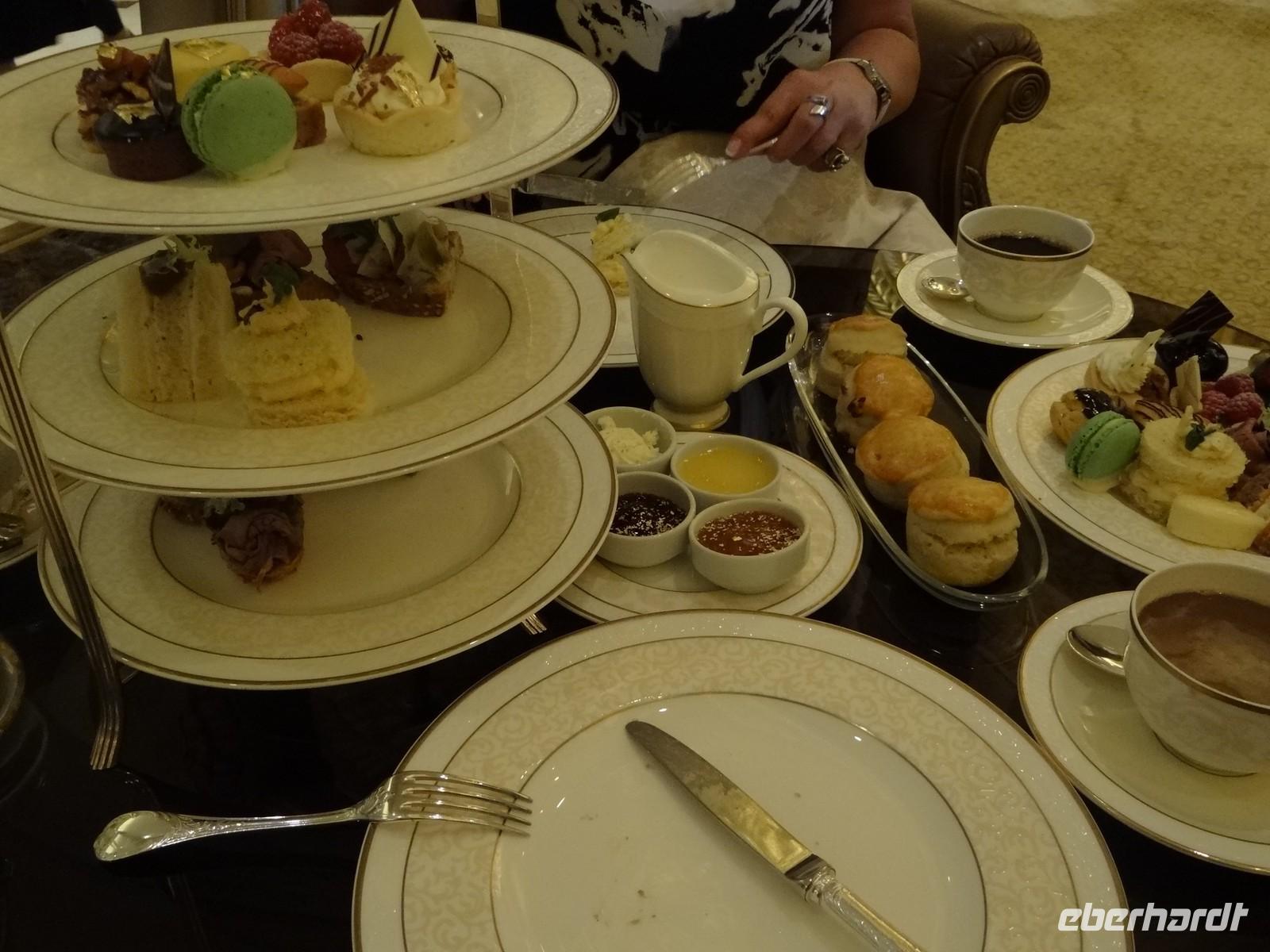 Danach haben wir die Teestunde genossen, mit frisch gebackenem Kuchen und kleinen Delikatessen sowie Scones, Marmelade, Kaffee und natürlich Tee. Wir haben uns gefreut, nicht so viel zum Mittag gegessen zu haben, sodass wir die Teestunde genießen konnten. Satt und die Augen geblendet vom goldenen Licht des Emirates Palace sind wir zurück nach Dubai, vorbei an der Formel-1-Rennstrecke auf der Yas Insel, gefahren.