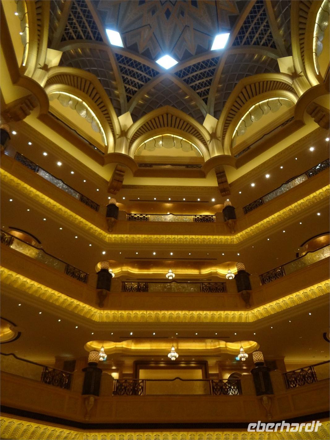Danach sind wir zum Heritage Village gefahren, wo man einen wunderbaren Blick auf die Abu Dhabi Skyline hat und anschließend haben wir eine Mittagspause in der Marina Mall gemacht. Aber nicht zu viel essen, da uns gleich eine Teestunde im Emirates Palace erwartet. Emirates Palace ist eines der luxuriösesten Hotels der Welt, war es doch eigentlich als Palast gedacht, um die Regierungschefs und Scheiche aller arabischen Emirate zu beherbergen. Leider ist Scheich Zayid zu früh gestorben, um den Palast komplett zu sehen und es wurde dann entschieden, den Palast als Hotel einzurichten. Jetzt befindet sich das Emirates Palace Hotel unter der Leitung der Kempinski-Hotelkette. Bevor unsere Teestunde in Le Café serviert wird, besuchen wir eine Ausstellung im Hotel, welche den Zweck hat, die Kulturinsel Saadiyat darzustellen.