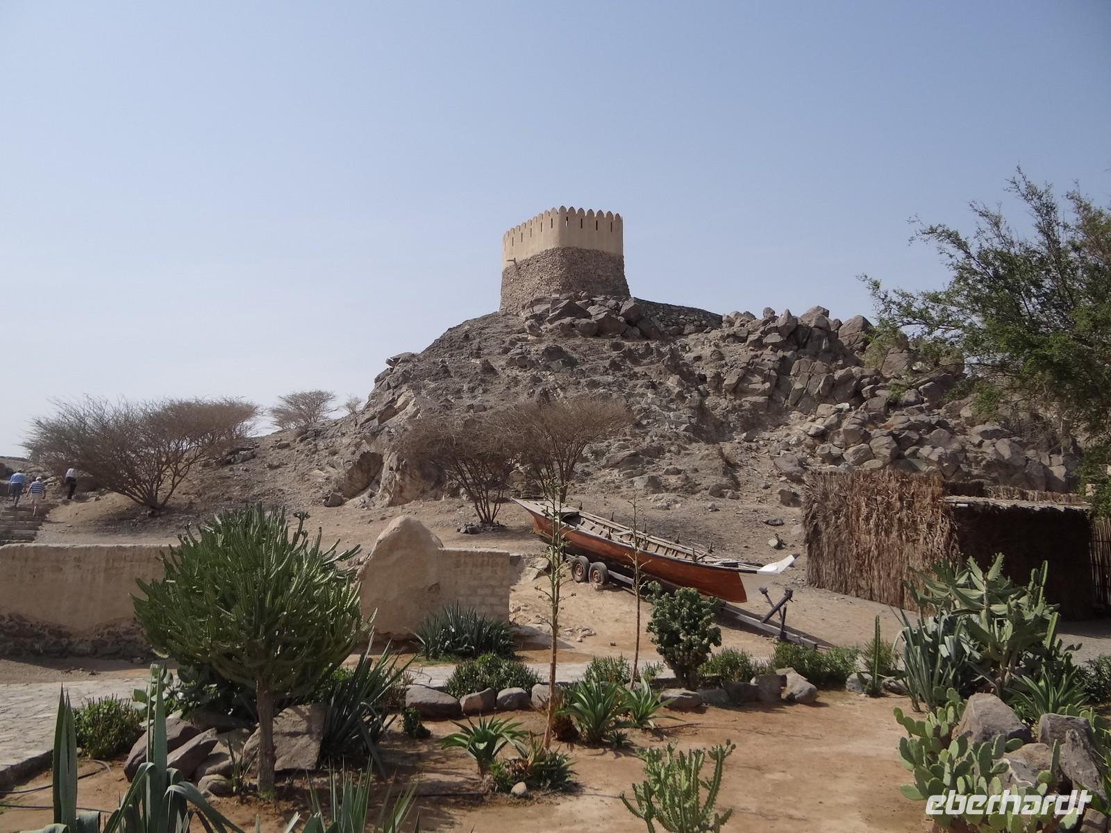 Wir besuchen einen Kamelmarkt in der Masoudi Street, welcher ein großes Angebot hat und wo sich Menschen aller Nachbarländern treffen, um ihre Kamele an die Einheimischen zu verkaufen. Diese Kamele sind keine Renntiere, werden aber als Fleisch- und Milchlieferanten verkauft. Danach fahren wir zum Al Ain National Museum, das sich neben der Al Ain Oase befindet. Die Oase wird immer noch als private Gartenanlage benutzt und Tarek zeigt uns, wie man auf einen Bananenbaum hochklettern kann (aber nicht ganz hoch). In einem neuen Gebäude neben dem Fort Al-Sharki befindet sich das Al Ain National Museum, welches 1971 eröffnet wurde. Es ist mit verschiedenen Sammlungen ausgestattet und bietet einen interessanten Blick auf die Geschichte des arabischen Emirats.
