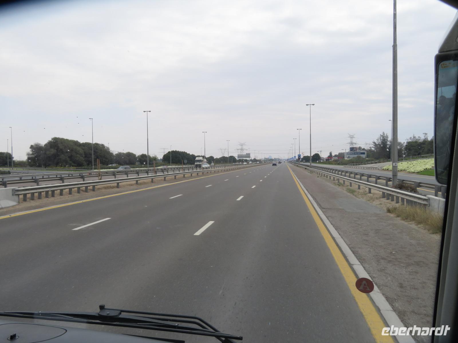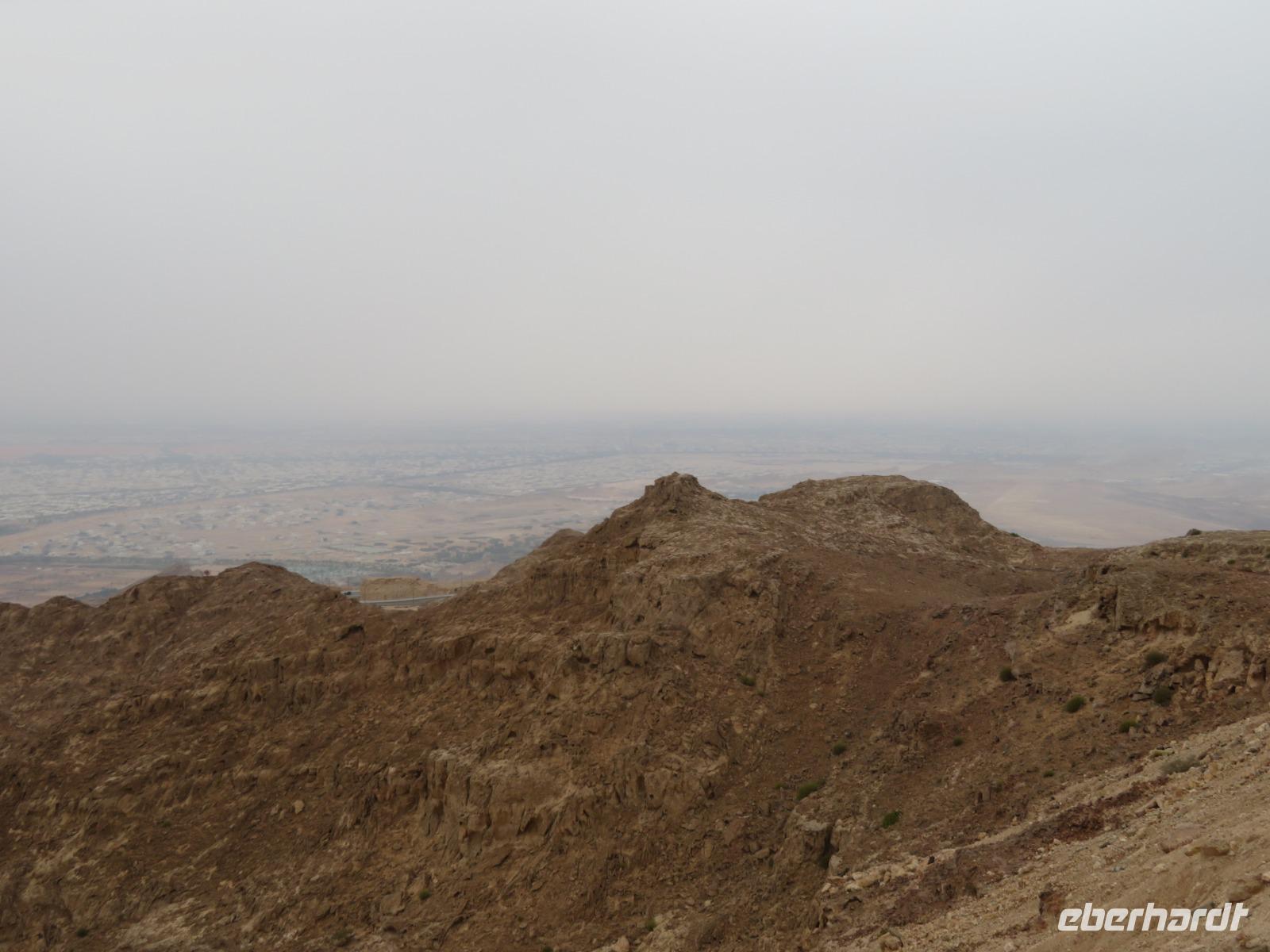 Der letzte Tag unserer Reise ist angebrochen. Gegen Mittag fahren wir los und halten am Stadtpalast von Scheich Mohammed, um diesen von weiten zu betrachten. Danach fahren wir auf der Autobahn in Richtung Oasenstadt Al Ain. Aber auch hier stoppen wir noch einmal an einer Kamel-Rennbahn. Leider ohne Kamele aber trotzdem ist diese Anlage beeindruckend. Nach rund zwei Stunden Fahrt erreichen wir Al Ain und durchqueren die Stadt bis zum National- und Palastmuseum. Im Garten des Palastes wehen die Palmen im leichten Wind und Anja nimmt uns mit auf die Führung durch die Anlage, in der einst Scheich Zayed lebte. Wir sehen sein altes Schlafzimmer aber u.a. auch das Zimmer seiner Mutter und den Saal, in dem er einst auf die Queen traf. Anschließend bringt uns Sha in Richtung Jebel Hafeet, der höchsten Erhebung der Vereinigten Arabischen Emirate. Da uns das Wetter heute leider einen Strich durch die Rechnung macht, sind Anja und ich froh, unser Abendessen heute doch nicht unter freien Himmel stattinden wird. Sha bringt uns bis zum Parkplatz wo wir dann in einen anderen, kleineren Bus einsteigen, der aus auf 915 Metern Höhe zum Mercure Hotel Jebel Hafeet Al Ain bringt. Von der Terrrasse aus bietet sich uns die Möglichkeit, die untergehende Sonne zu beobachten und die Berge zu fotografieren. Zum Abschluss unserer Reise genießen wir ein typisches arabisches Abendessen im Hotelrestaurant. Anschließend bringt uns Sha zurück zu unserem Hotel in Dubai, wo wir uns noch einmal für die Rückreise in unseren Zimmern frisch machen. Anja und Sha bringen uns dann noch zum Flughafen, wo wir uns alle voneinander verabschieden.