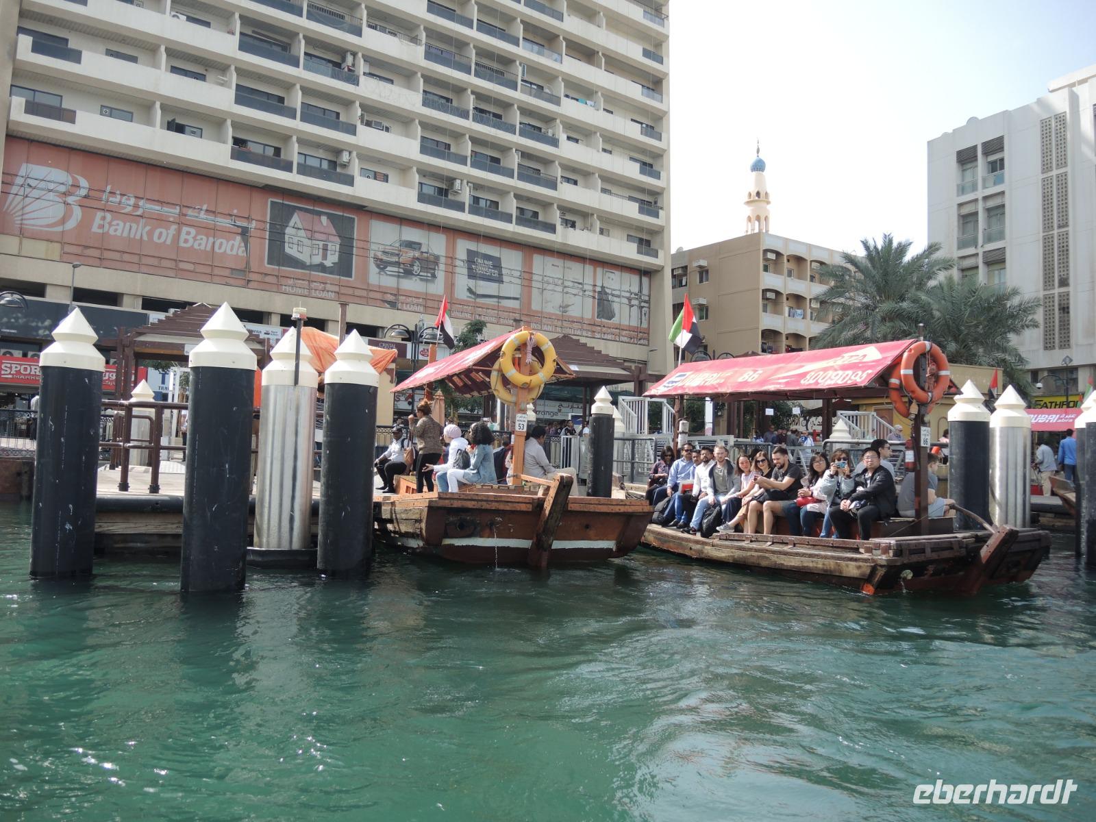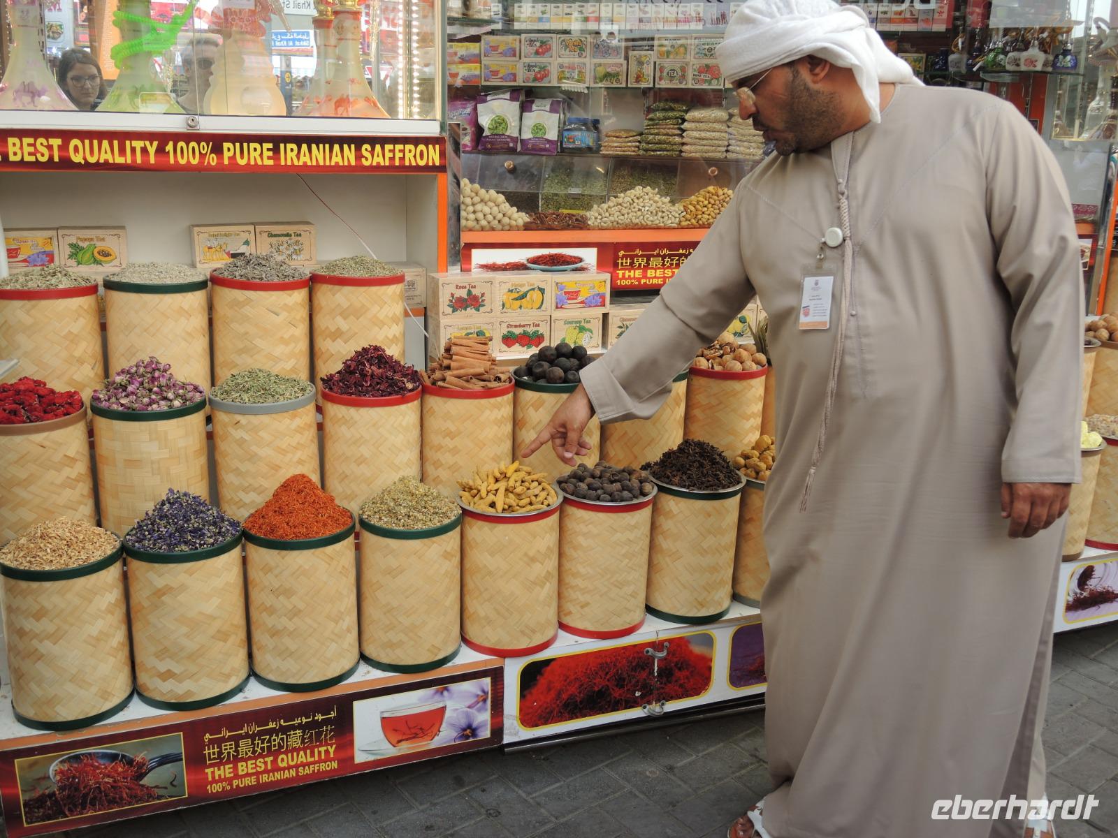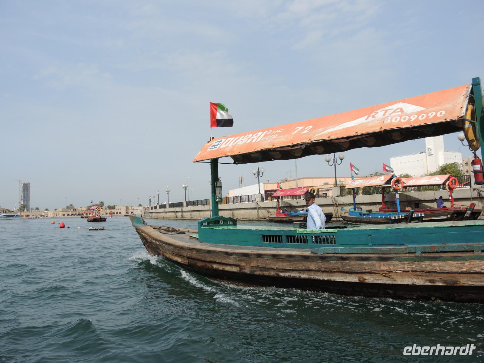 Jetzt geht es über den Creek mit einem traditionellen Wassertaxi, einer „Abra", auf die nördliche Seite, weiter zum Gold- und Gewürzsouk. Ibrahim erklärt uns die verschiedenen Gewürze, gibt uns Tipps und Tricks zum Handeln hier auf dem Souk, zeigt und wo wir den größten Ring der Welt finden können und zeigt uns, wo wir die besten mit Schokolade umzogenen Datteln genießen können.