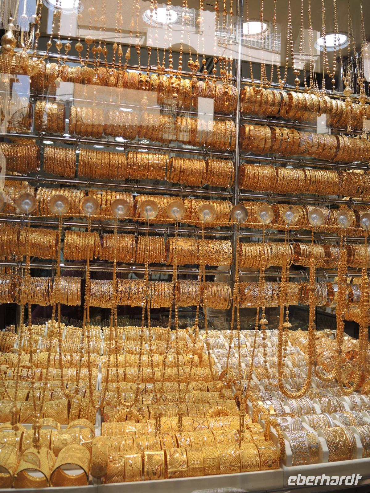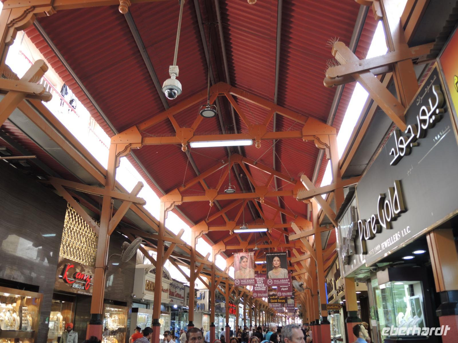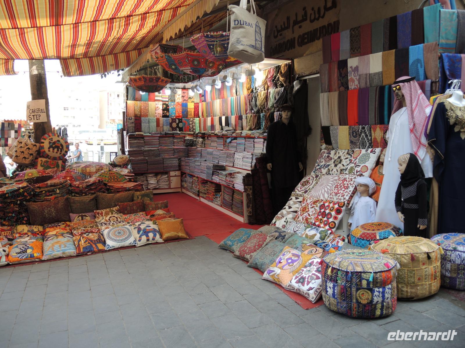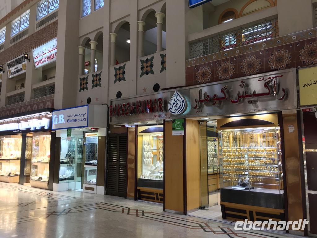 Jetzt geht es über den Creek mit einem traditionellen Wassertaxi, einer „Abra", auf die nördliche Seite, weiter zum Gold- und Gewürzsouk. Ibrahim erklärt uns die verschiedenen Gewürze, gibt uns Tipps und Tricks zum Handeln hier auf dem Souk, zeigt und wo wir den größten Ring der Welt finden können und zeigt uns, wo wir die besten mit Schokolade umzogenen Datteln genießen können.