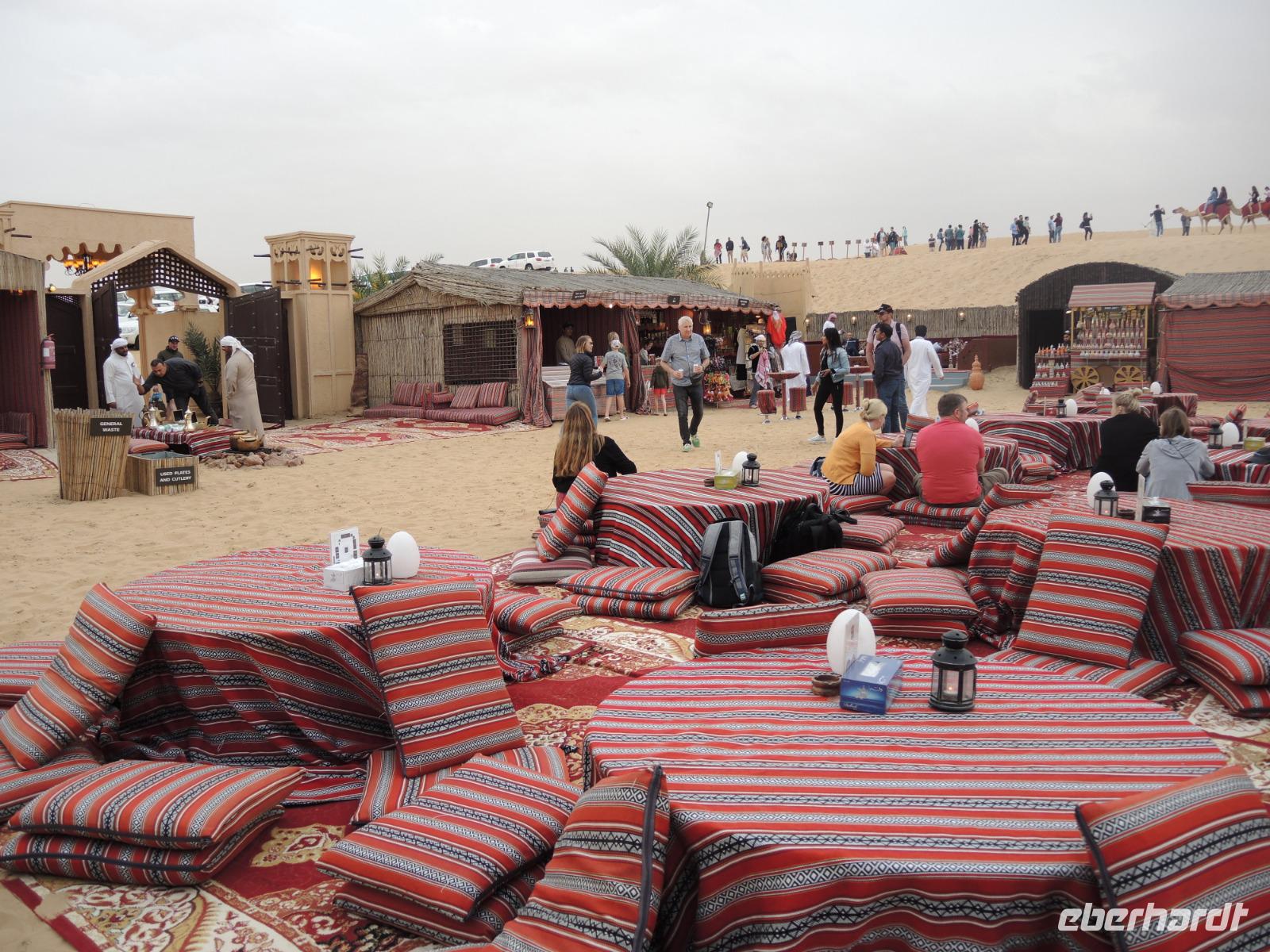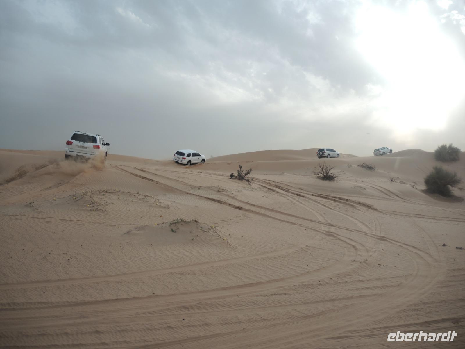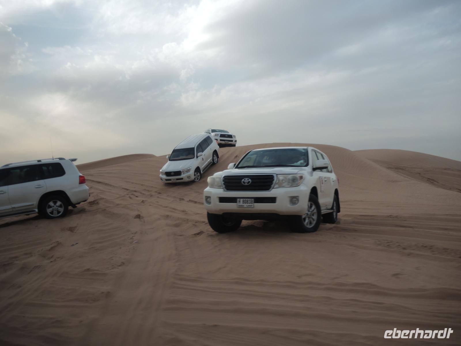 Am Nachmittag heißt es dann: Ab in die Wüste! Wir werden von zwei Jeeps abgeholt und in die Wüste zu einer aufregenden Wüstensafari gebracht. Unsere zwei Fahrer bescheren uns eine wilde, aber sichere Fahrt durch die Wüste Dubais. Sicher am Wüstencamp angekommen werden wir herzlich empfangen. Es wartet eine Falkenshow auf uns, wir können mit Quads fahren, es uns in der Shisha-Lounge gemütlich machen, Kamele reiten, unsere Hände von einer Henna-Lady verschönern lassen und die Sanddünen mit einem Board hinabrutschen. Bei einem leckeren Abendessen erhalten wir noch eine fantastische Show mit traditionellen Tänzern und Bauchtänzerinnen. Ein abenteuerlicher Tag geht zu Ende.