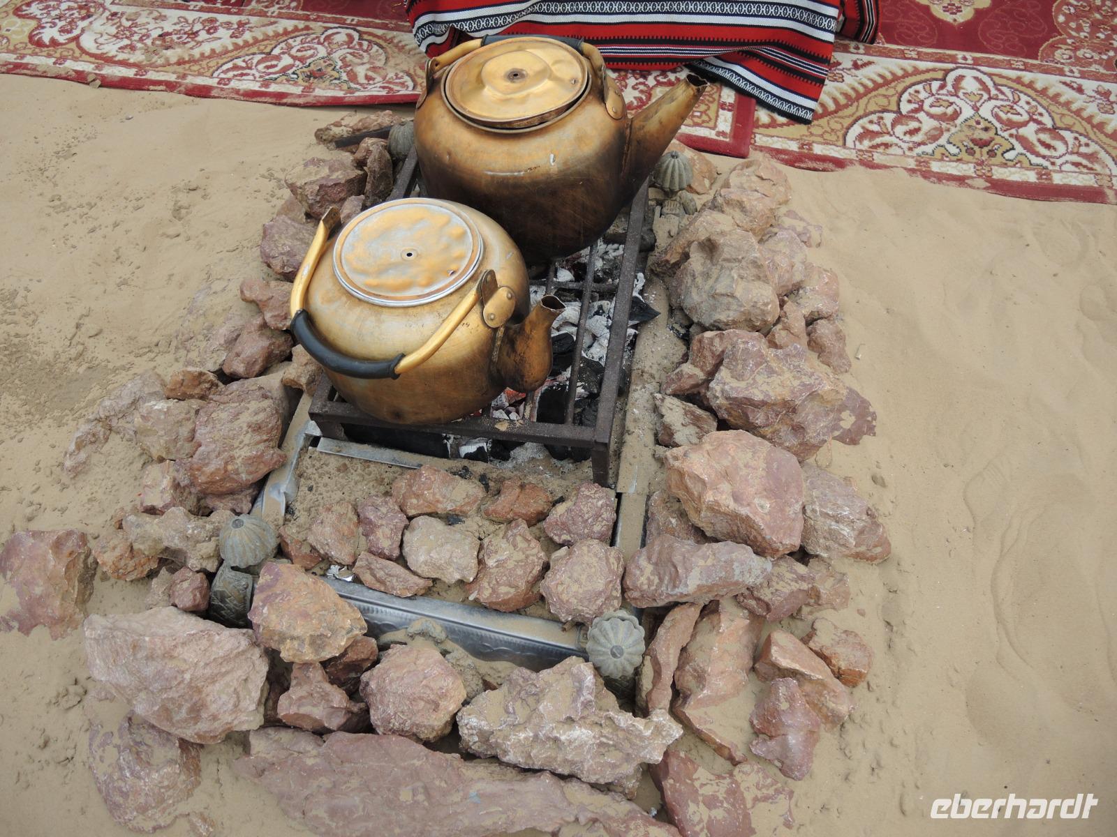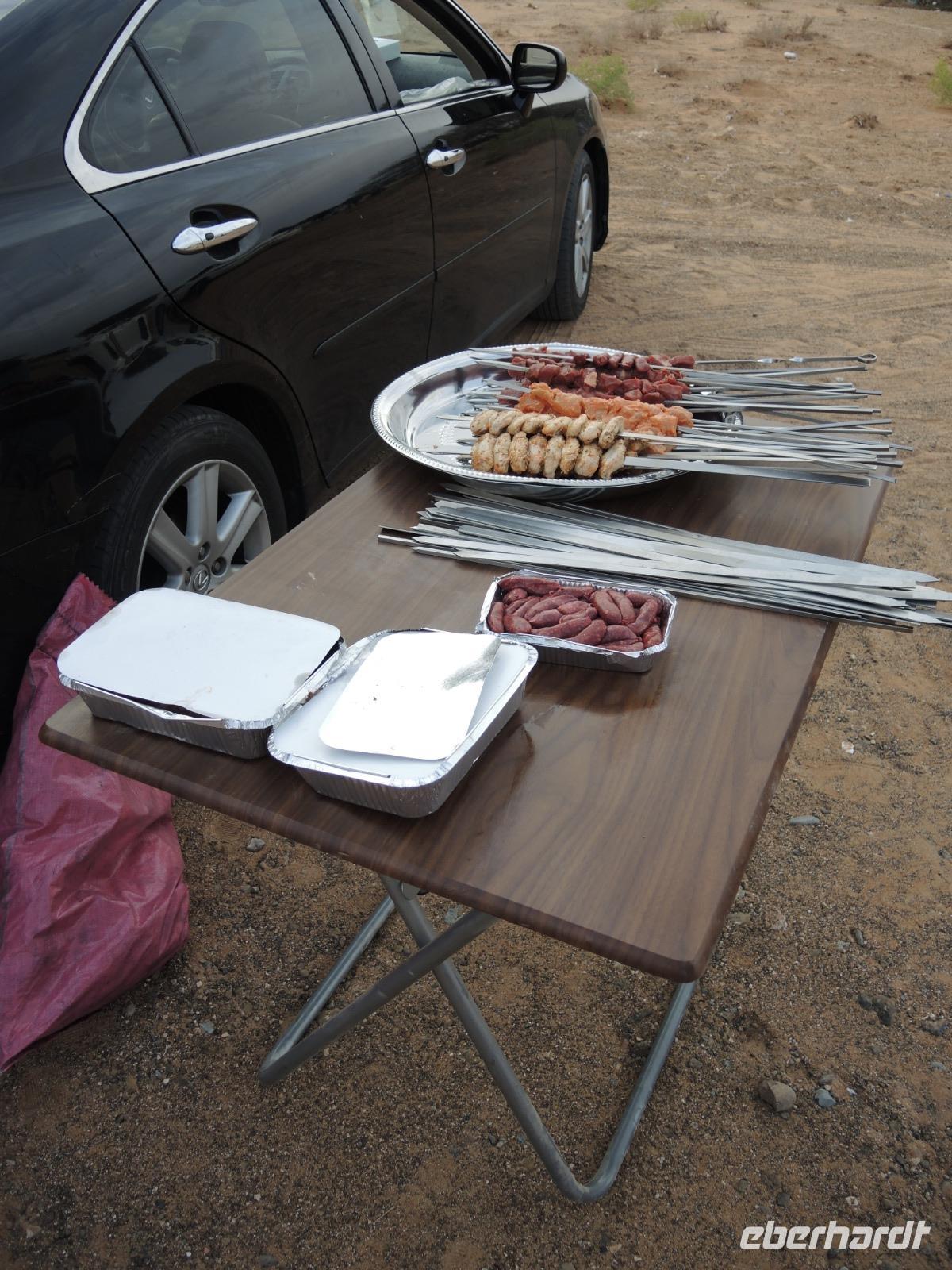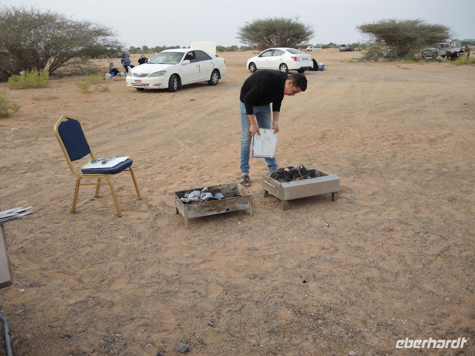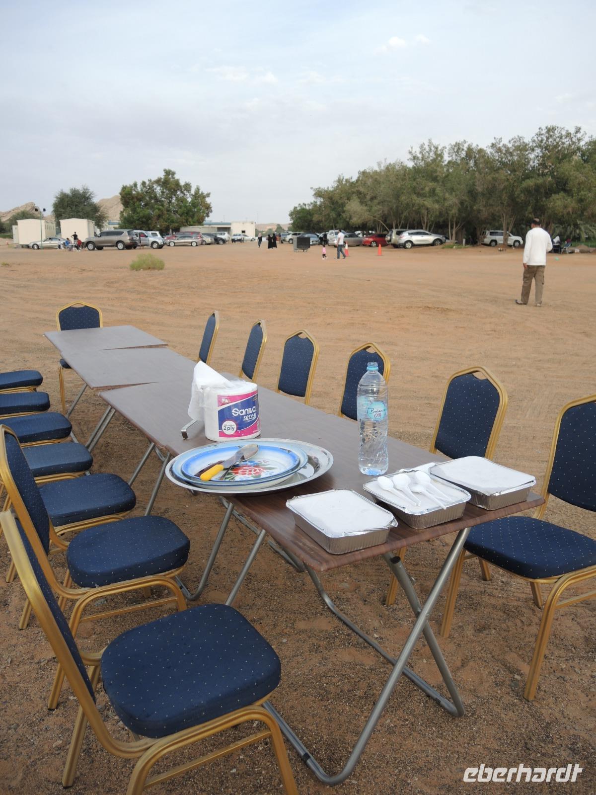 Frisch gestärkt mit Kamelmilch, Keksen und Datteln geht es nun weiter zum Jebel Hafeet. Hier haben wir von der Aussichtsplattform aus einen herrlichen Blick über das Tal, Al Ain und natürlich die gelbe, weite Wüste. Nach einem kleinen Stopp geht es nun wieder an den Fuß des Bergs, an dem wir unser selbstgegrilltes Abendessen genießen, mit Blick auf das Gebirge.