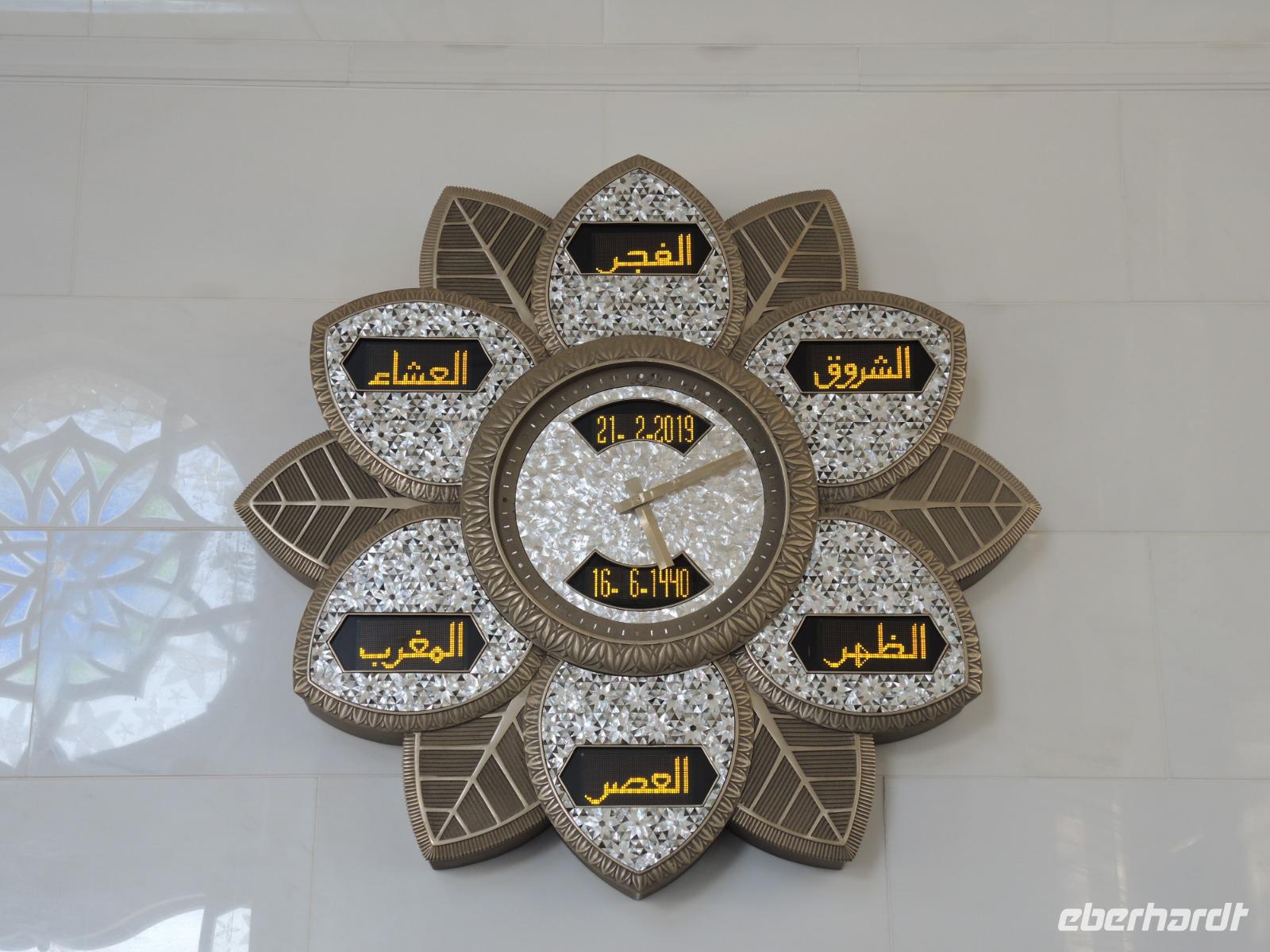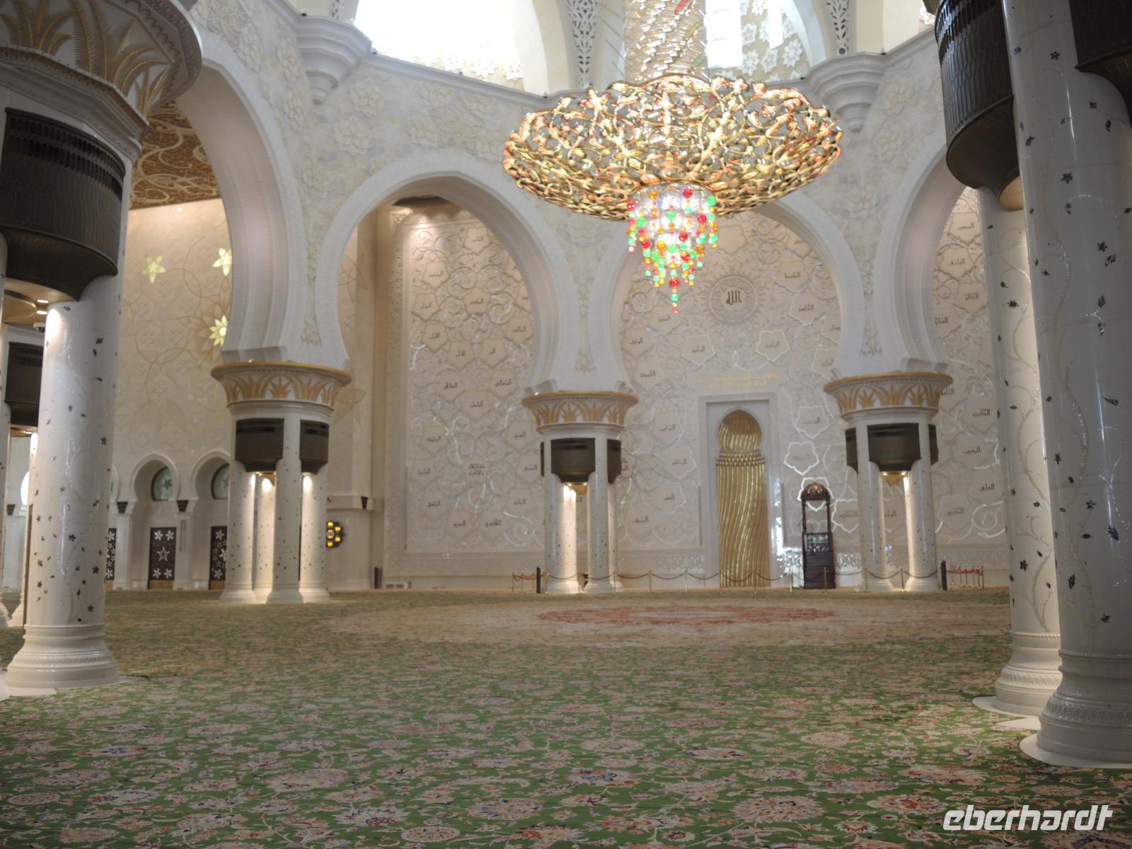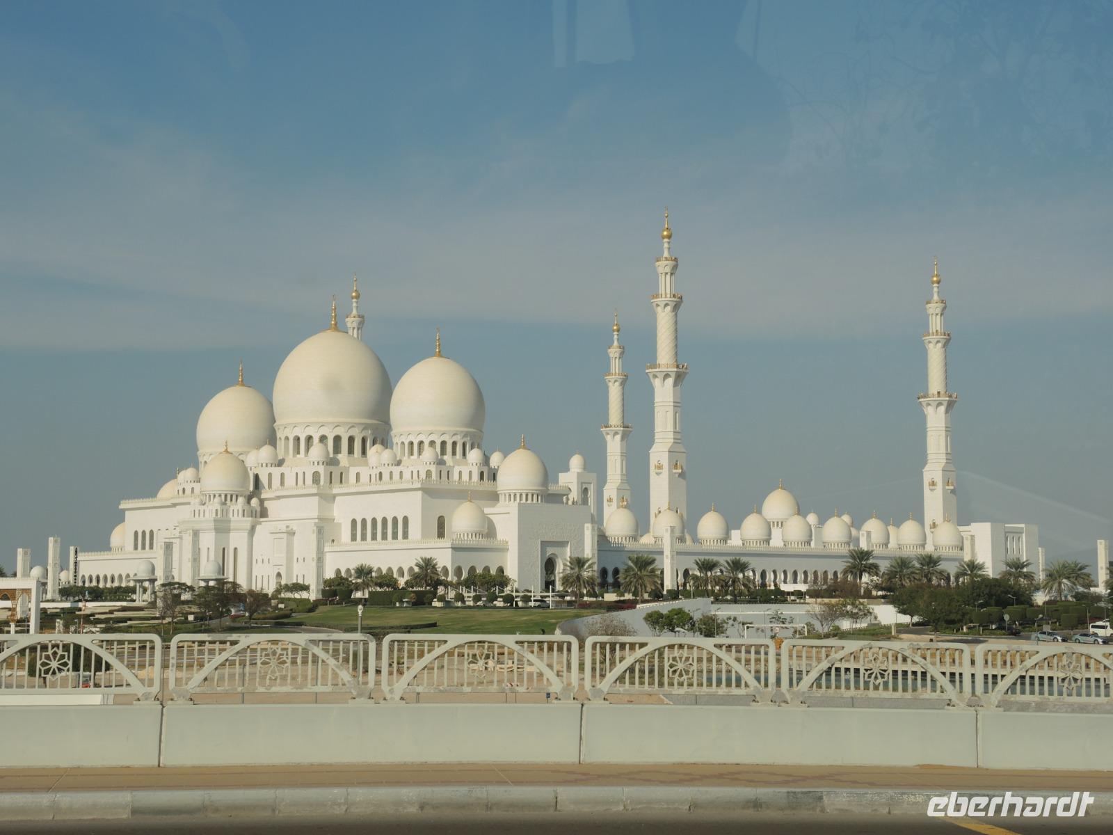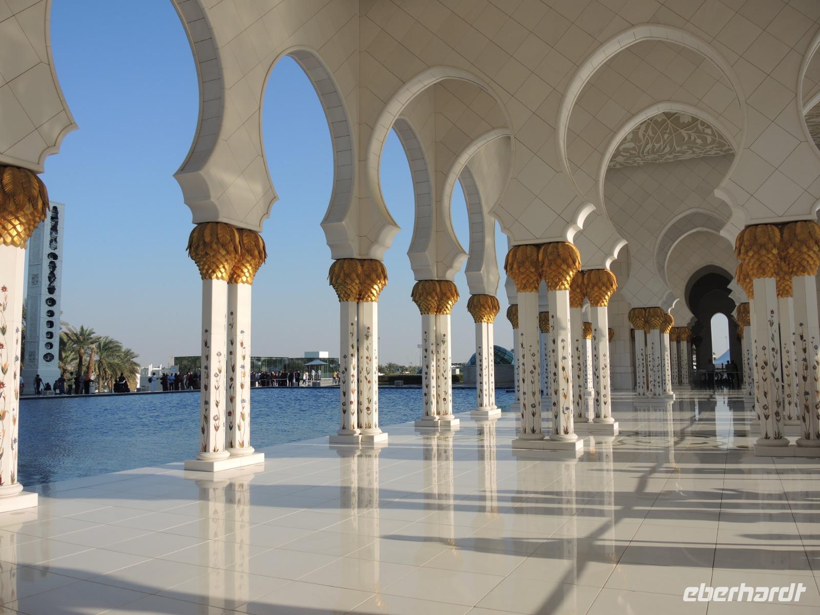 Nachdem wir auf Vettels und Hamiltons Spuren gewandert sind ging es dann weiter zum wohl bekanntesten Hotels Abu Dhabis: dem Emirates Palace. Hier kommen wir in den Genuss einer Teestunde mit vielen kleinen süßen, wie herzhaften Köstlichkeiten. Wir lassen uns hier rundum verwöhnen. Einige köstliche Kalorien später geht es dann weiter zu Abu Dhabis Highlight, der Großen Scheich Zayed Moschee. Umgeben von weißem Marmor, Blumenmosaiken, dem blau-glitzerndes Wasser, welches die Moschee umgibt und in den Säulengängen fühlt man sich wie aus 1001 Nacht. Über dem größten Teppich der Welt in der großen Gebetshalle können wir den größten Kronleuchter der Welt bestaunen - atemberaubend.