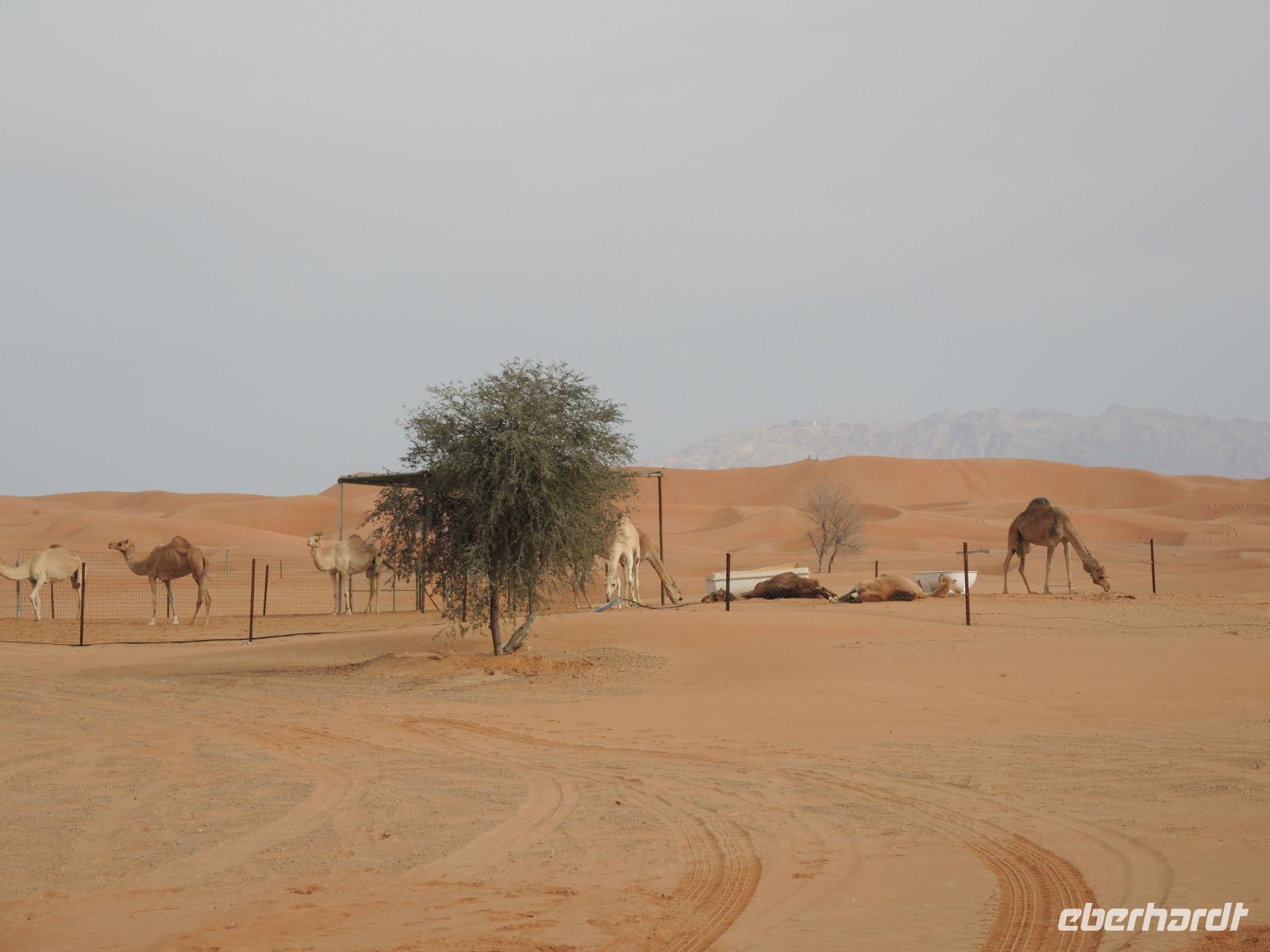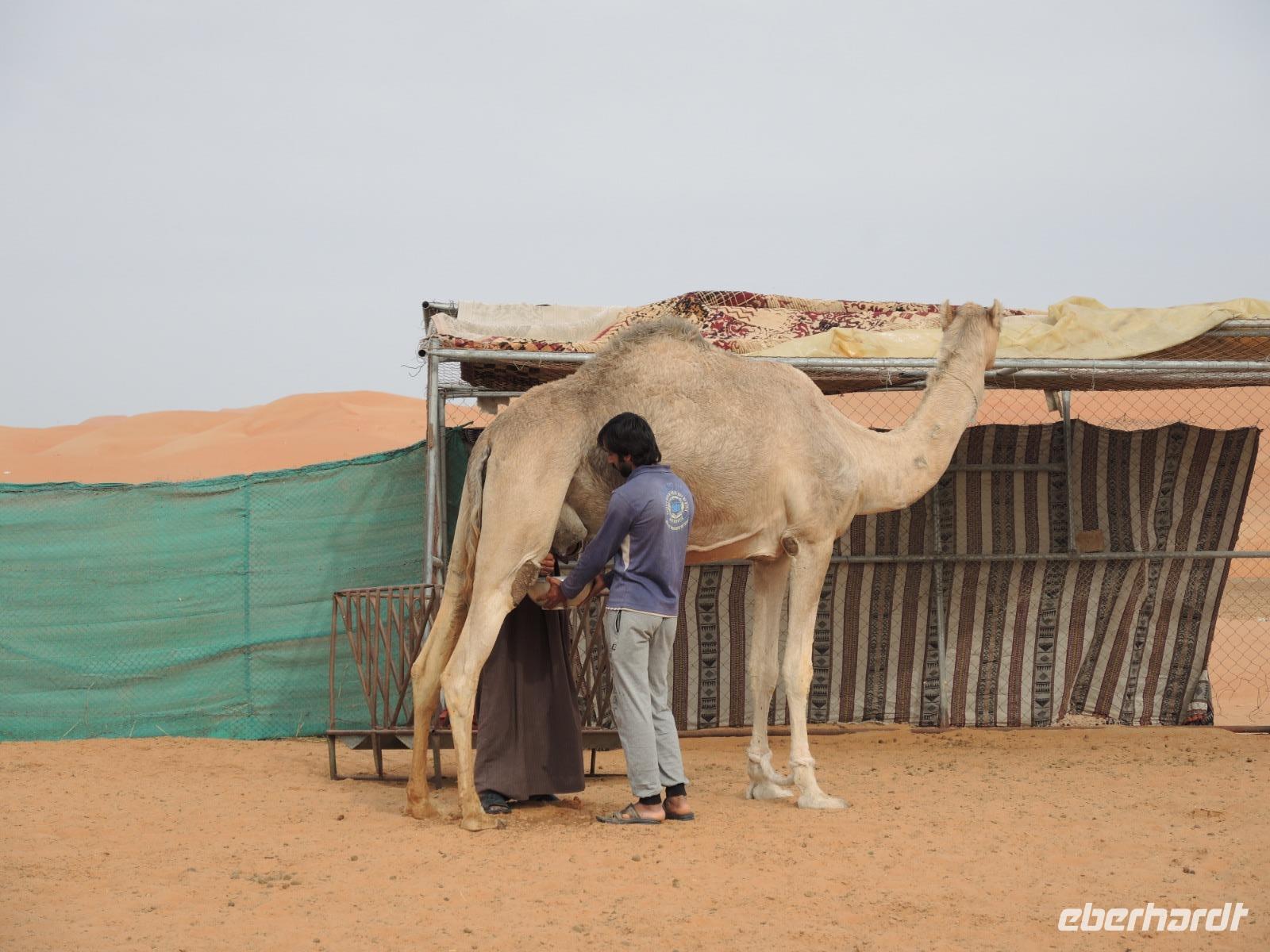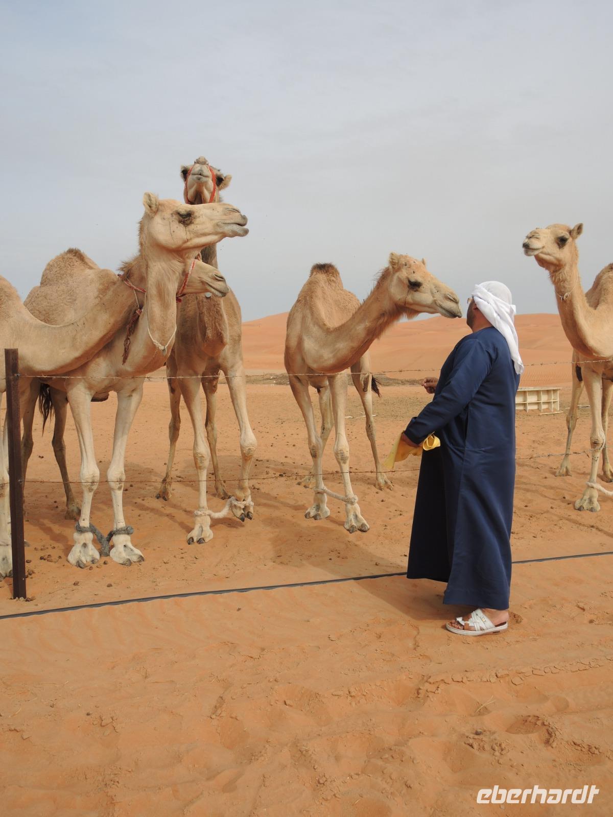 Wie wir nun bereits wissen hält unser Reiseleiter immer eine Überraschung für uns bereit und so auch jetzt. Nachdem wir uns mit Datteln gestärkt haben geht es nun weiter auf eine Kamelfarm, auf der wir herzlich mit offenen Armen empfangen wurden. Wir lernen hier die Kamele des Besitzers kennen, können diese streicheln und füttern. Ein echtes Highlight für alle unsere Reiseteilnehmer war die Verkostung frisch gemelkter Kamelmilch - überraschend lecker!
