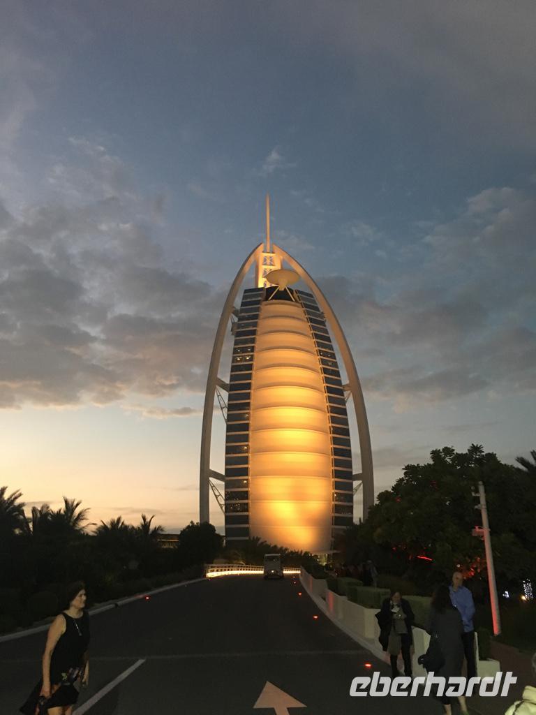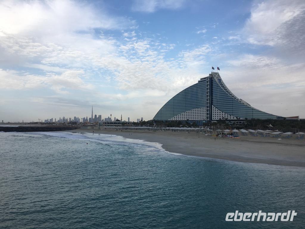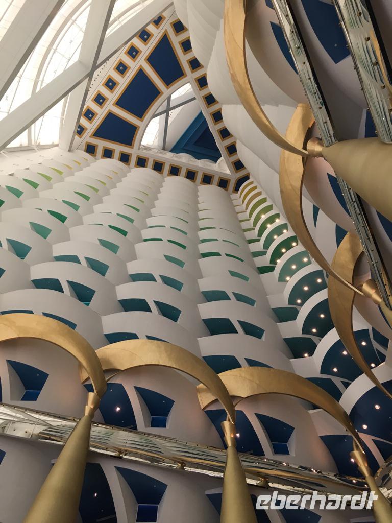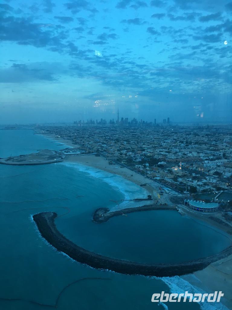 Am Nachmittag spaltet sich unsere Gruppe: Einige gehen zum Strandabschnitt „La Mer" und genießen die Mittagssonne und das kalte Nass, die zweite Hälfte unserer Eberhardt-Reisegruppe macht sich auf den Weg zur gebuchten Teestunde „with a view" in der Sky View Bar des Hotels Burj al Arab, welches wir gestern bereits von Weitem kennenlernen durften. Unsere Gäste wurden hier oben mit süßen und herzhaften Köstlichkeiten rundum verwöhnt.