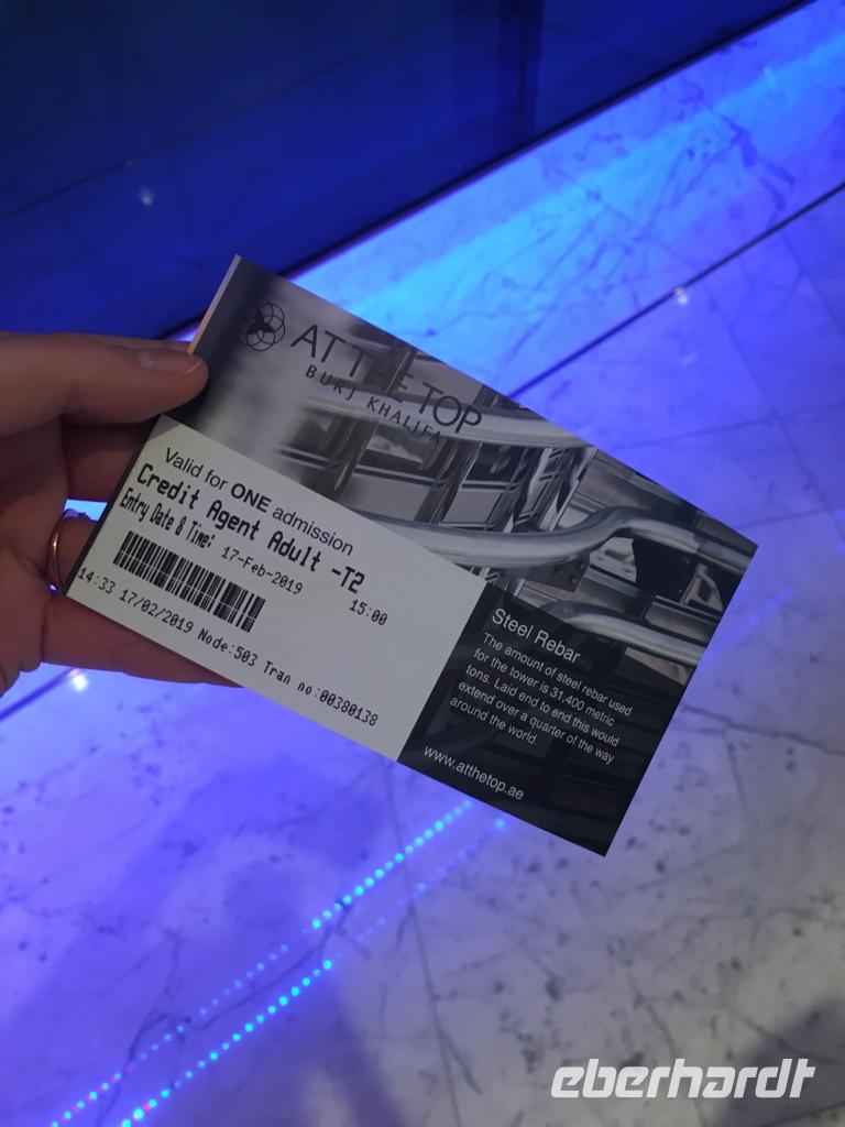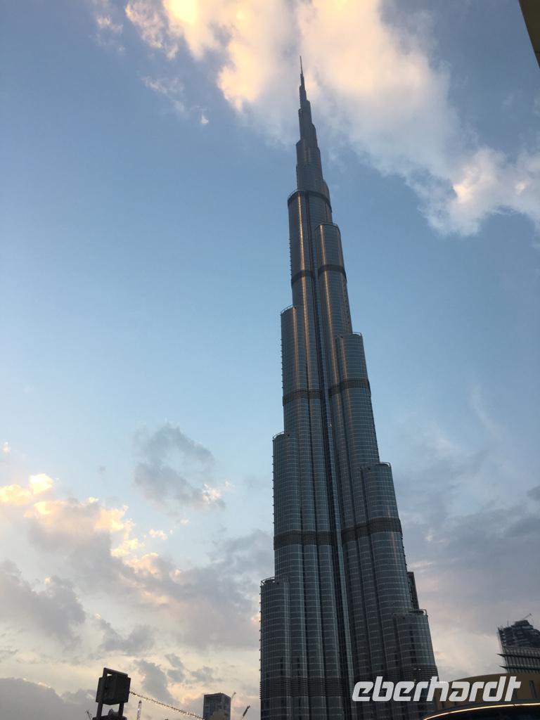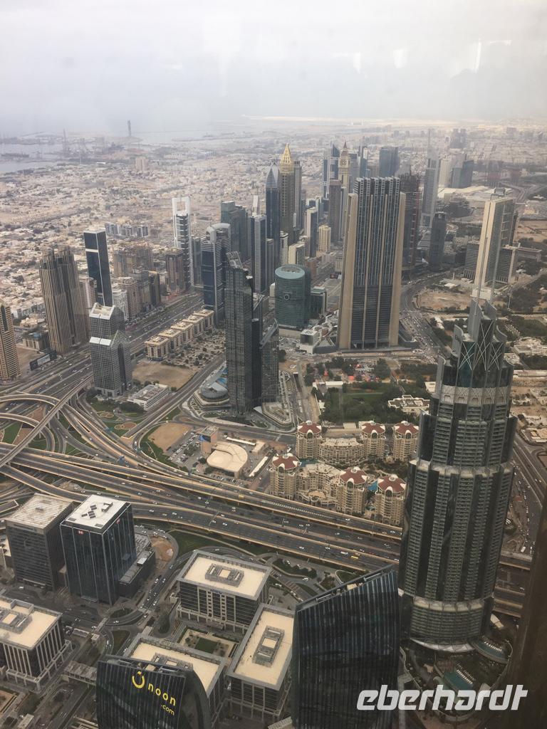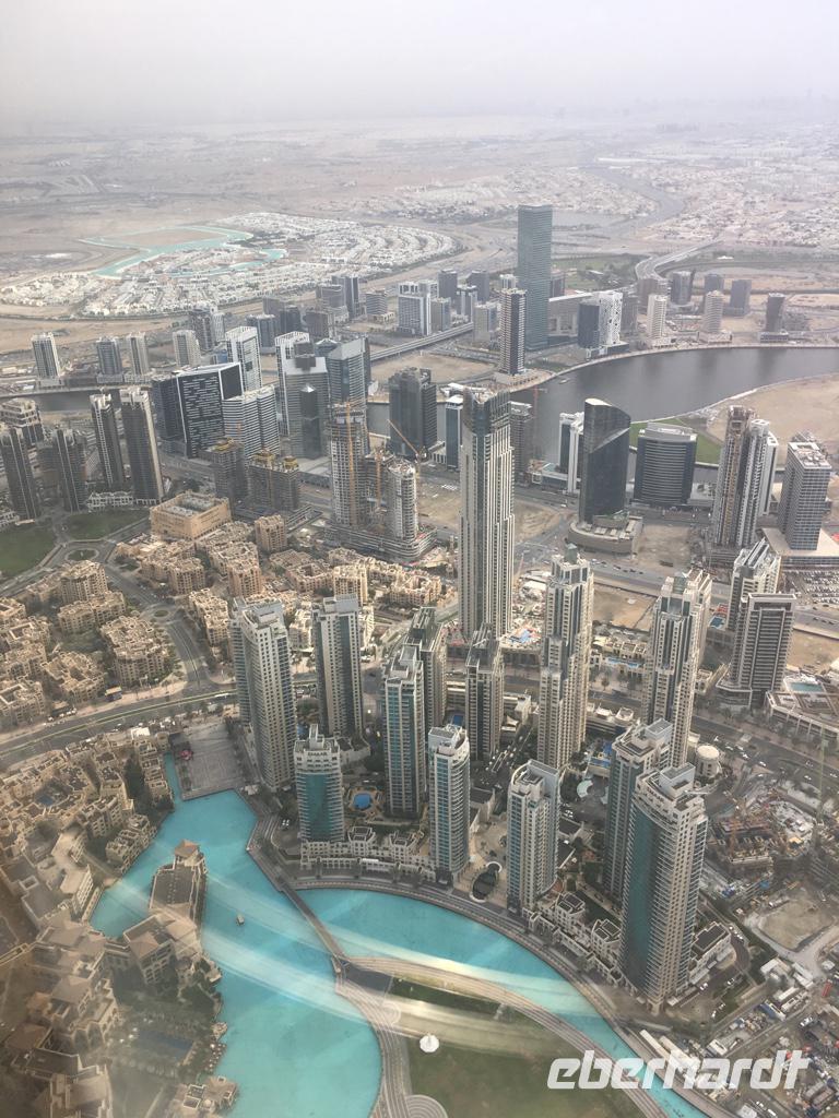 Nach etwas Freizeit in der Dubai Mall geht es hoch hinaus, auf das bisher höchste Gebäude der Welt, dem Burj Khalifa! Auf der Aussichtsplattform, in der 124. Etage auf 456 m Höhe wirken die anderen Wolkenkratzer, die wir am Morgen noch bestaunt hatten, doch recht klein.