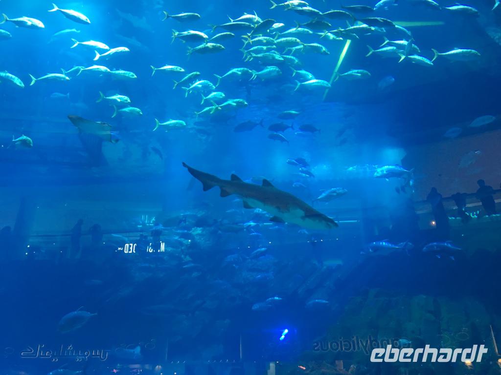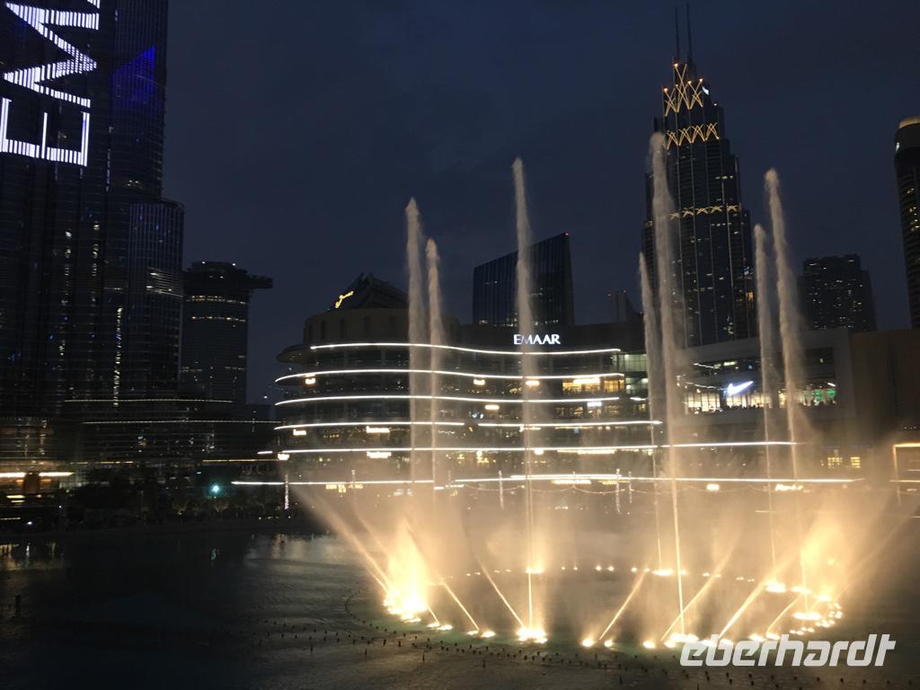 Von über 450 m Höhe geht es nun für einige Reisegäste in die wunderschöne Unterwasserwelt des Dubai Aquariums, bevor es für alle zum Restaurant Abd El Wahab geht, in dem wir auf der Terrasse unser erstes arabisches Abendessen genießen, mit Blick auf die Wasserspiele der Dubai Fountaines.