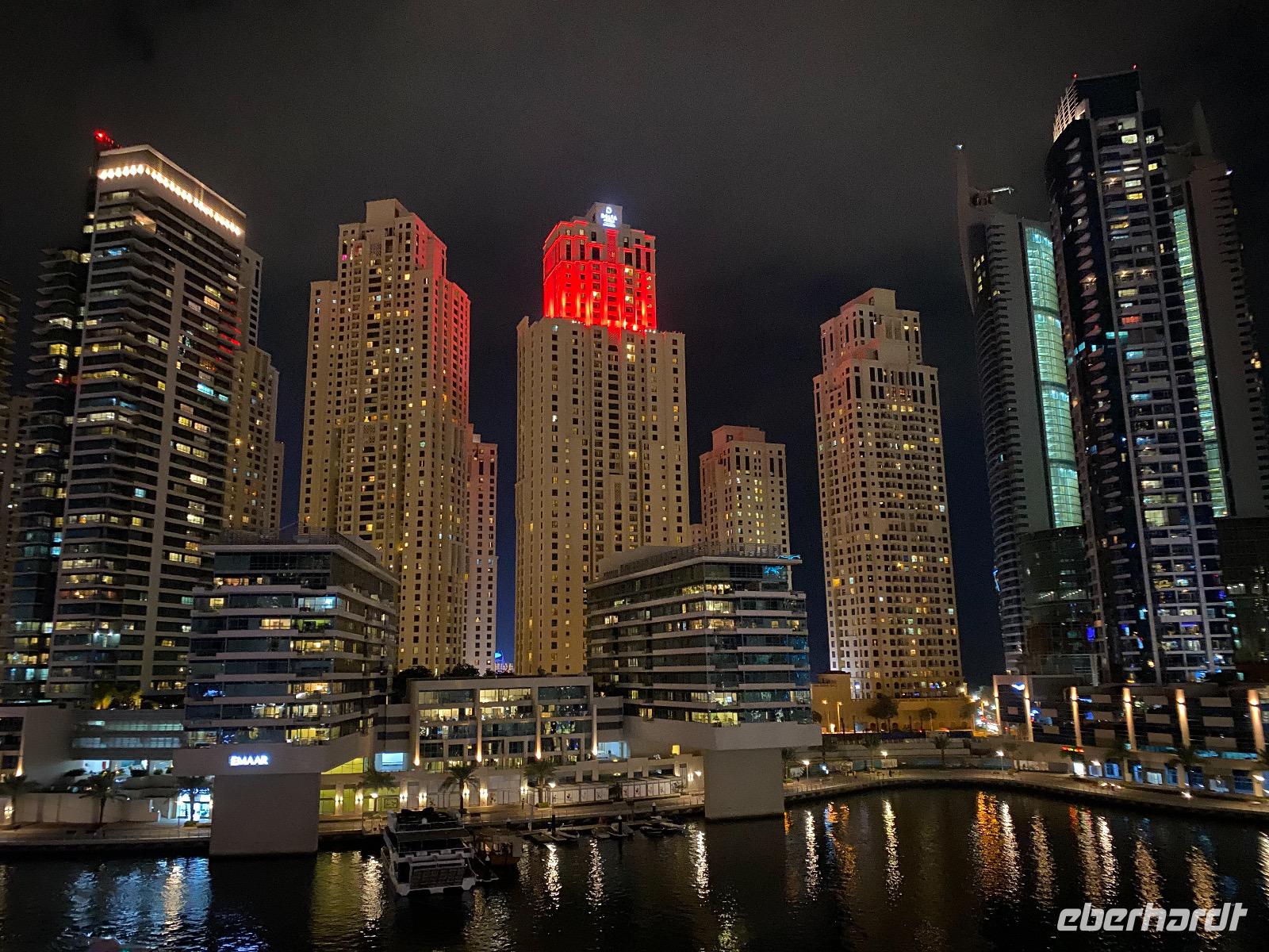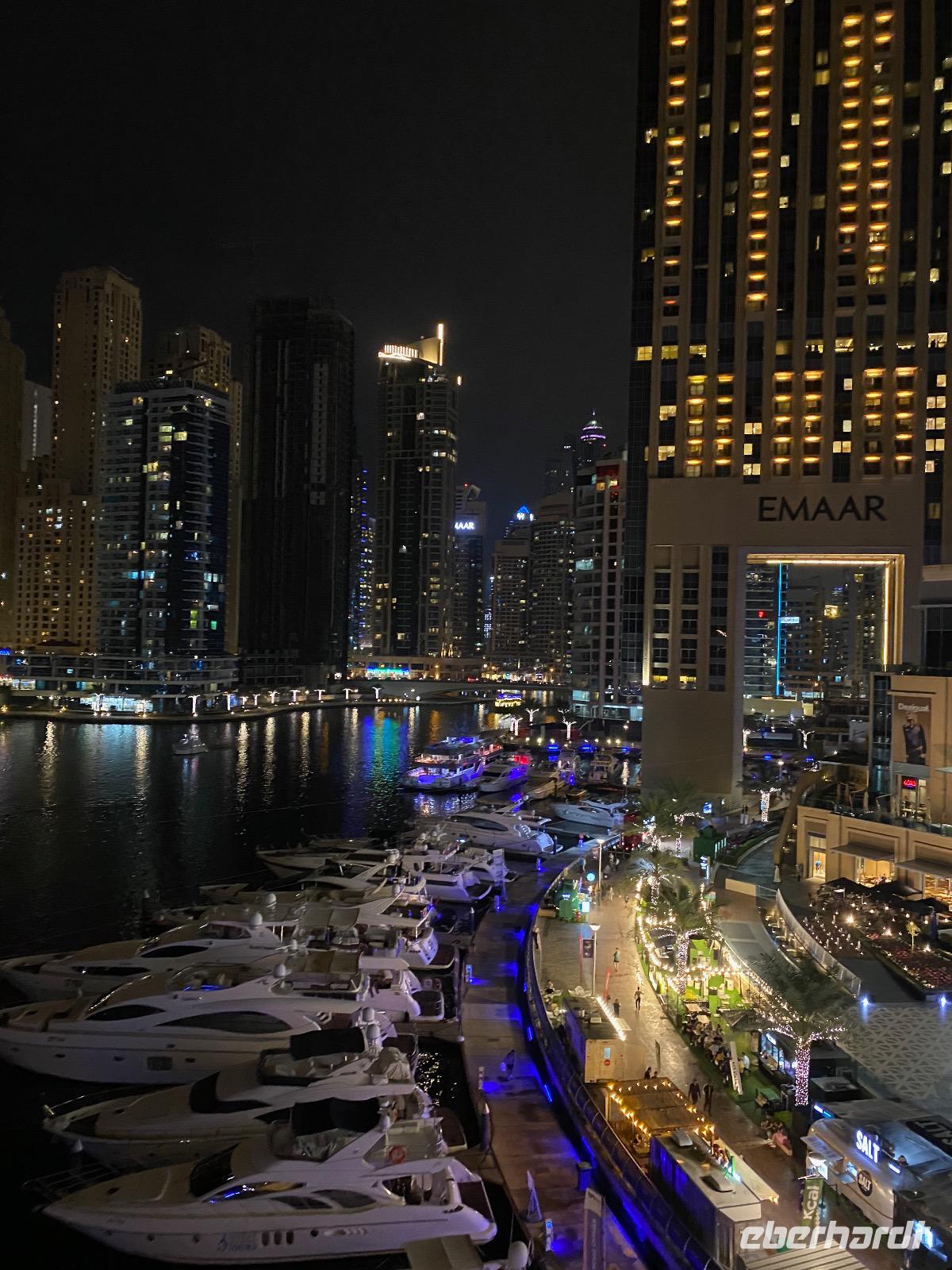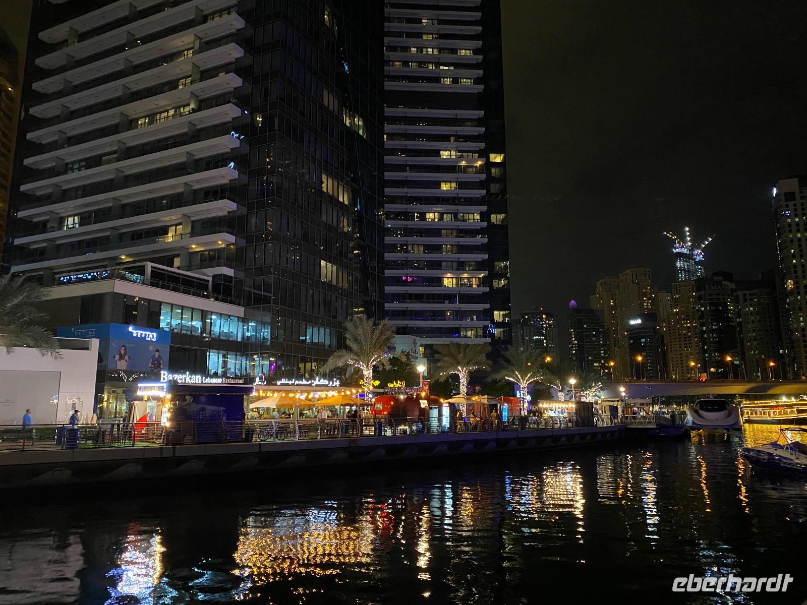 Hier war nun Zeit zur freien Verfügung, um durch die Marina Mall zu schlendern oder entlang der Marina zu spazieren. Passend dazu hatte sich das Wetter deutlich verbessert und der Regen hatte sich verzogen. Am frühen Abend trafen wir uns wieder zu einem gemeinsamen Abendessen an der Marina, am Pier 7. Hier saßen wir auf einer Terrasse und ließen uns ein leckeres Menü schmecken. Zu unserer Freude kamen wir auch pünktlich zur Happy Hour, was die sonst doch recht erschreckenden Preise für alkoholische Getränke erträglich machte. Schließlich verließen wir das Restaurant und fuhren durch das funkelnde und hell beleuchtete Dubai zurück zum Hotel. Nach einem Tag voller schmackhafter Köstlichkeiten erreichten wir mit vollen Mägen das Hotel, wo wir bald schon in unsere Betten fielen.