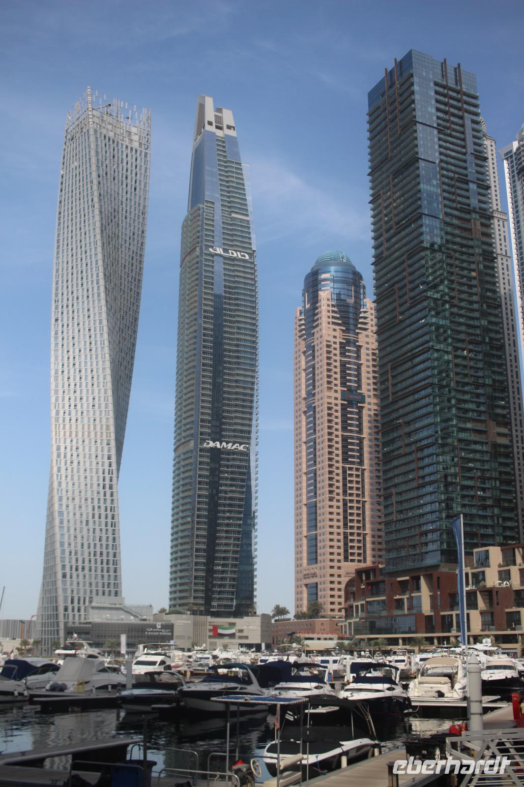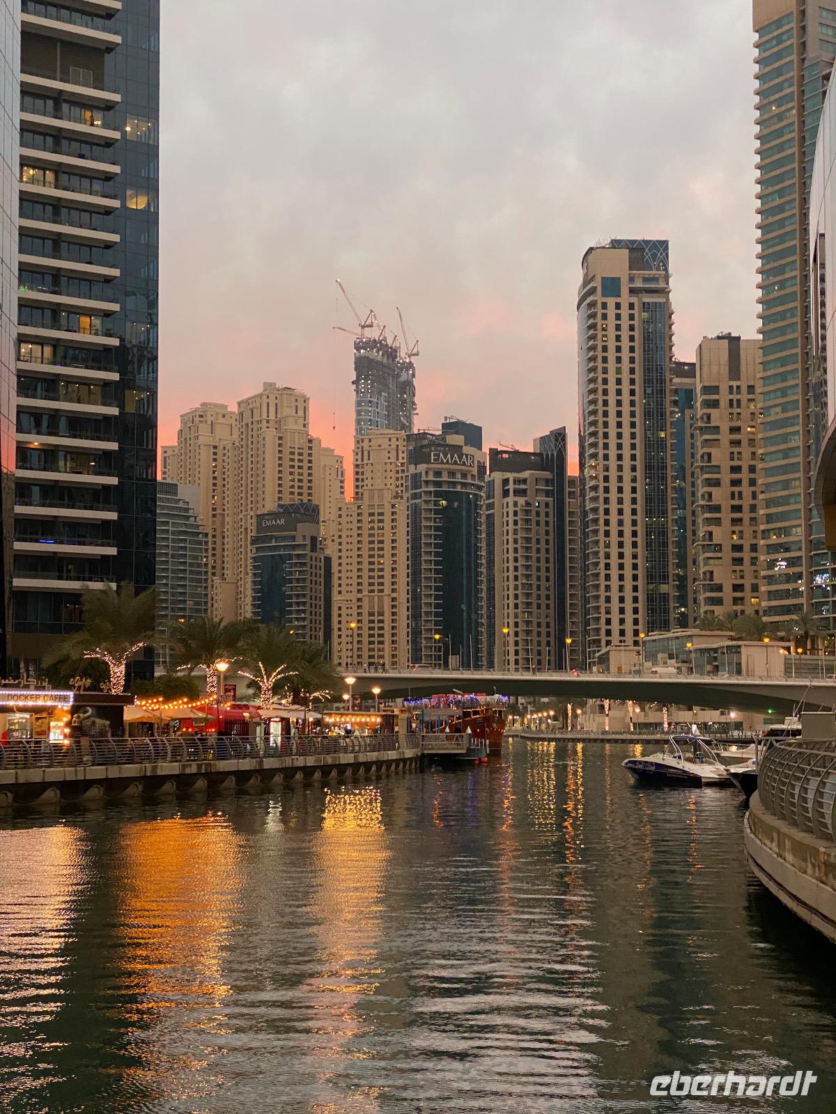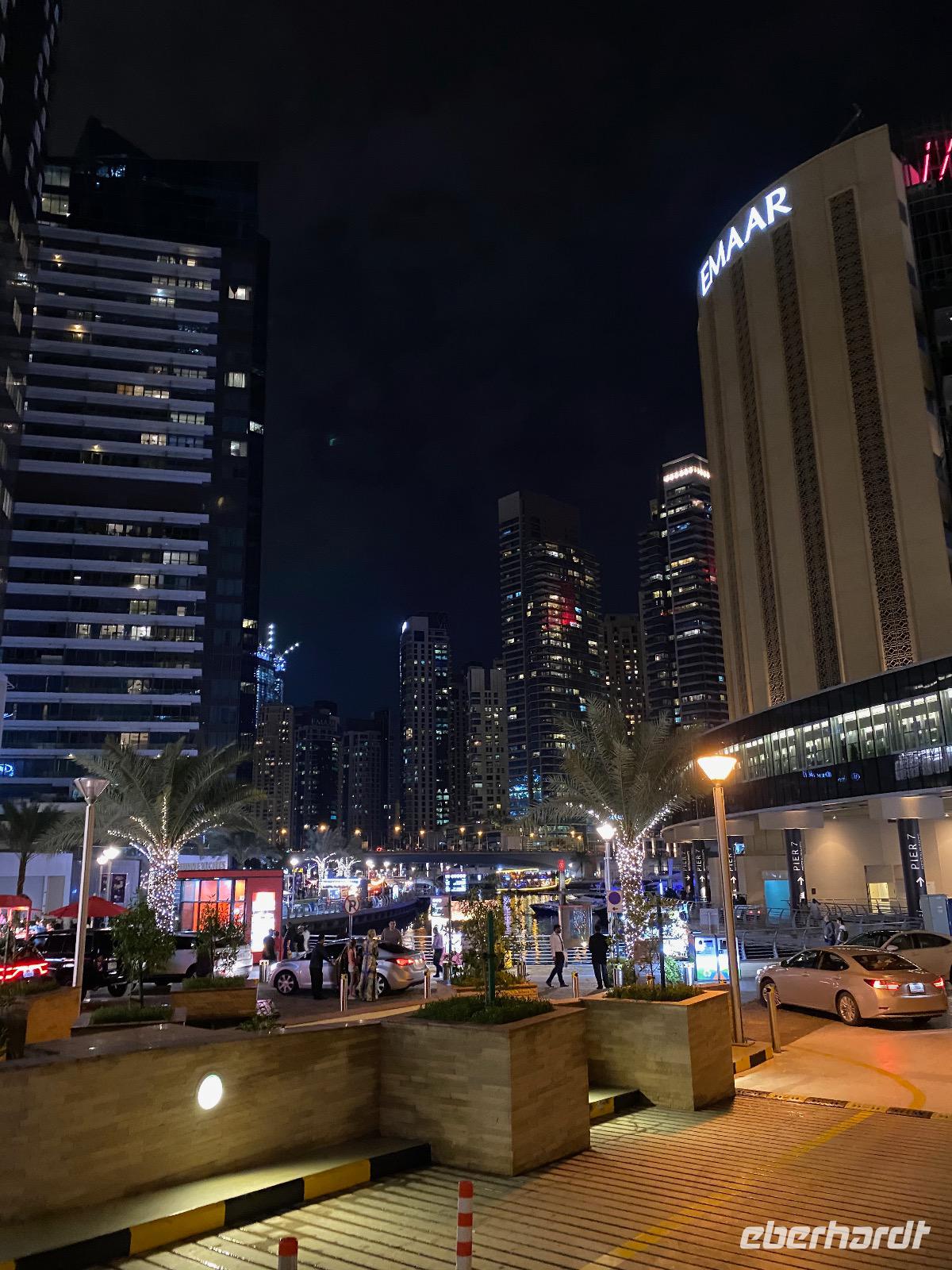 Hier war nun Zeit zur freien Verfügung, um durch die Marina Mall zu schlendern oder entlang der Marina zu spazieren. Passend dazu hatte sich das Wetter deutlich verbessert und der Regen hatte sich verzogen. Am frühen Abend trafen wir uns wieder zu einem gemeinsamen Abendessen an der Marina, am Pier 7. Hier saßen wir auf einer Terrasse und ließen uns ein leckeres Menü schmecken. Zu unserer Freude kamen wir auch pünktlich zur Happy Hour, was die sonst doch recht erschreckenden Preise für alkoholische Getränke erträglich machte. Schließlich verließen wir das Restaurant und fuhren durch das funkelnde und hell beleuchtete Dubai zurück zum Hotel. Nach einem Tag voller schmackhafter Köstlichkeiten erreichten wir mit vollen Mägen das Hotel, wo wir bald schon in unsere Betten fielen.