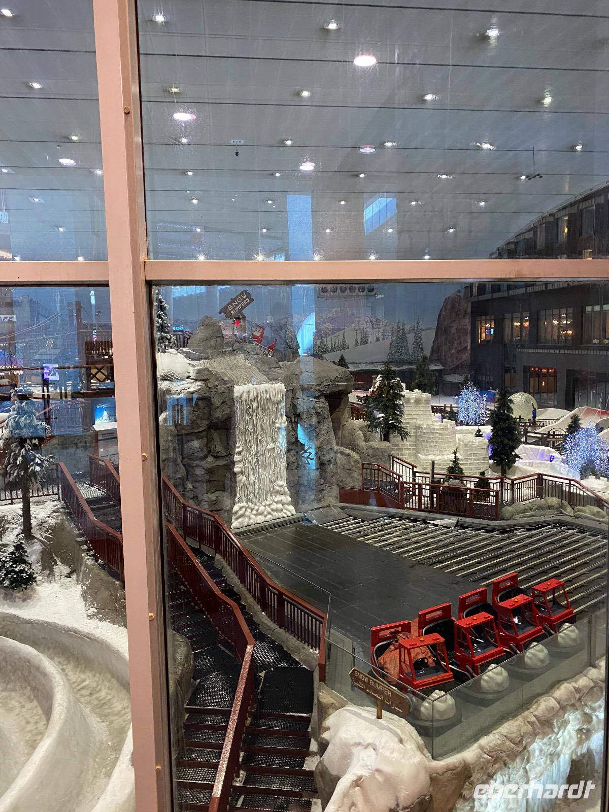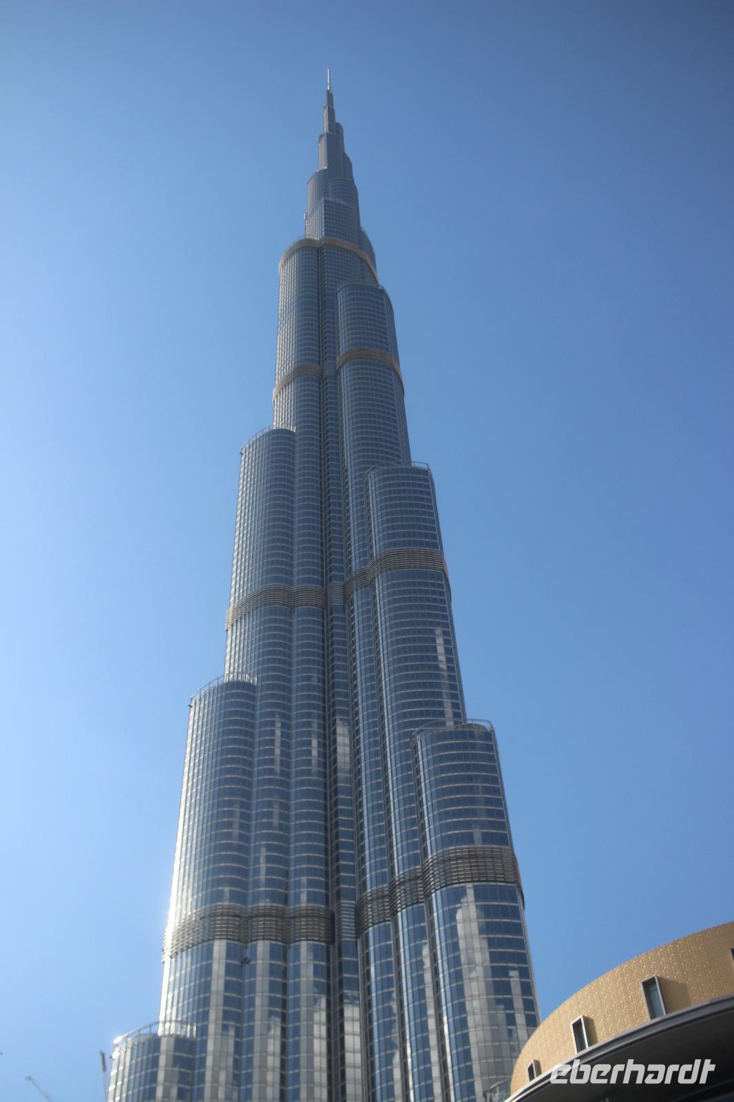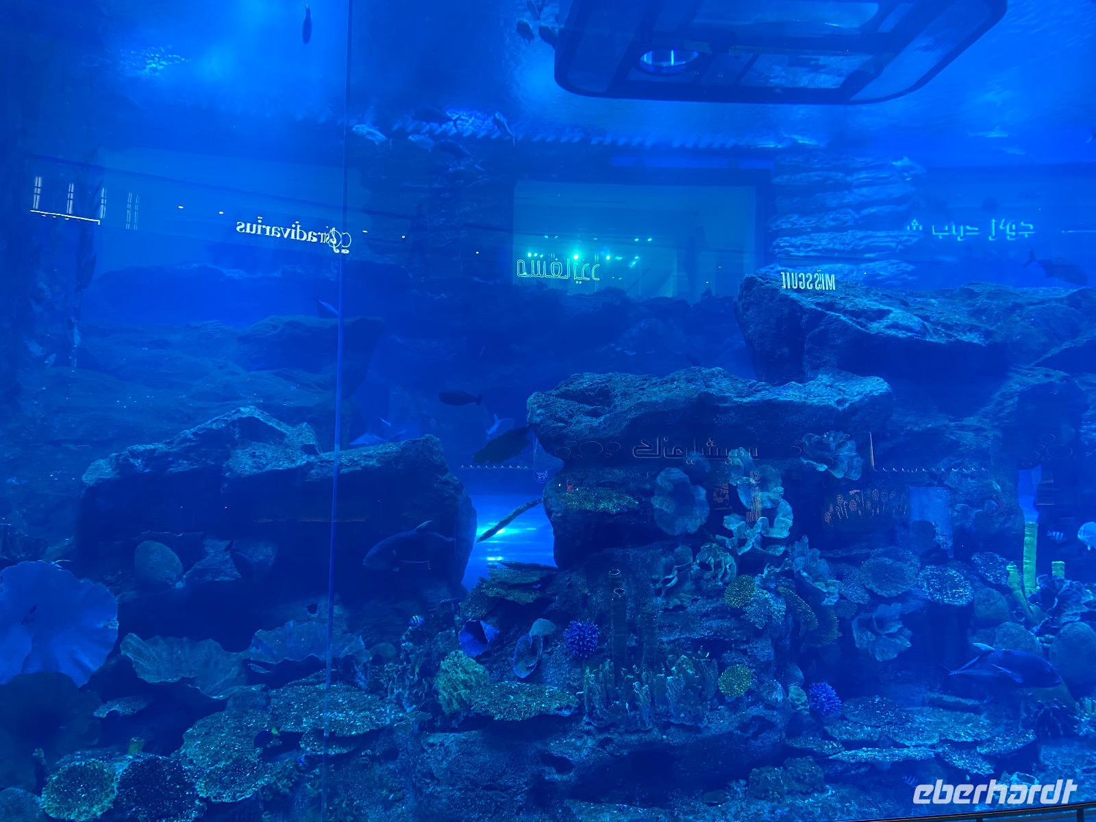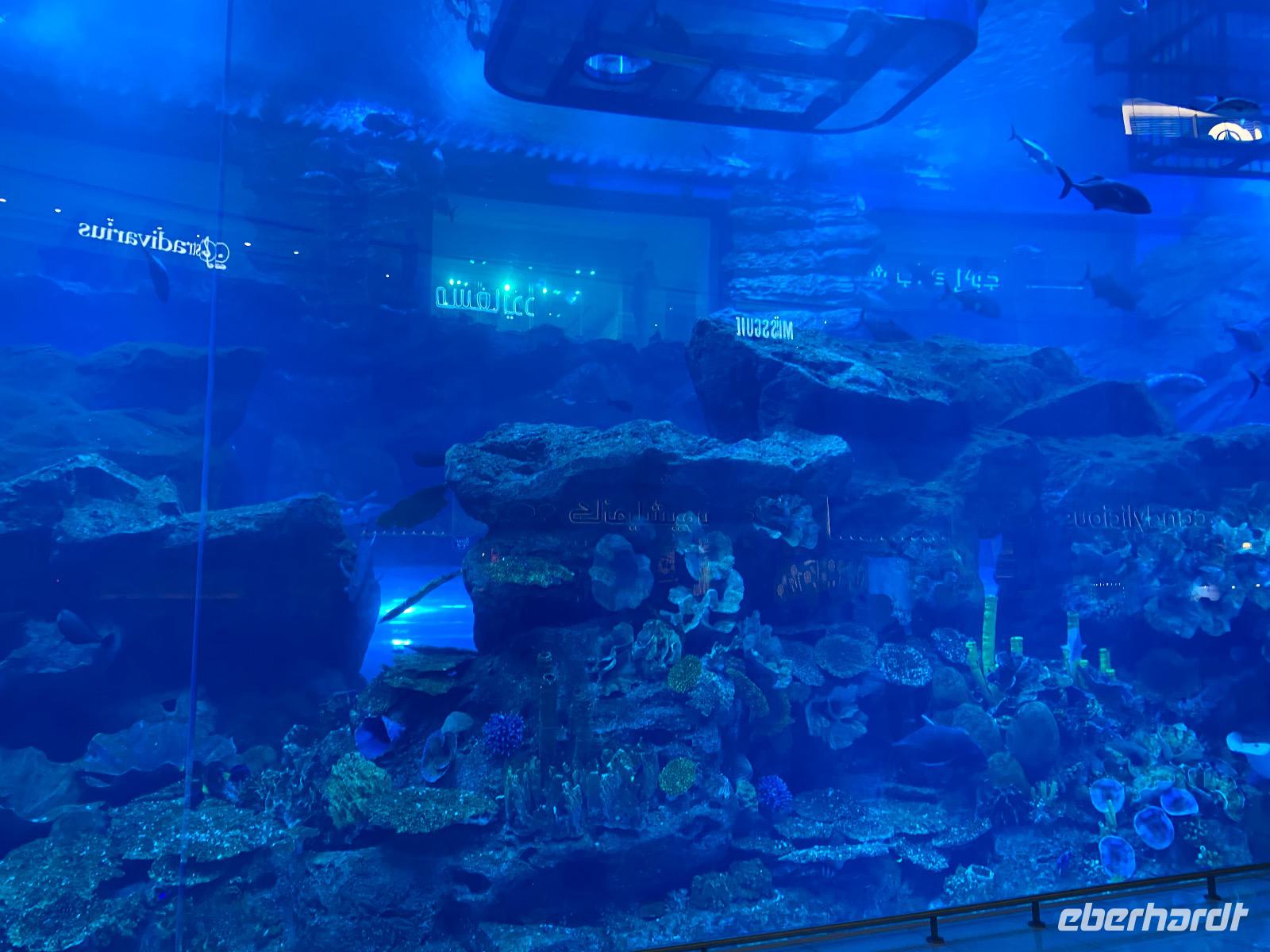 Nach einem ausgiebigen Frühstück trafen wir uns heute ausgeschlafen wieder, um den ersten vollständigen Tag in Dubai für zahlreiche Erkundungen zu nutzen. Dabei trafen wir zwei weitere Gäste, welche gestern aus Prag angereist waren und die wir gestern nicht mehr getroffen hatten. Nun war unsere Reisegruppe wirklich komplett. Zuerst fuhren wir zum Palast des Scheiches von Dubai, Muhammad bin Raschid Al Maktum. Wir fotografierten fleißig - nicht nur den Palast, sondern auch die schwarzen bzw. grünen Stretch-Limousinen, welche wir bald entdeckten. Weiter ging es zur Dubai Marina, der wohl beliebtesten und auch nahezu teuersten Wohngegend in Dubai. Wir bestaunten die Formationen an Hochhäusern, insbesondere das „meistgedrehteste" Gebäude der Welt sowie auch den künstlich angelegten Kanal mitsamt den eindrucksvollen Jachten. Nach zahlreichen Fotos begaben wir uns wieder zum Bus und fuhren zur Mall of the Emirates. Hier führte uns unser erster Weg zunächst in eine Wechselstube. Als wir nun endlich alle die einheimische Währung, Dirhams, in der Tasche hatten, konnten wir unser Programm fortsetzen. Zunächst galt es, die Skihalle in der Mall zu bestaunen. Bei ca. -3 Grad Celcius kann man hier Skifahren, rodeln oder sich an einer Schnellballschlacht erfreuen. Mitten in der Wüste! Absolut gigantisch - wie so vieles hier in Dubai. Wir beobachteten das Treiben von außen durch eine Glasscheibe und schlenderten etwas durch die Gänge des großen Einkaufszentrums. Im Anschluss ging es zu einem noch größeren Einkaufszentrum: der Dubai Mall mit einer Verkaufsfläche von 350.000 Quadratmetern, wodurch sie zu einer der größten der Welt zählt. Über 1.200 Geschäfte sind hier zu finden sowie einige Attraktionen. Eine dieser Attraktionen ist das Aquarium, welches die meisten Gäste unserer Gruppe zunächst besuchten. Dieses erstreckt sich über 3 Etagen, wobei das größte Becken 11m hoch ist. Auf ca. 10.000 Kubikmetern Wasser aus dem Persischen Golf kann man ca. 33.000 Seetiere und Fische finden, darunter Haie, Rochen und andere Riffbewohner.