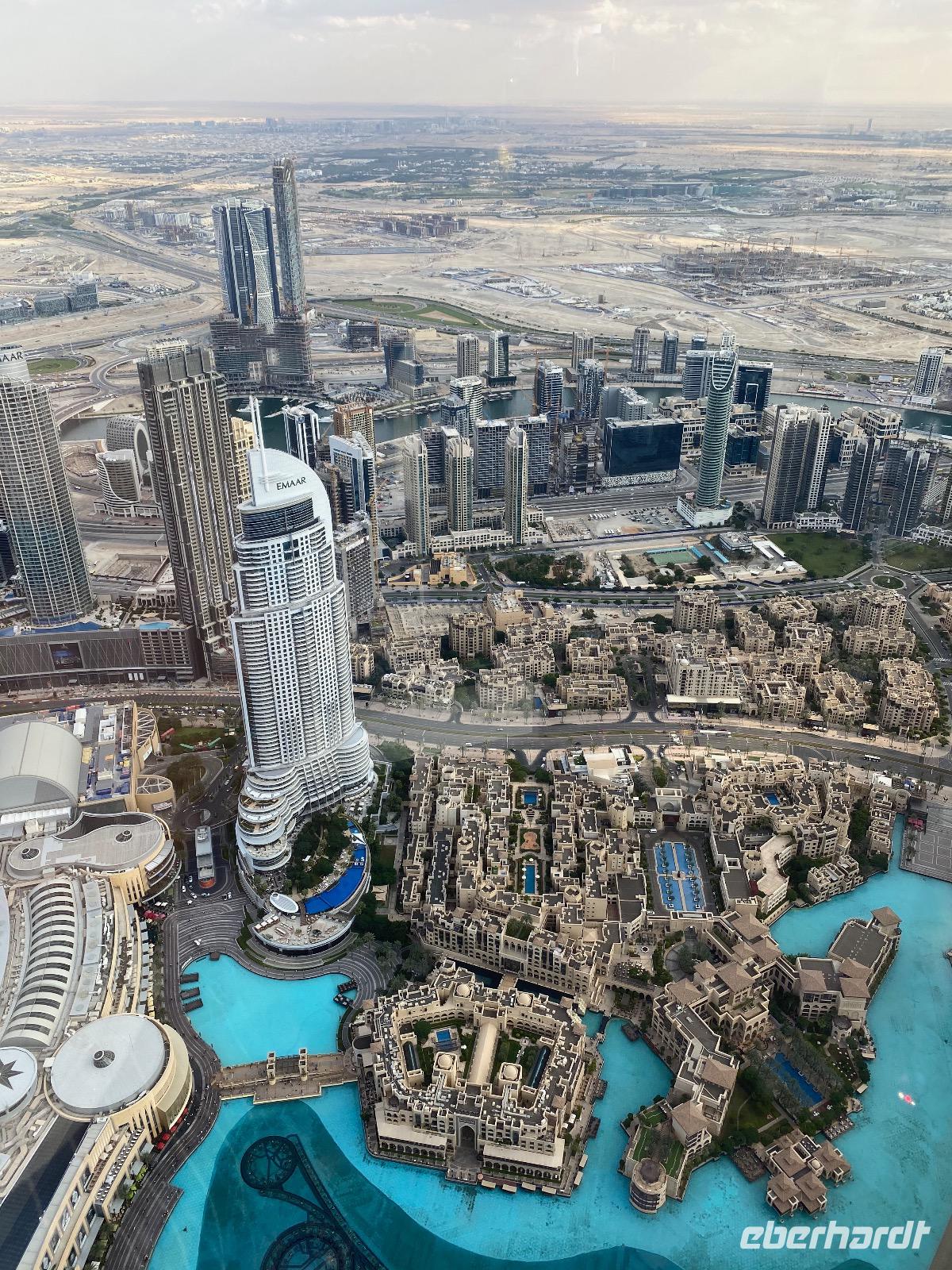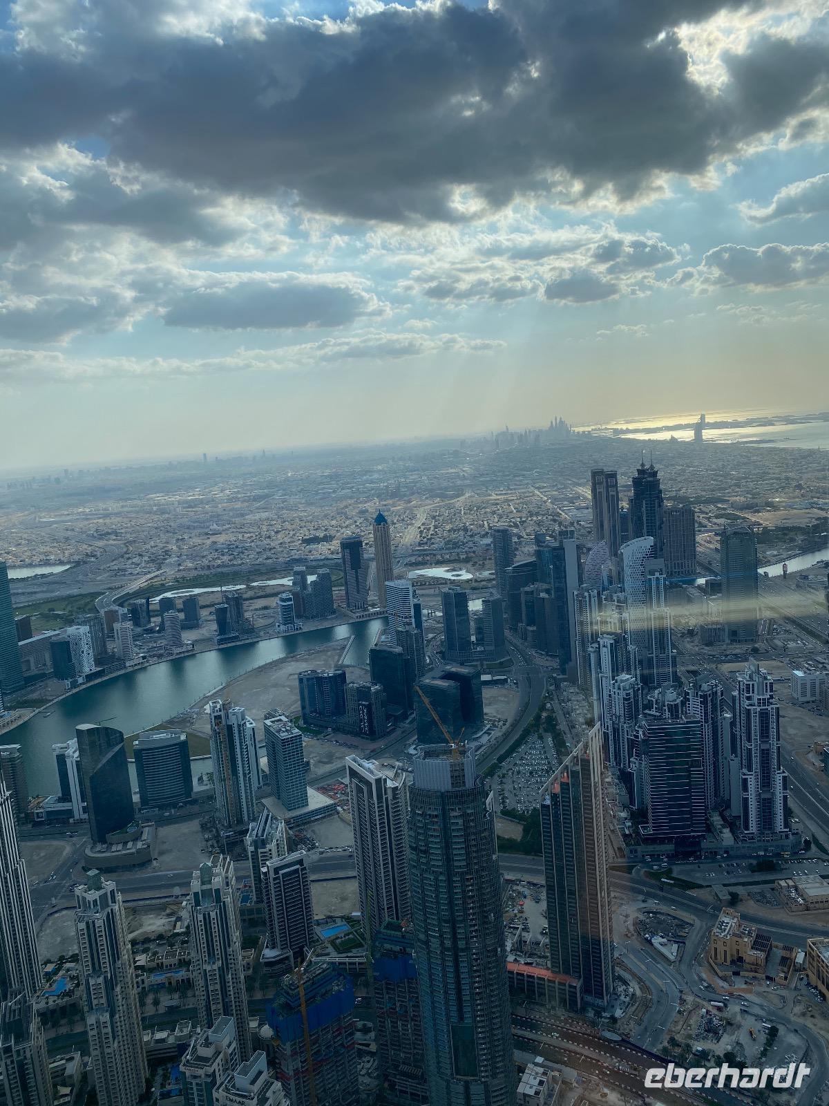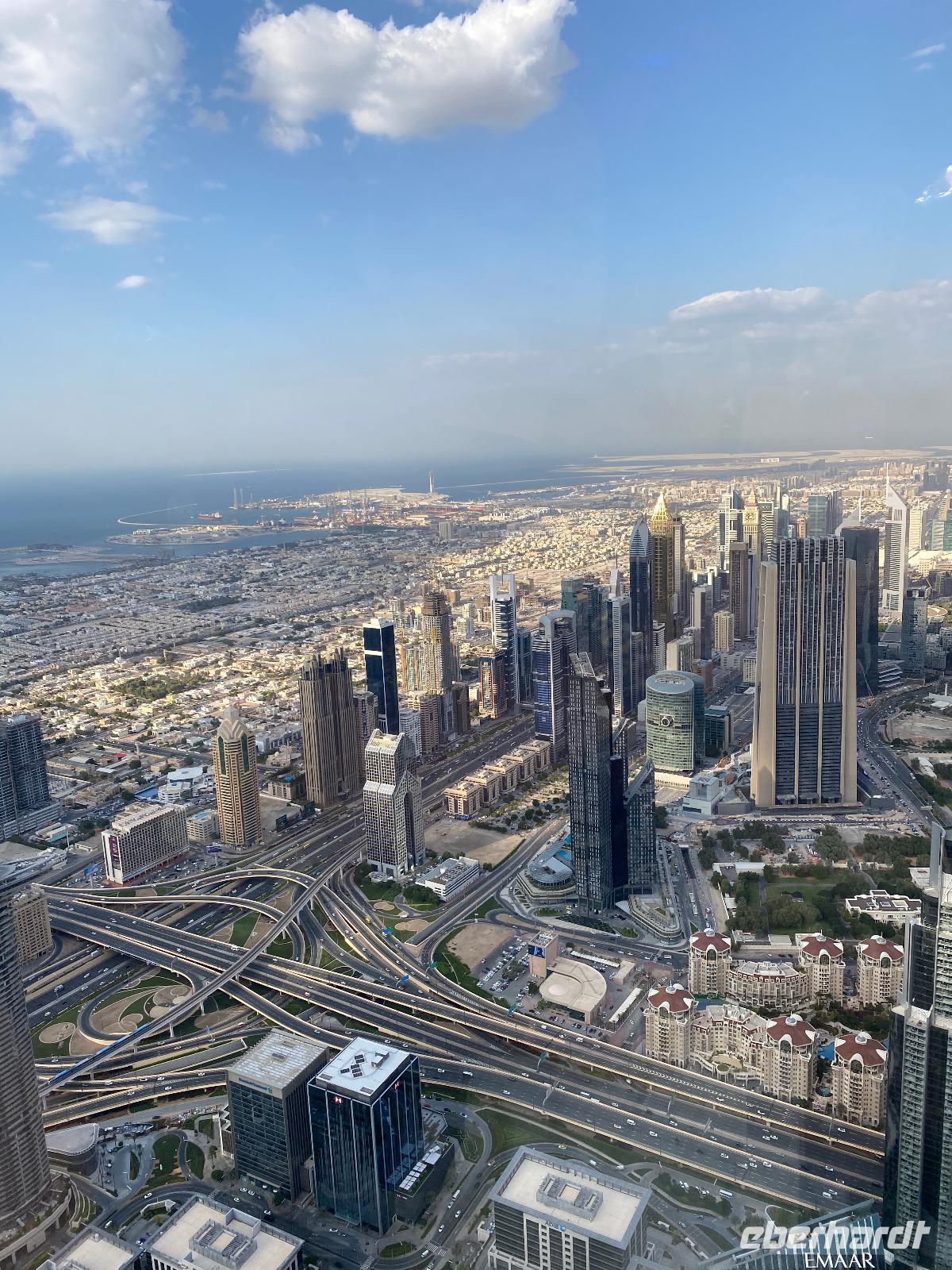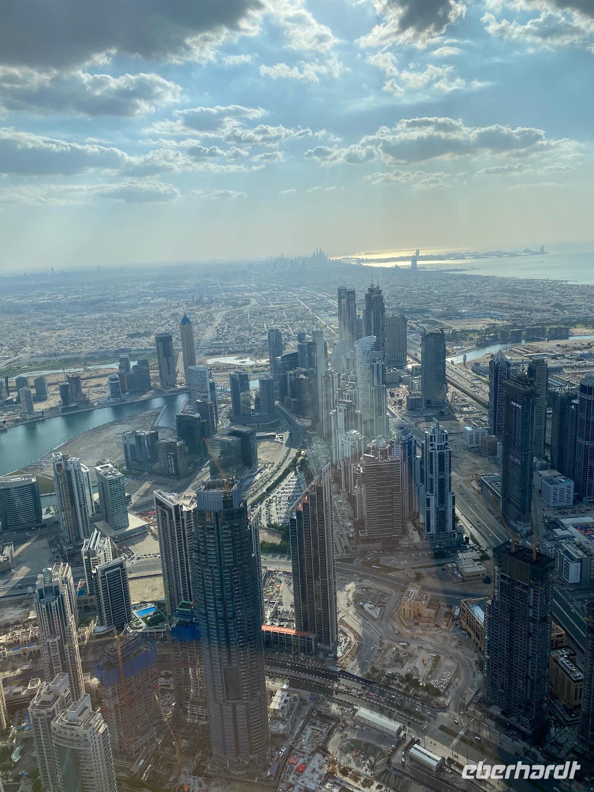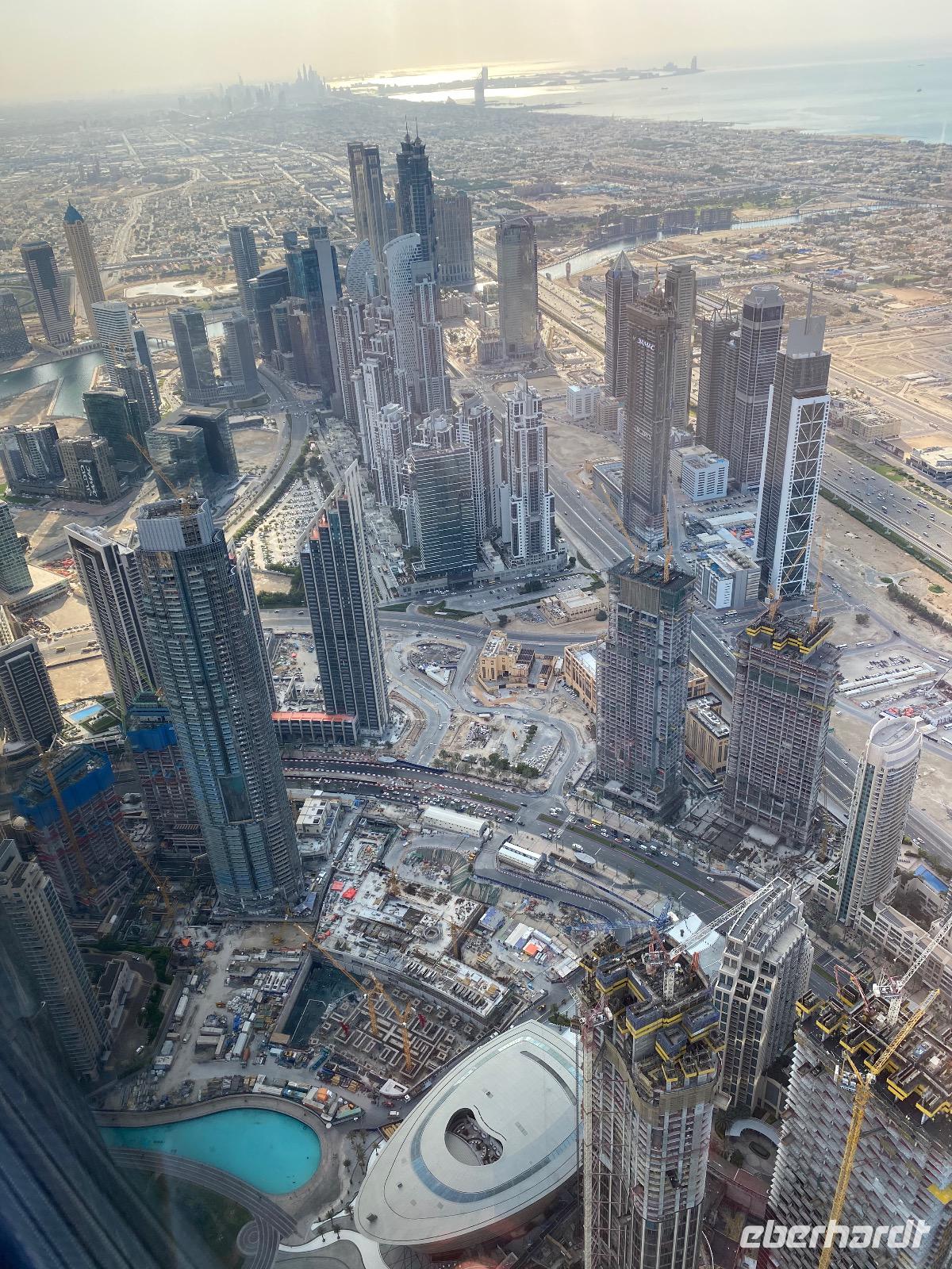 Als wir uns schließlich wiedertrafen, erwartete uns gleich ein weiteres Highlight: der Burj Khalifa. Dieser stellt seit 2008 mit ca. 830 Metern das höchste Gebäude der Welt dar. Ab 2022 soll sich dies ändern, denn in der Dubai Marina soll ein noch höheres Gebäude entstehen - der Dubai Creek Tower. Wir sind gespannt, vielleicht werden wir dieses auf unserem nächsten Besuch in Dubai erklimmen. Doch für heute stand zunächst der Burj Khalifa auf dem Programm. Zunächst konnten wir diesen bereits von außen begutachten und einige Fotos schießen, bevor wir schließlich innerhalb von 55 Sekunden zur Aussichtsplattform auf die 126. Etage hinauffuhren. Von hier genossen wir einen herrlichen Blick auf Dubai und erkannten bereits erste Teile der Stadt von oben wieder. Einfach gigantisch! Wir blickten auf Formationen von Hochhäusern hinab, alle individuell gestaltet mit ihrem eigenen, besonderen Charme. Dazwischen das leuchtende Blau des künstlich angelegten Kanals. Ein tolles Fotomotiv! Nachdem wir uns irgendwann satt gesehen hatten, fuhren wir mit dem Fahrstuhl wieder nach unten und hatten nun noch etwas Zeit, die Dubai Mall zu erkunden. Beispielsweise bestand die Möglichkeit, den Wasserfall im Inneren der Mall zu begutachten oder durch die zahlreichen Geschäfte zu stöbern.