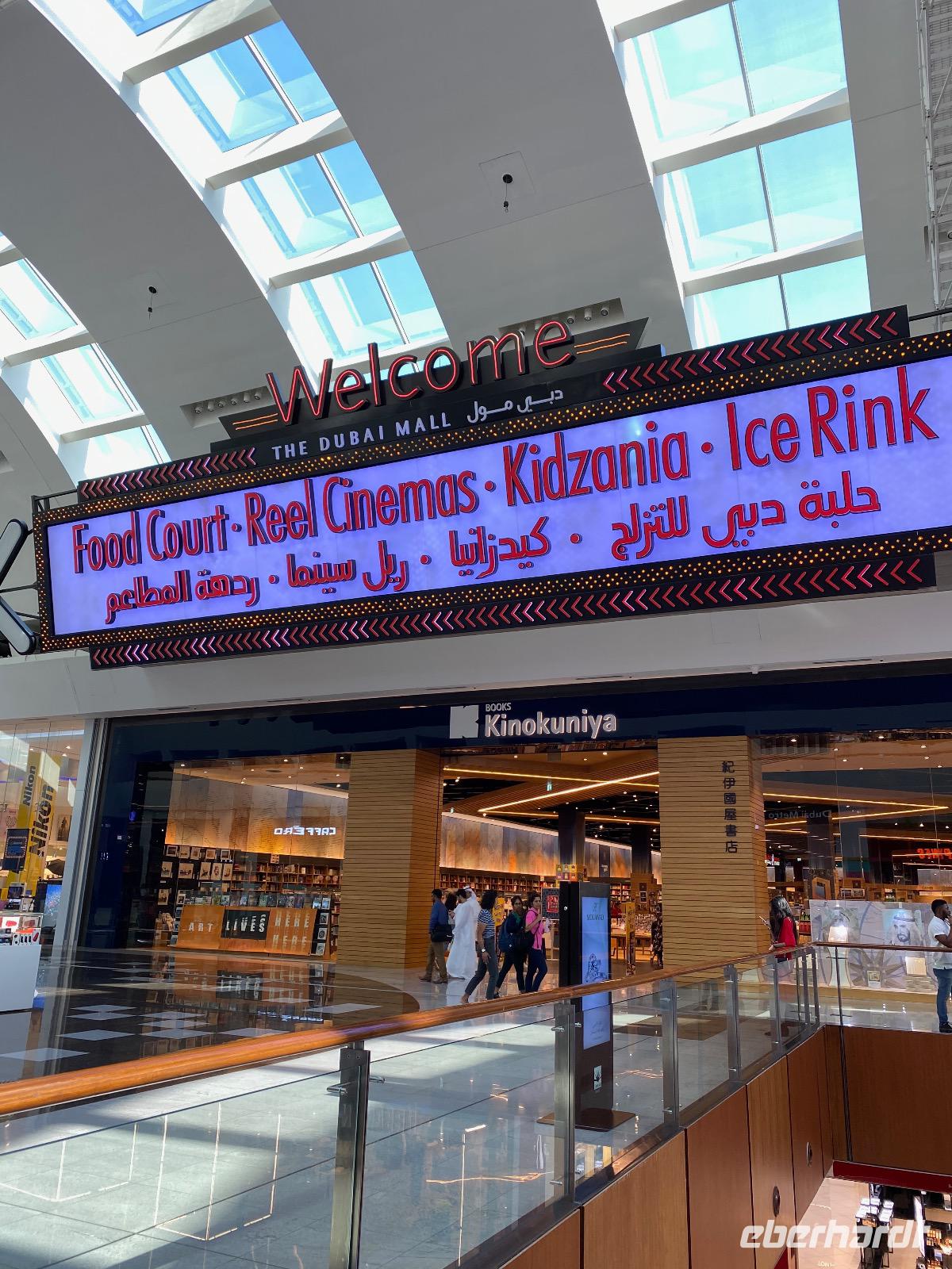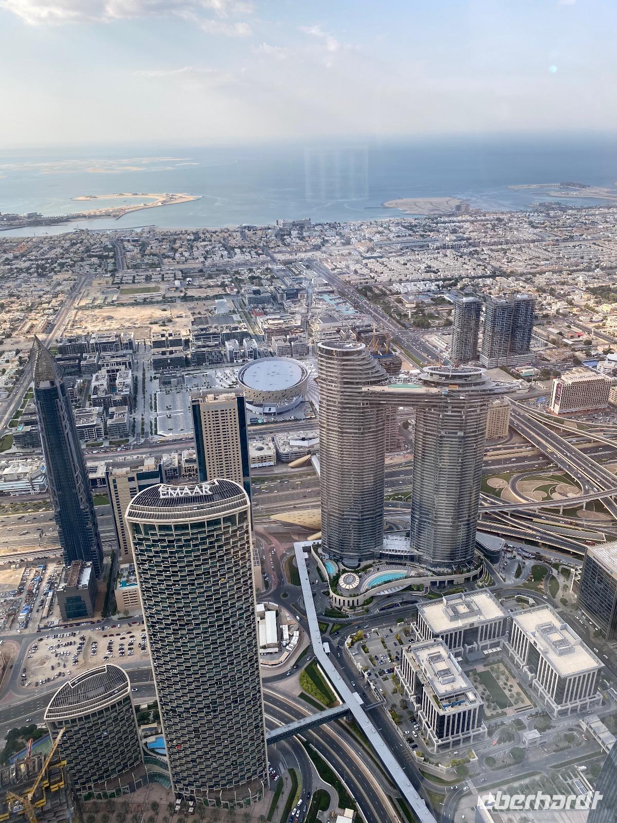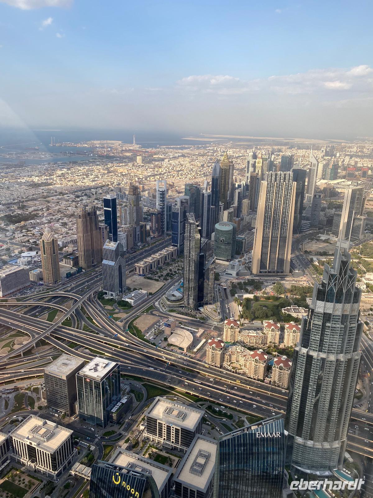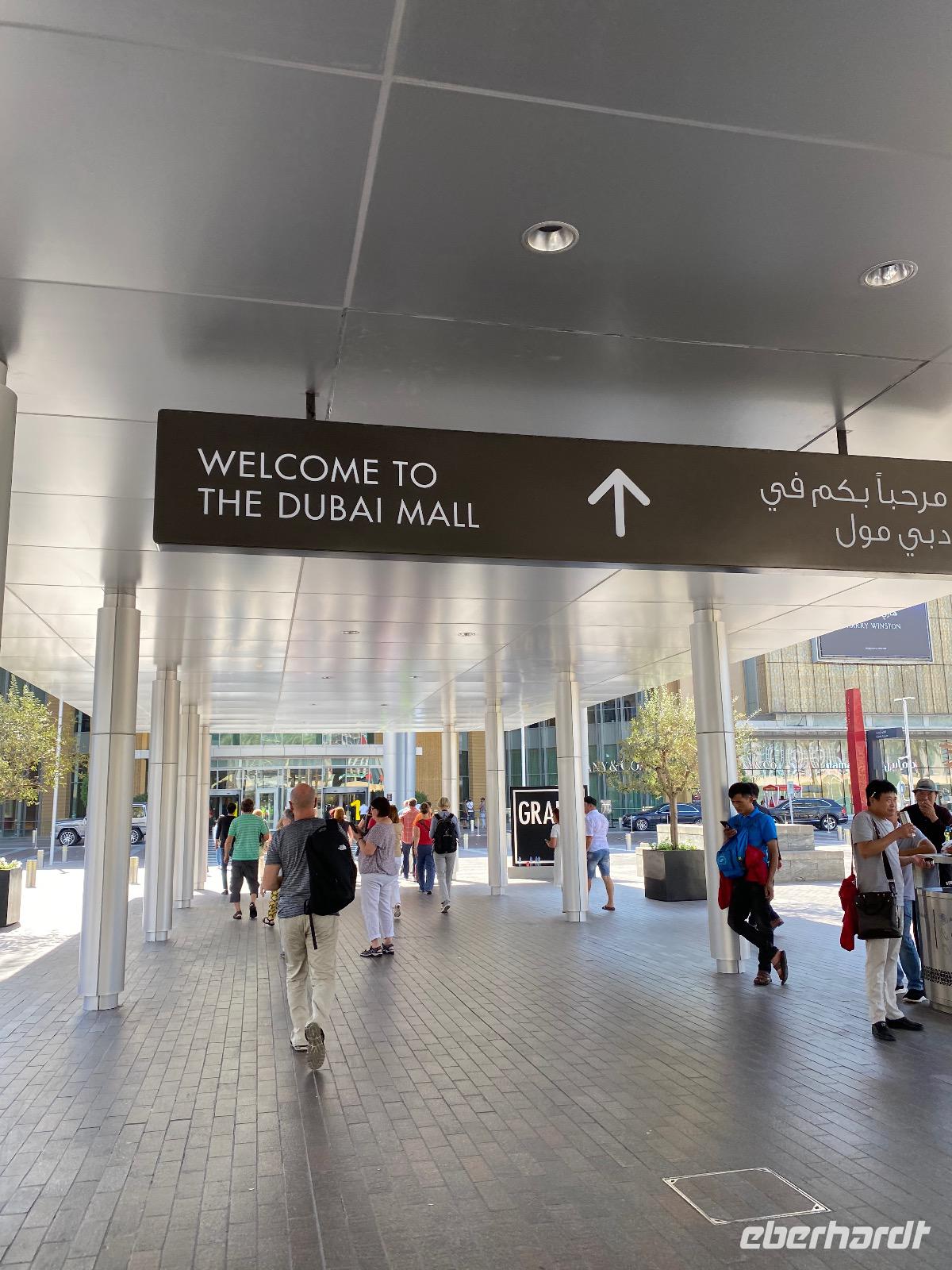 Als wir uns schließlich wiedertrafen, erwartete uns gleich ein weiteres Highlight: der Burj Khalifa. Dieser stellt seit 2008 mit ca. 830 Metern das höchste Gebäude der Welt dar. Ab 2022 soll sich dies ändern, denn in der Dubai Marina soll ein noch höheres Gebäude entstehen - der Dubai Creek Tower. Wir sind gespannt, vielleicht werden wir dieses auf unserem nächsten Besuch in Dubai erklimmen. Doch für heute stand zunächst der Burj Khalifa auf dem Programm. Zunächst konnten wir diesen bereits von außen begutachten und einige Fotos schießen, bevor wir schließlich innerhalb von 55 Sekunden zur Aussichtsplattform auf die 126. Etage hinauffuhren. Von hier genossen wir einen herrlichen Blick auf Dubai und erkannten bereits erste Teile der Stadt von oben wieder. Einfach gigantisch! Wir blickten auf Formationen von Hochhäusern hinab, alle individuell gestaltet mit ihrem eigenen, besonderen Charme. Dazwischen das leuchtende Blau des künstlich angelegten Kanals. Ein tolles Fotomotiv! Nachdem wir uns irgendwann satt gesehen hatten, fuhren wir mit dem Fahrstuhl wieder nach unten und hatten nun noch etwas Zeit, die Dubai Mall zu erkunden. Beispielsweise bestand die Möglichkeit, den Wasserfall im Inneren der Mall zu begutachten oder durch die zahlreichen Geschäfte zu stöbern.