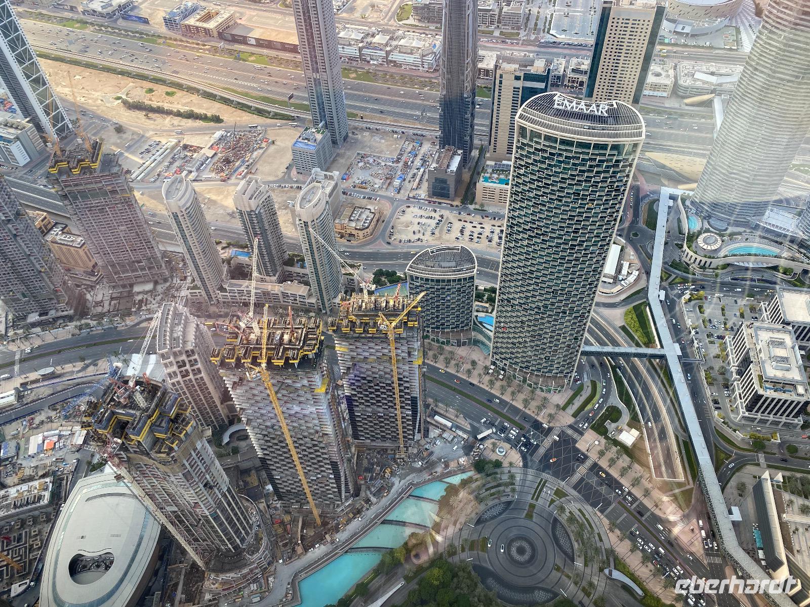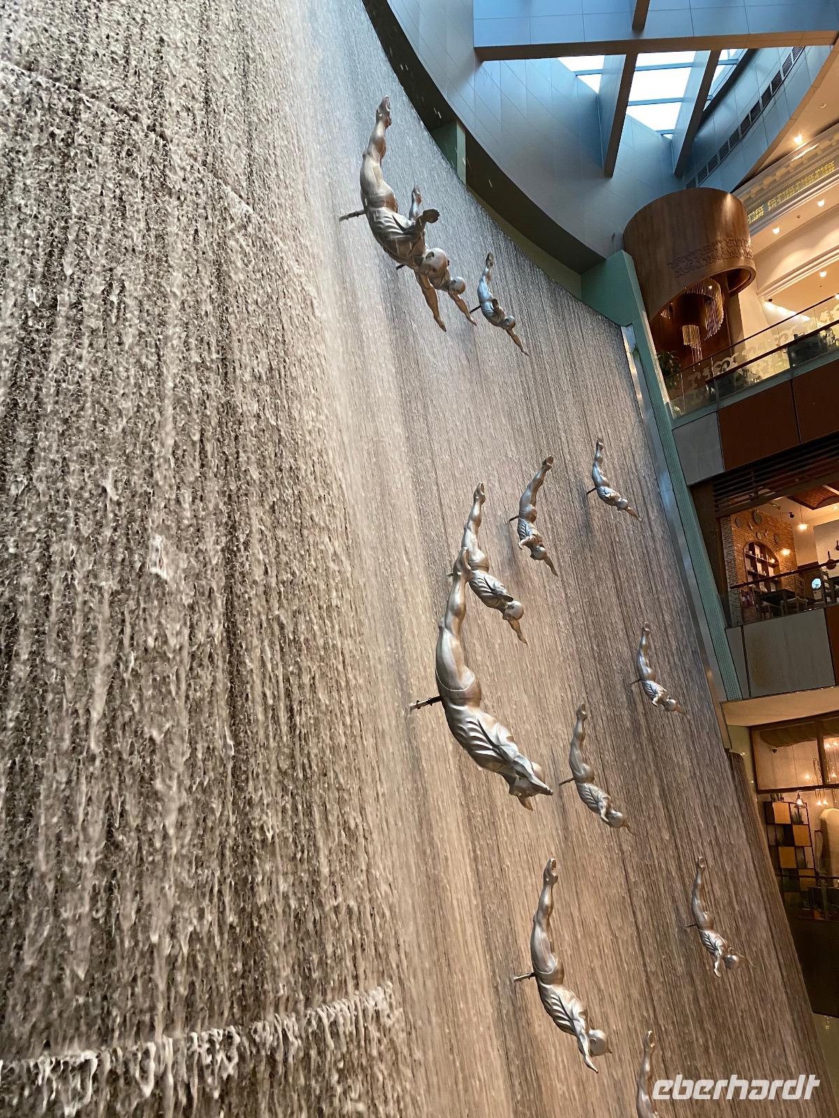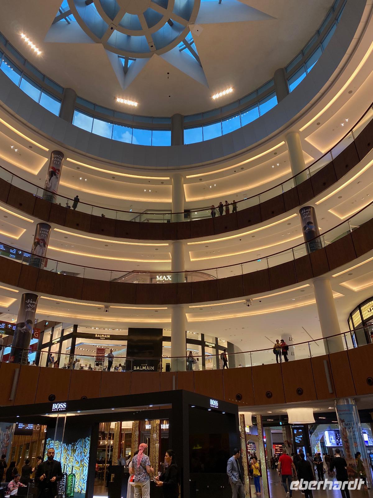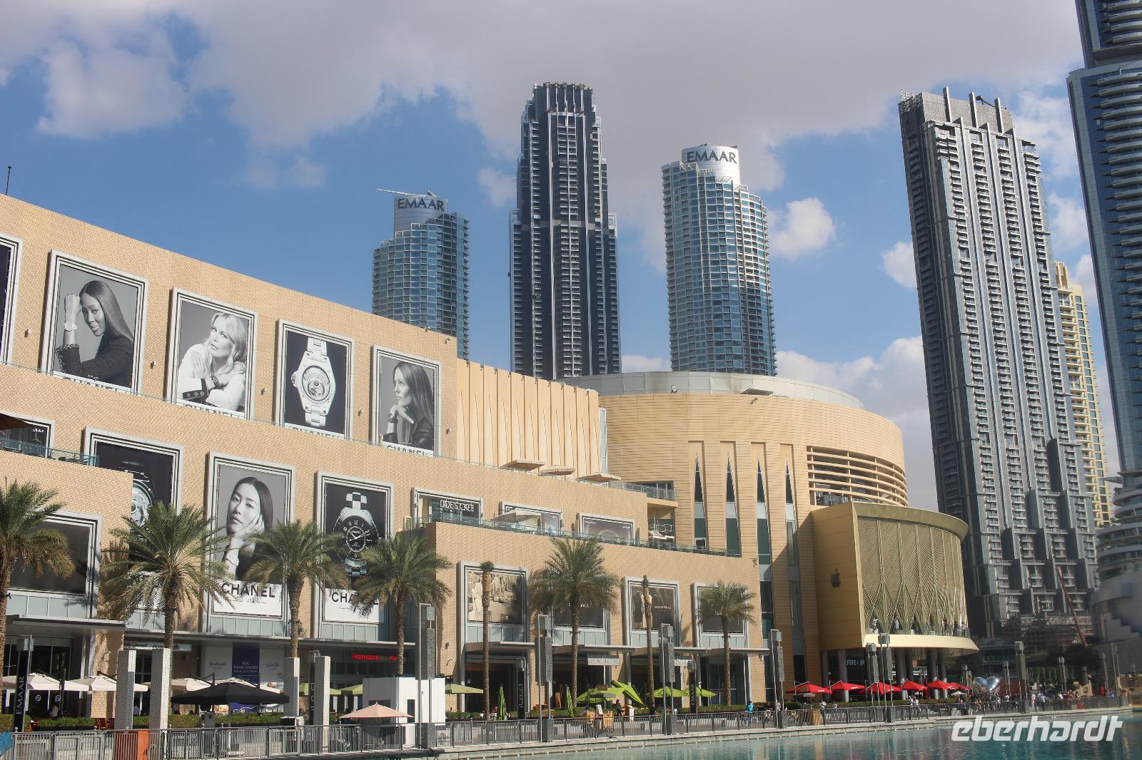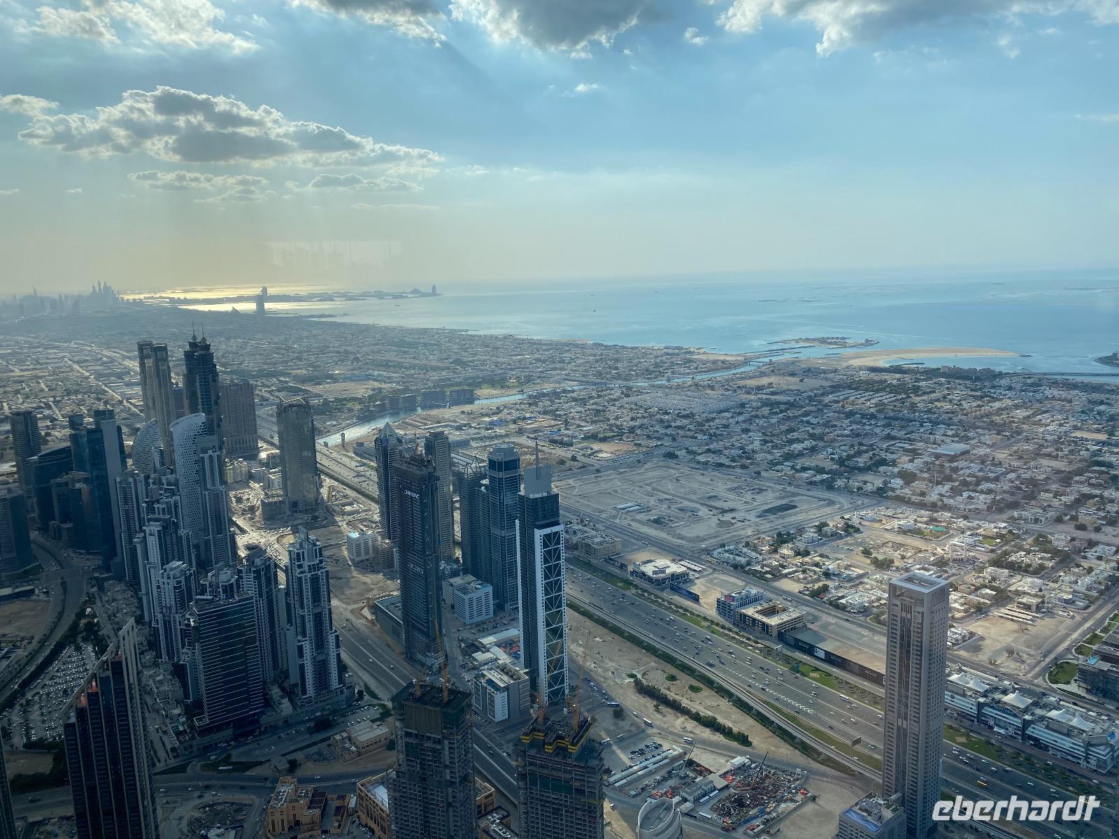 Als wir uns schließlich wiedertrafen, erwartete uns gleich ein weiteres Highlight: der Burj Khalifa. Dieser stellt seit 2008 mit ca. 830 Metern das höchste Gebäude der Welt dar. Ab 2022 soll sich dies ändern, denn in der Dubai Marina soll ein noch höheres Gebäude entstehen - der Dubai Creek Tower. Wir sind gespannt, vielleicht werden wir dieses auf unserem nächsten Besuch in Dubai erklimmen. Doch für heute stand zunächst der Burj Khalifa auf dem Programm. Zunächst konnten wir diesen bereits von außen begutachten und einige Fotos schießen, bevor wir schließlich innerhalb von 55 Sekunden zur Aussichtsplattform auf die 126. Etage hinauffuhren. Von hier genossen wir einen herrlichen Blick auf Dubai und erkannten bereits erste Teile der Stadt von oben wieder. Einfach gigantisch! Wir blickten auf Formationen von Hochhäusern hinab, alle individuell gestaltet mit ihrem eigenen, besonderen Charme. Dazwischen das leuchtende Blau des künstlich angelegten Kanals. Ein tolles Fotomotiv! Nachdem wir uns irgendwann satt gesehen hatten, fuhren wir mit dem Fahrstuhl wieder nach unten und hatten nun noch etwas Zeit, die Dubai Mall zu erkunden. Beispielsweise bestand die Möglichkeit, den Wasserfall im Inneren der Mall zu begutachten oder durch die zahlreichen Geschäfte zu stöbern.