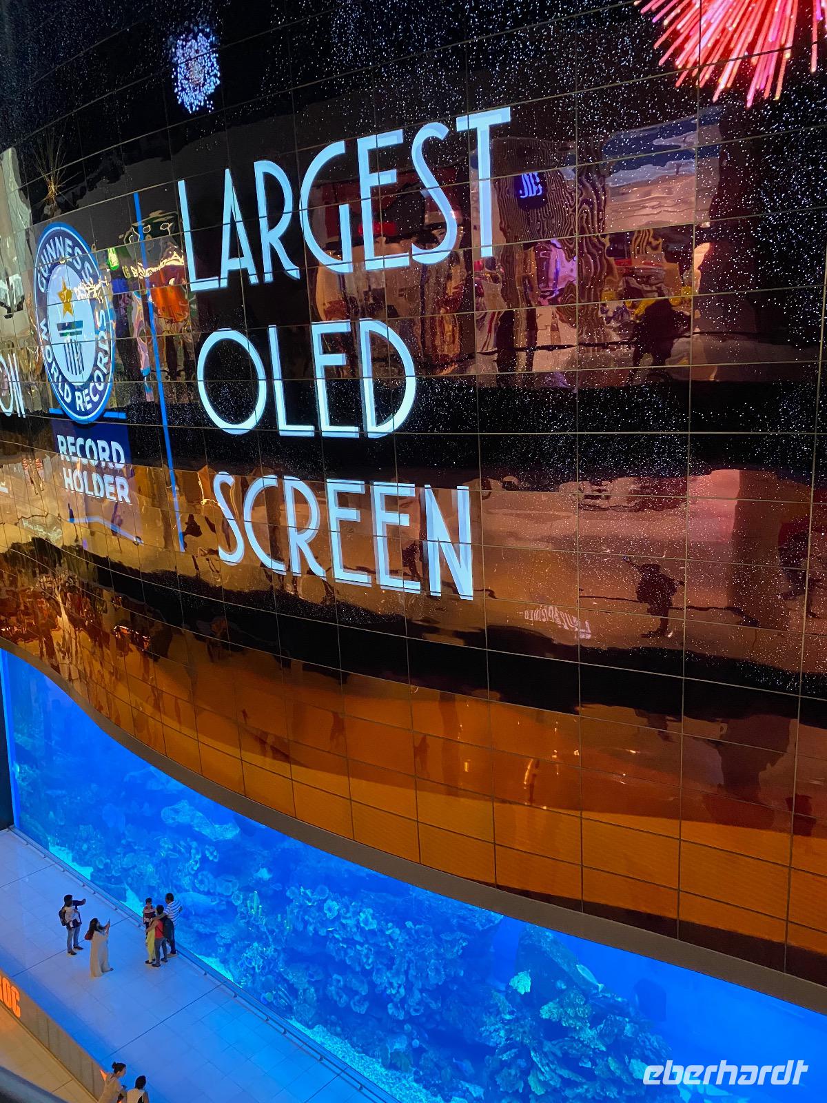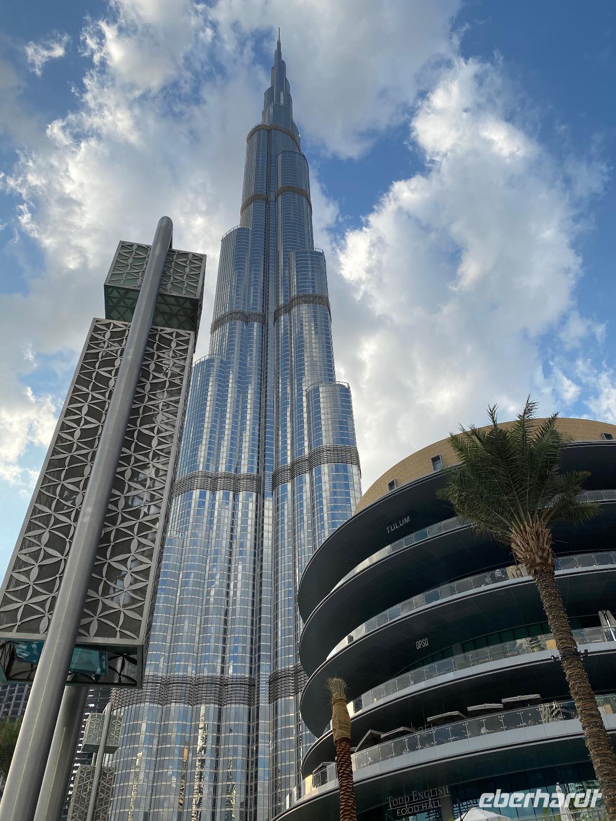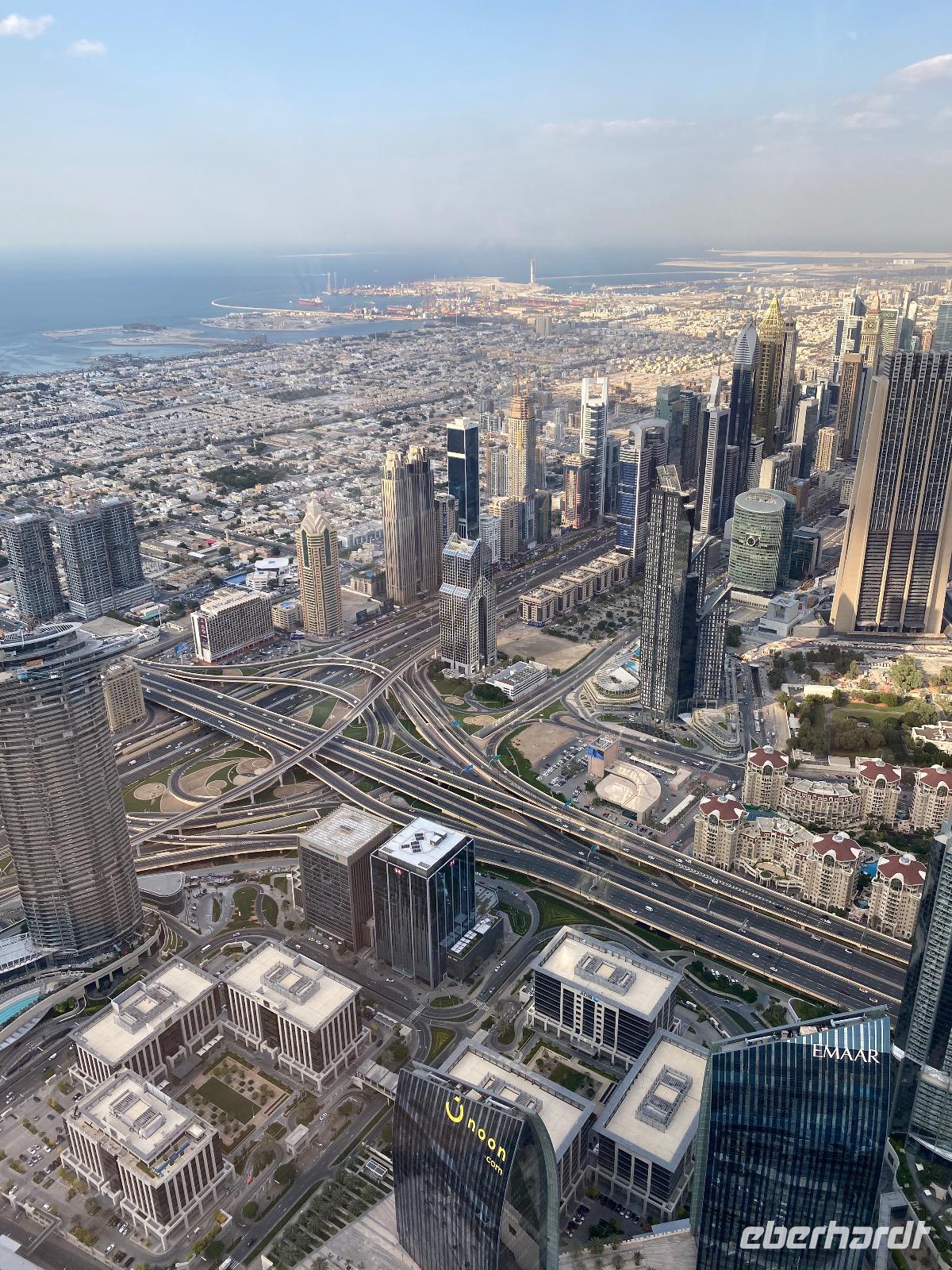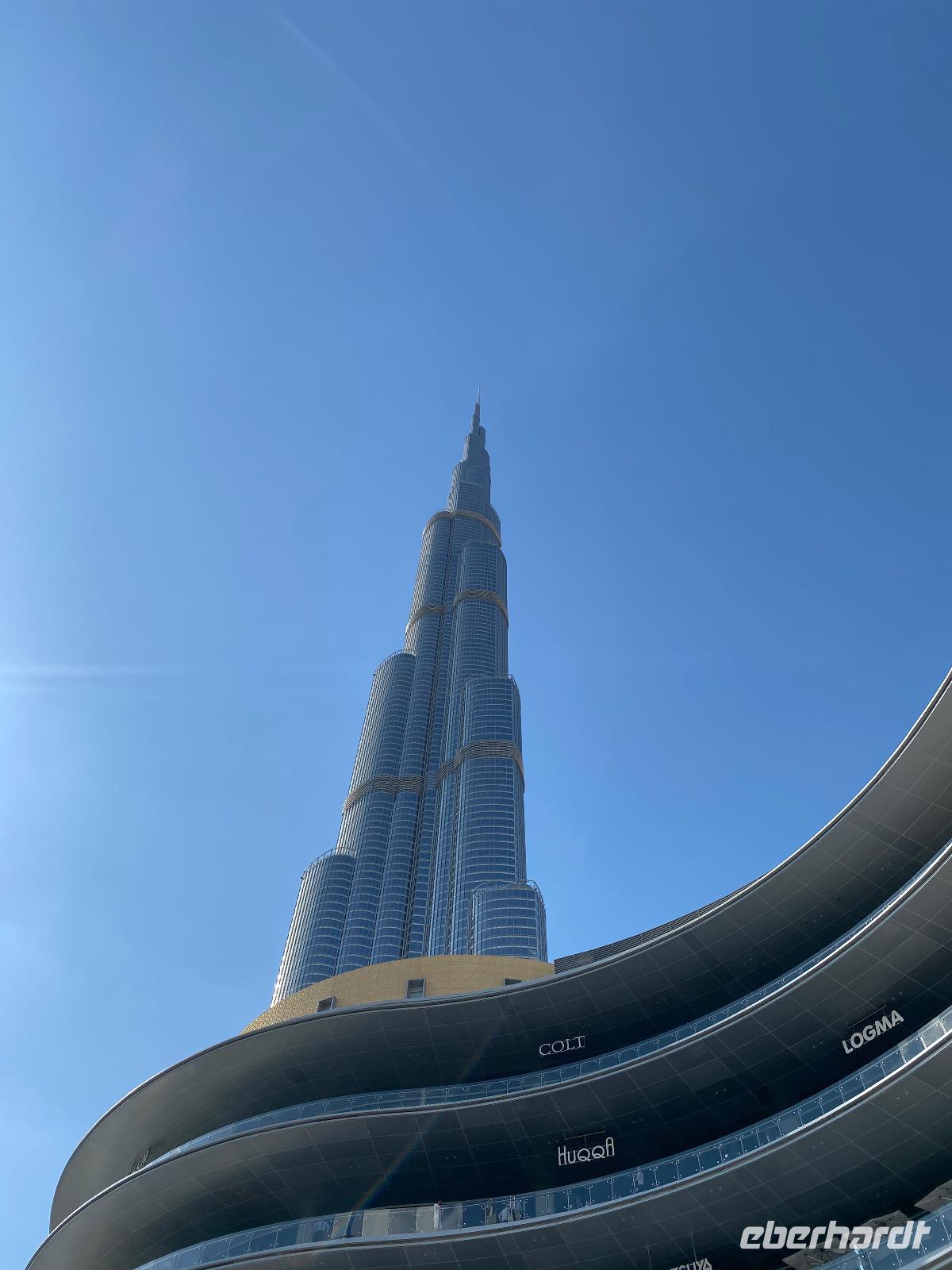 Als wir uns schließlich wiedertrafen, erwartete uns gleich ein weiteres Highlight: der Burj Khalifa. Dieser stellt seit 2008 mit ca. 830 Metern das höchste Gebäude der Welt dar. Ab 2022 soll sich dies ändern, denn in der Dubai Marina soll ein noch höheres Gebäude entstehen - der Dubai Creek Tower. Wir sind gespannt, vielleicht werden wir dieses auf unserem nächsten Besuch in Dubai erklimmen. Doch für heute stand zunächst der Burj Khalifa auf dem Programm. Zunächst konnten wir diesen bereits von außen begutachten und einige Fotos schießen, bevor wir schließlich innerhalb von 55 Sekunden zur Aussichtsplattform auf die 126. Etage hinauffuhren. Von hier genossen wir einen herrlichen Blick auf Dubai und erkannten bereits erste Teile der Stadt von oben wieder. Einfach gigantisch! Wir blickten auf Formationen von Hochhäusern hinab, alle individuell gestaltet mit ihrem eigenen, besonderen Charme. Dazwischen das leuchtende Blau des künstlich angelegten Kanals. Ein tolles Fotomotiv! Nachdem wir uns irgendwann satt gesehen hatten, fuhren wir mit dem Fahrstuhl wieder nach unten und hatten nun noch etwas Zeit, die Dubai Mall zu erkunden. Beispielsweise bestand die Möglichkeit, den Wasserfall im Inneren der Mall zu begutachten oder durch die zahlreichen Geschäfte zu stöbern.