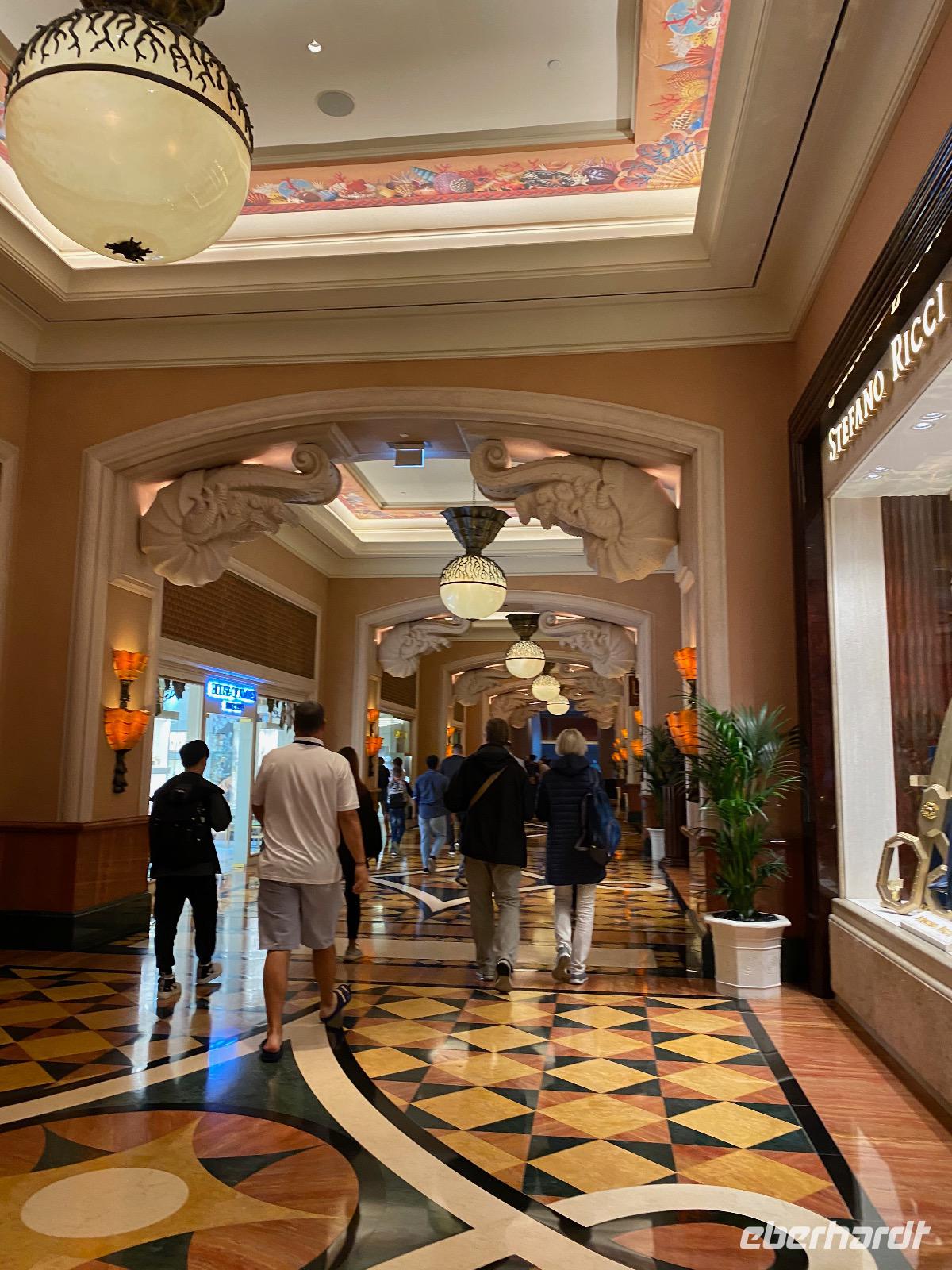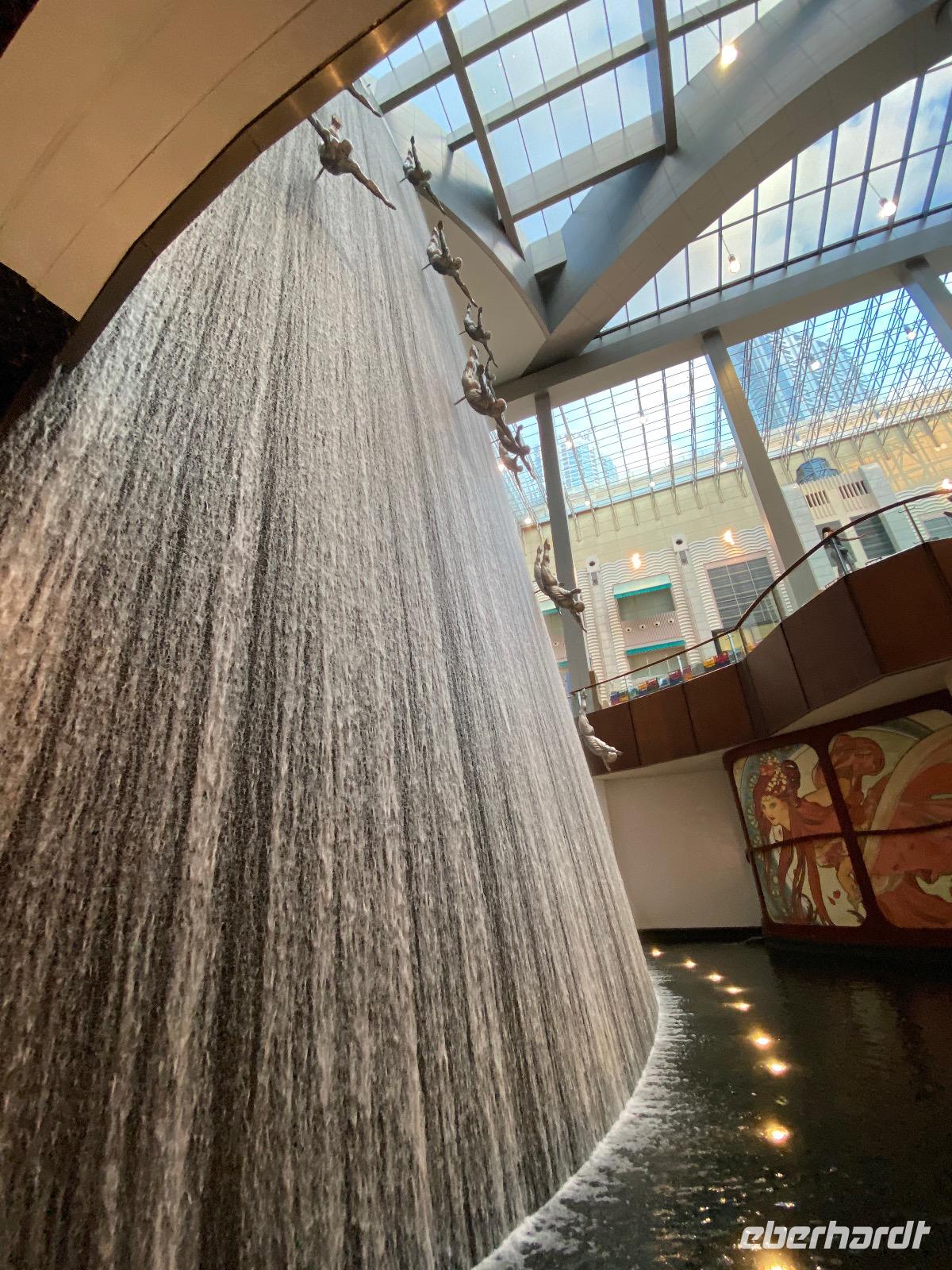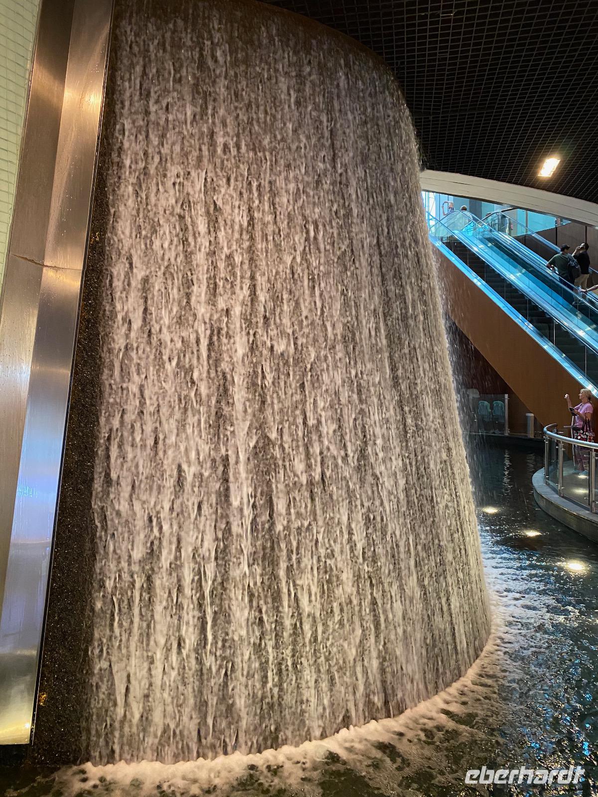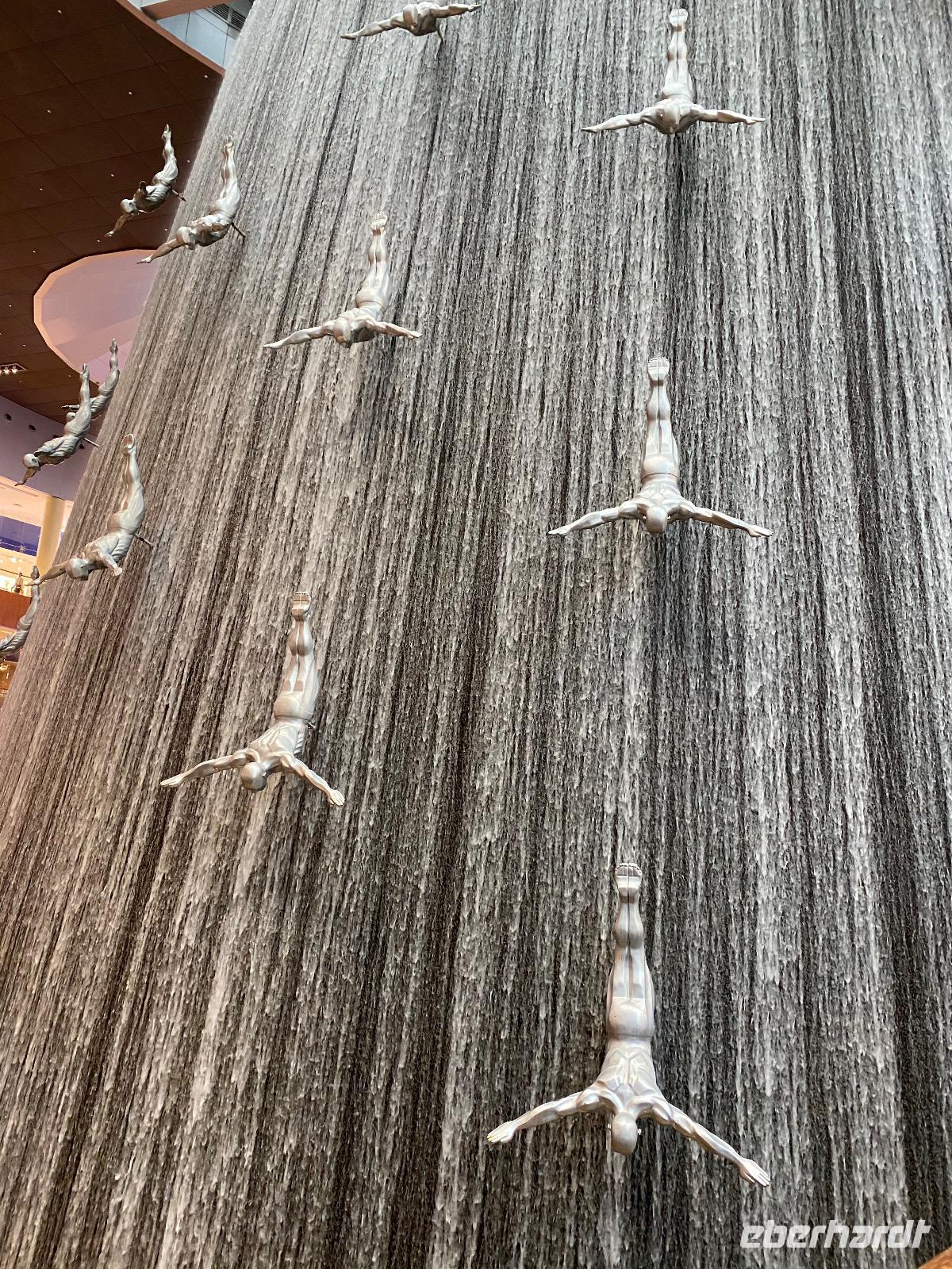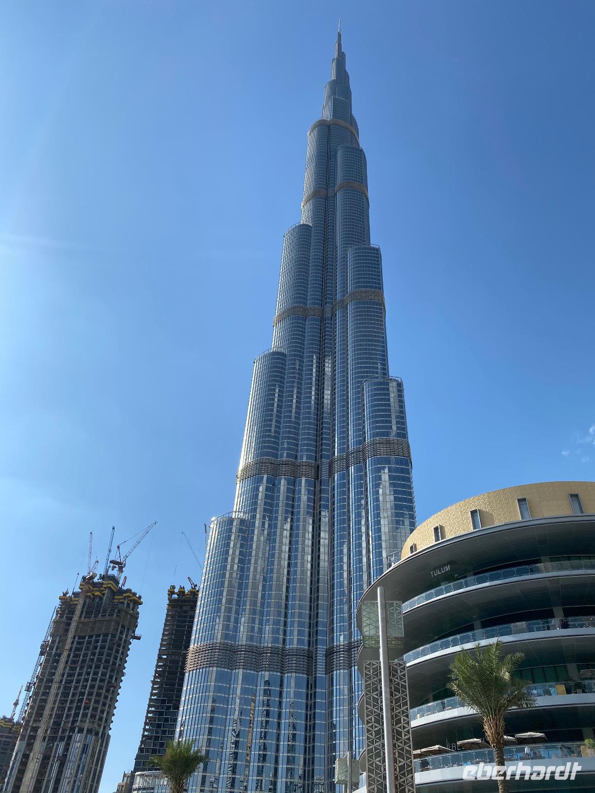 Als wir uns schließlich wiedertrafen, erwartete uns gleich ein weiteres Highlight: der Burj Khalifa. Dieser stellt seit 2008 mit ca. 830 Metern das höchste Gebäude der Welt dar. Ab 2022 soll sich dies ändern, denn in der Dubai Marina soll ein noch höheres Gebäude entstehen - der Dubai Creek Tower. Wir sind gespannt, vielleicht werden wir dieses auf unserem nächsten Besuch in Dubai erklimmen. Doch für heute stand zunächst der Burj Khalifa auf dem Programm. Zunächst konnten wir diesen bereits von außen begutachten und einige Fotos schießen, bevor wir schließlich innerhalb von 55 Sekunden zur Aussichtsplattform auf die 126. Etage hinauffuhren. Von hier genossen wir einen herrlichen Blick auf Dubai und erkannten bereits erste Teile der Stadt von oben wieder. Einfach gigantisch! Wir blickten auf Formationen von Hochhäusern hinab, alle individuell gestaltet mit ihrem eigenen, besonderen Charme. Dazwischen das leuchtende Blau des künstlich angelegten Kanals. Ein tolles Fotomotiv! Nachdem wir uns irgendwann satt gesehen hatten, fuhren wir mit dem Fahrstuhl wieder nach unten und hatten nun noch etwas Zeit, die Dubai Mall zu erkunden. Beispielsweise bestand die Möglichkeit, den Wasserfall im Inneren der Mall zu begutachten oder durch die zahlreichen Geschäfte zu stöbern.