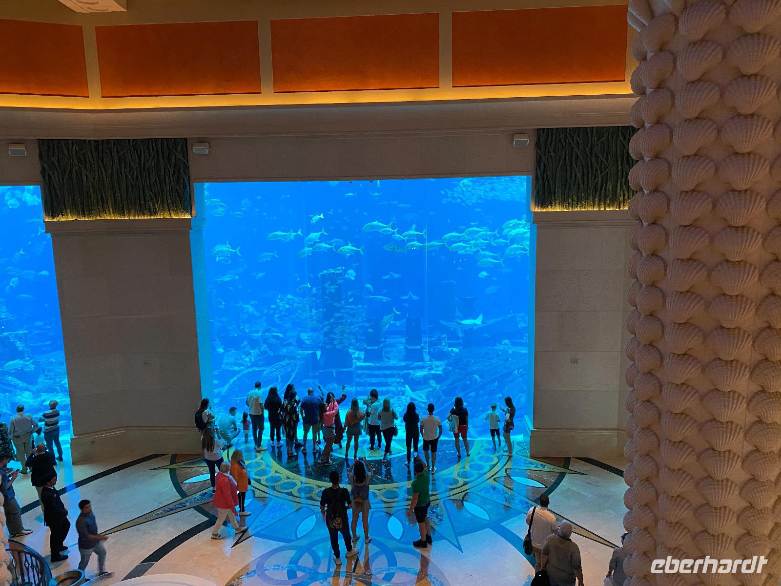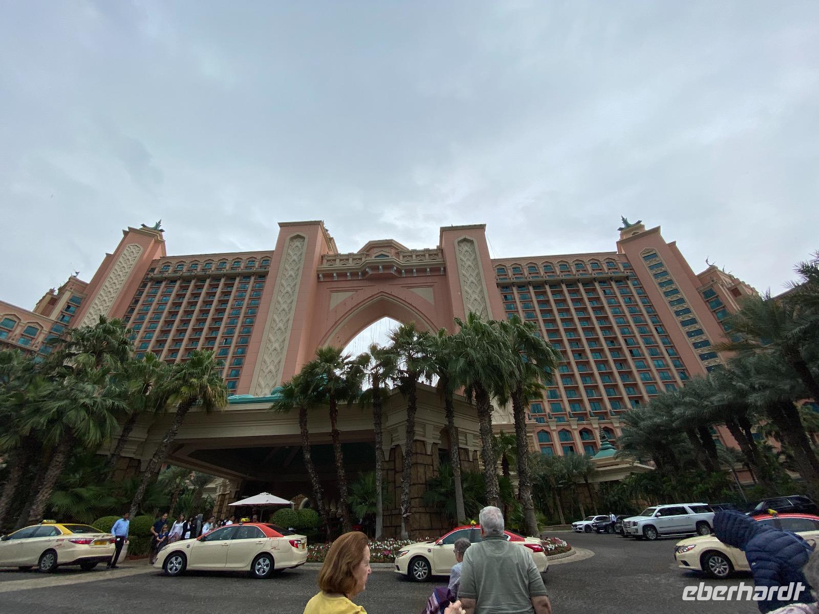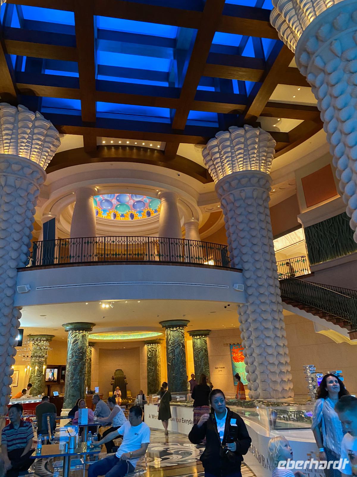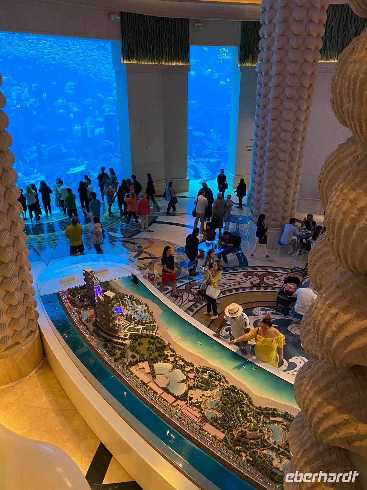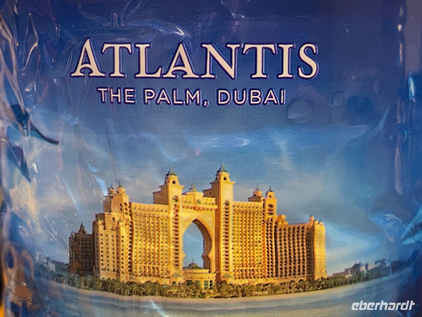 Nach einem kurzen Stop am Hotel ging es für einen Großteil der Reisegruppe bereits weiter und wir fuhren zur Palmeninsel. Über eine Brücke gelangten wir auf diese und fuhren den Stamm der Palme entlang bis wir durch einen Tunnel schließlich den „Wellenbrecher" erreichten. Hier befand sich das berühmte 5-Sterne-Hotel Atlantis, zu welchem wir nun fuhren. Hier erwartete uns ein sehr reichliches und äußerst schmackhaftes Mittagessen vom Buffet. Nach zahlreichen herzhaften Köstlichkeiten konnten wir verschiedene süße Häppchen vom äußerst umfangreichen Dessert-Buffet genießen. Satt und zufrieden verließen wir das Hotel schließlich wieder, nachdem wir noch etwas fotografieren konnten, insbesondere das Aquarium. Mit der Monorail verließen wir die Palmeninsel schließlich und wurden von unserem Bus zur Marina gebracht.