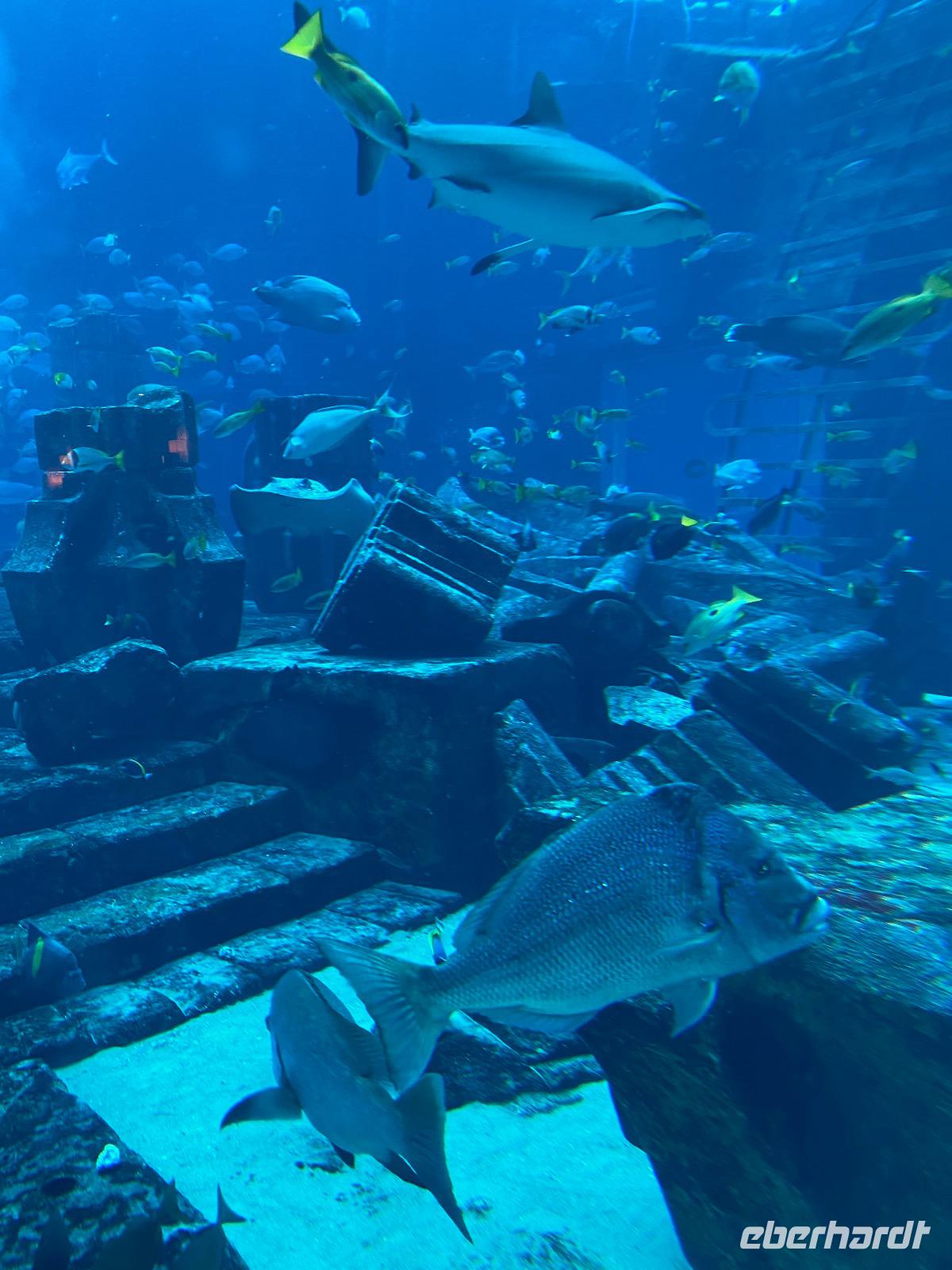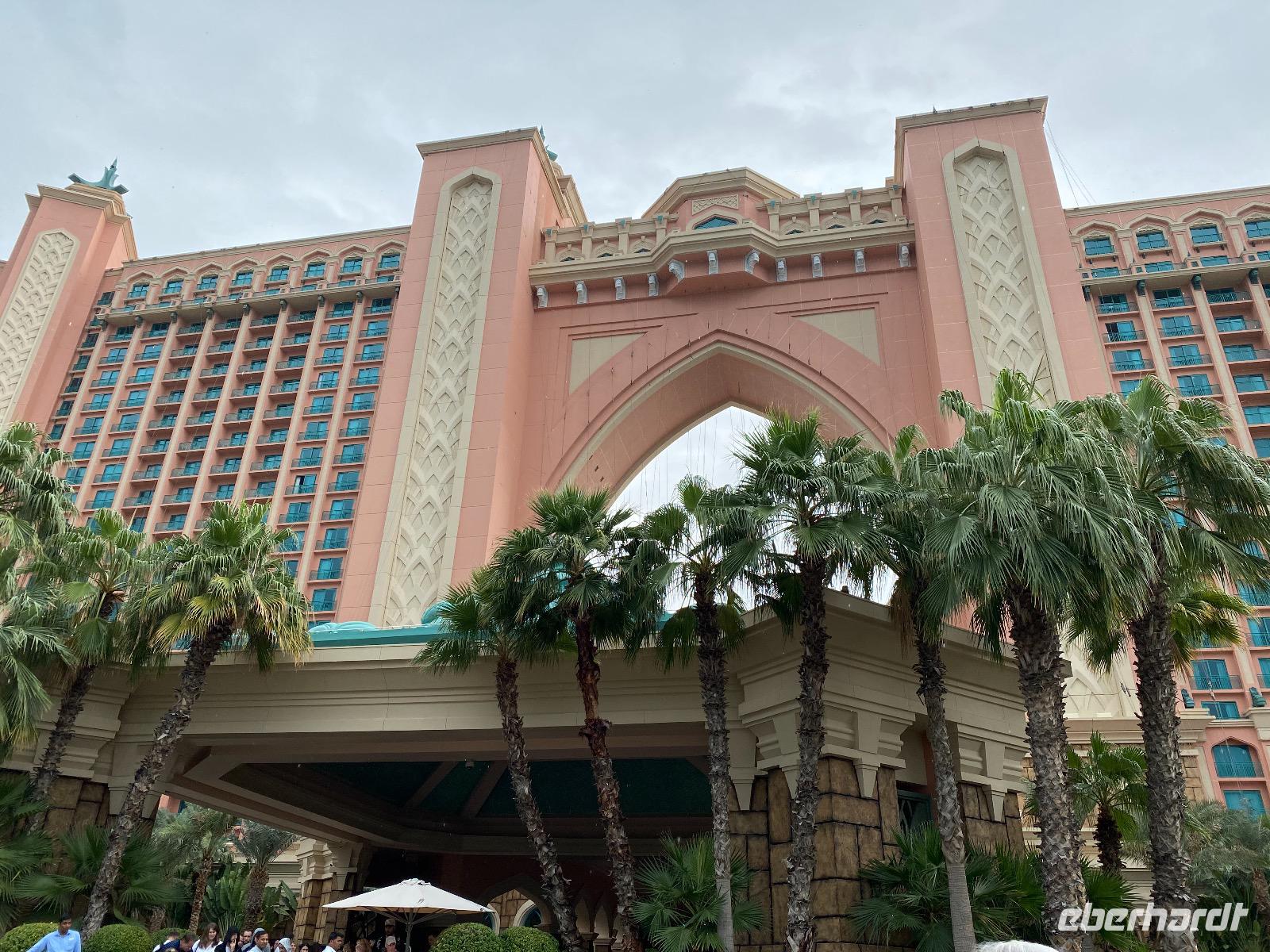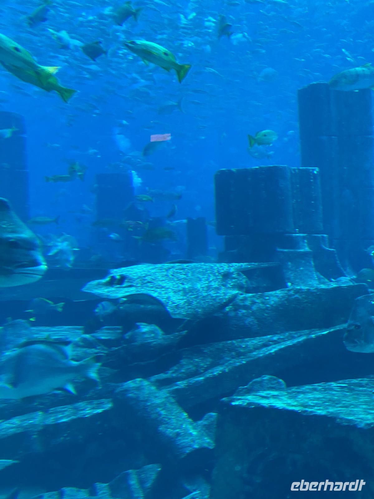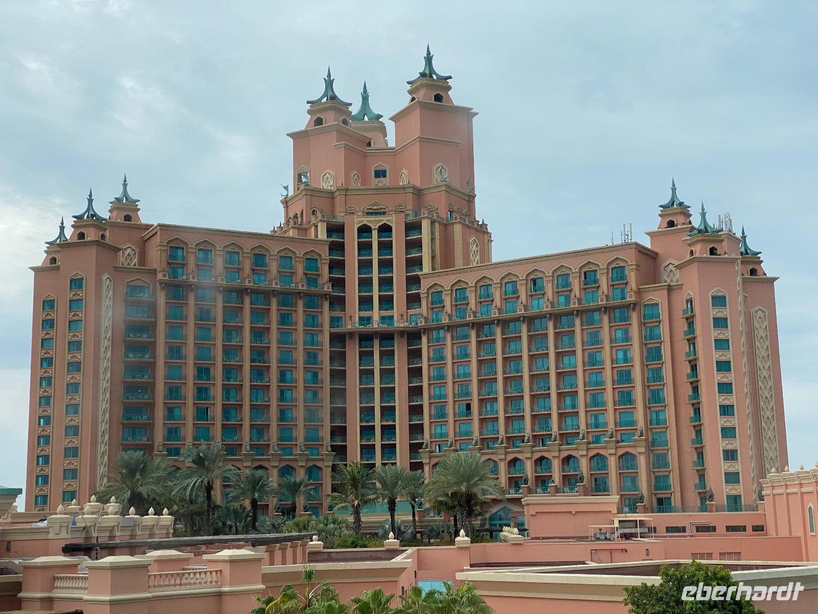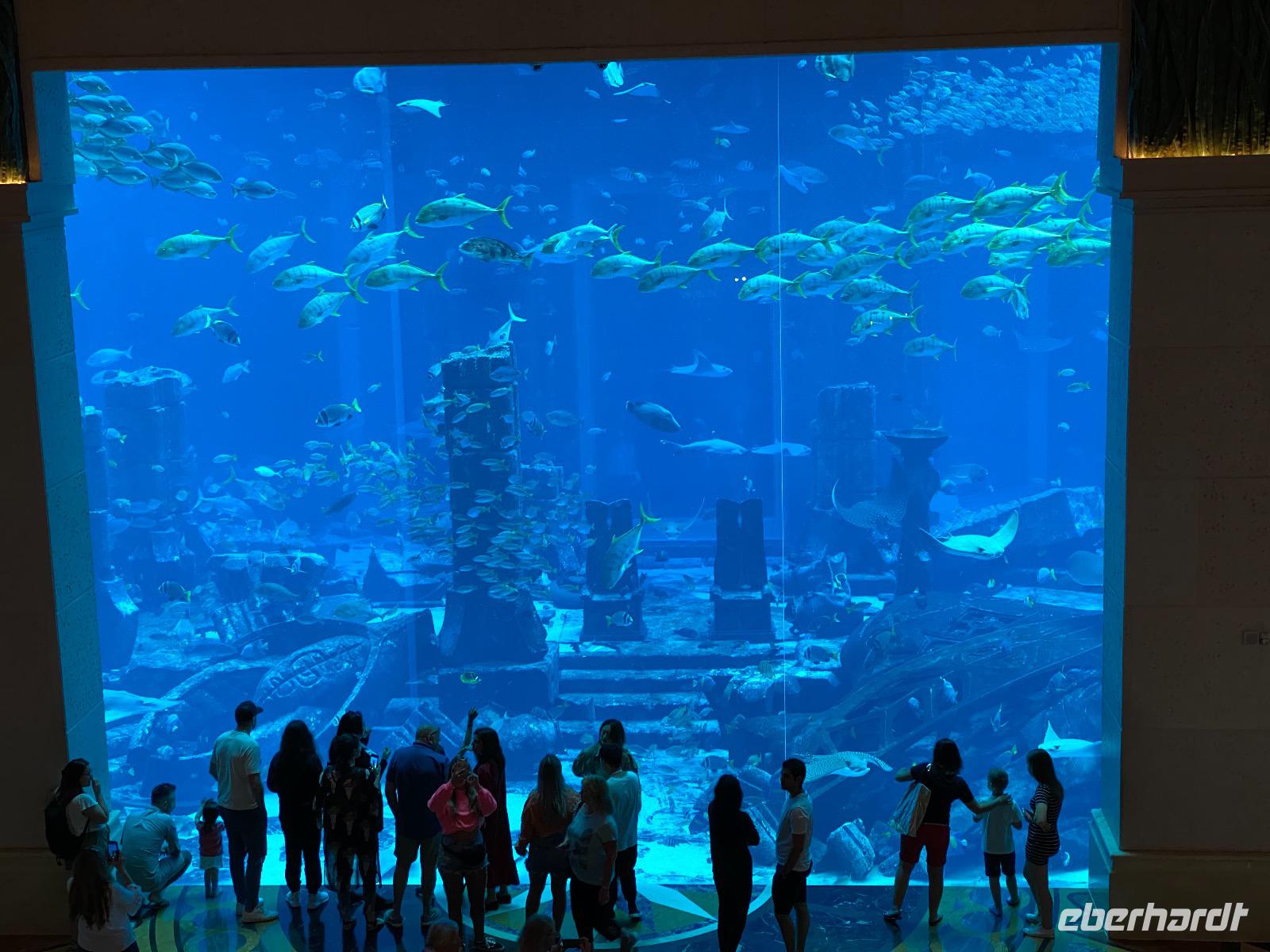 Nach einem kurzen Stop am Hotel ging es für einen Großteil der Reisegruppe bereits weiter und wir fuhren zur Palmeninsel. Über eine Brücke gelangten wir auf diese und fuhren den Stamm der Palme entlang bis wir durch einen Tunnel schließlich den „Wellenbrecher" erreichten. Hier befand sich das berühmte 5-Sterne-Hotel Atlantis, zu welchem wir nun fuhren. Hier erwartete uns ein sehr reichliches und äußerst schmackhaftes Mittagessen vom Buffet. Nach zahlreichen herzhaften Köstlichkeiten konnten wir verschiedene süße Häppchen vom äußerst umfangreichen Dessert-Buffet genießen. Satt und zufrieden verließen wir das Hotel schließlich wieder, nachdem wir noch etwas fotografieren konnten, insbesondere das Aquarium. Mit der Monorail verließen wir die Palmeninsel schließlich und wurden von unserem Bus zur Marina gebracht.