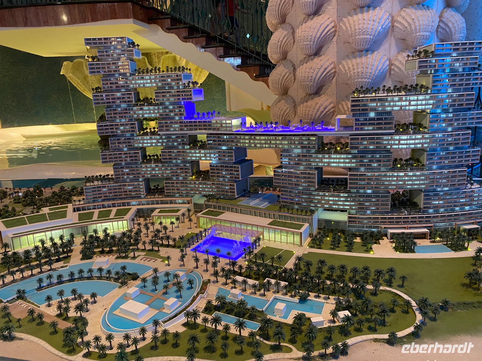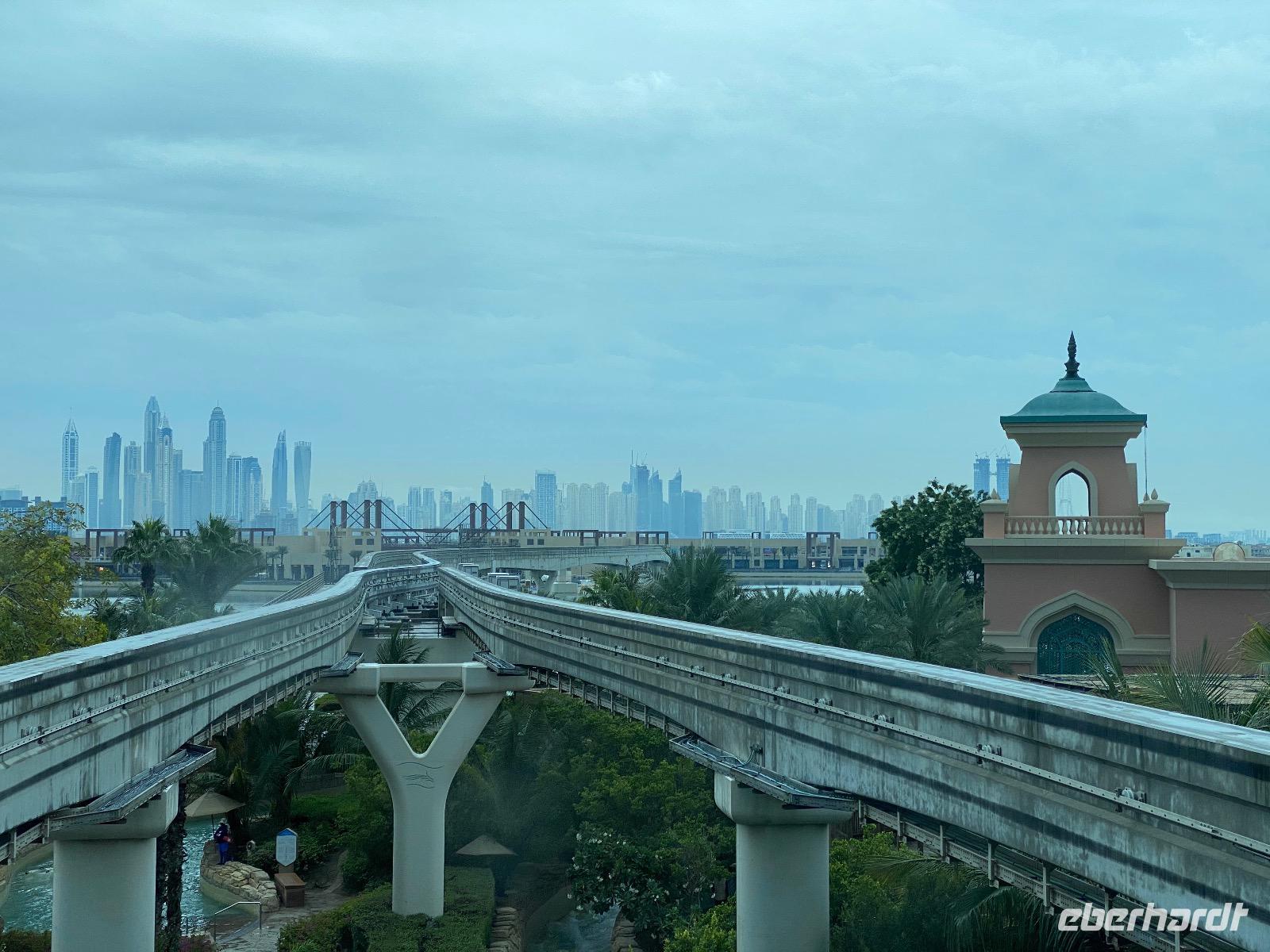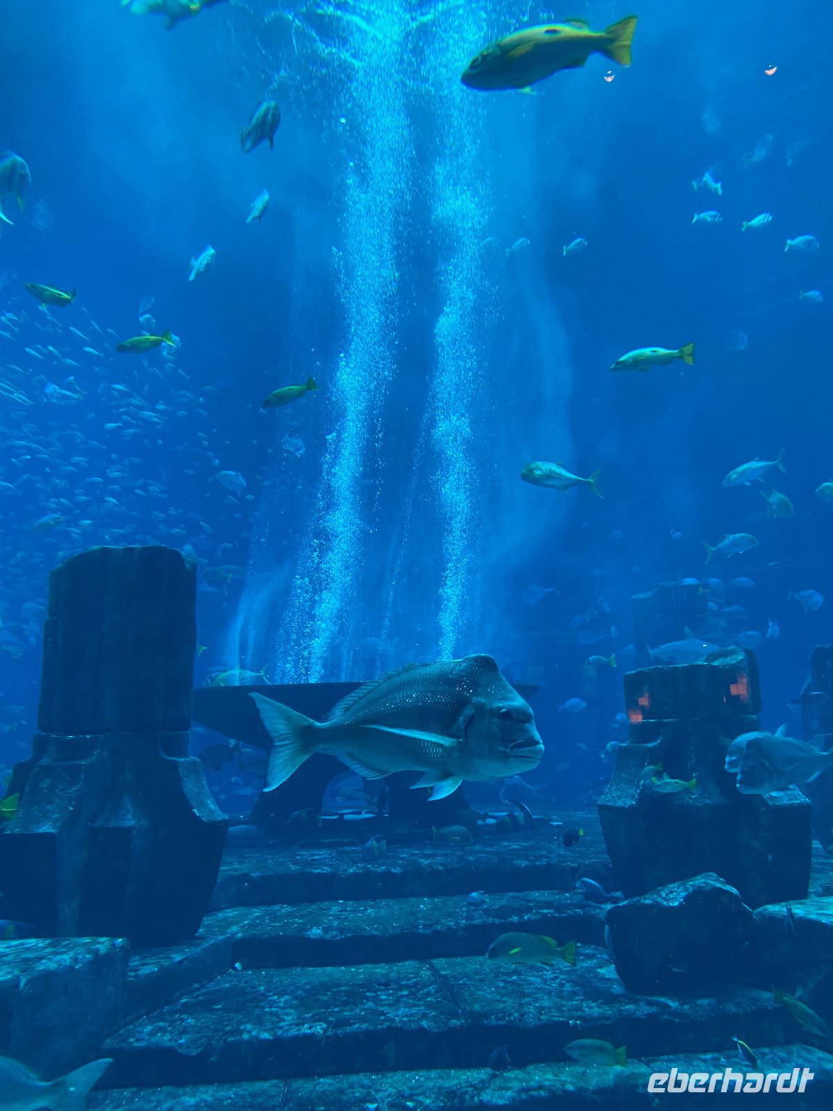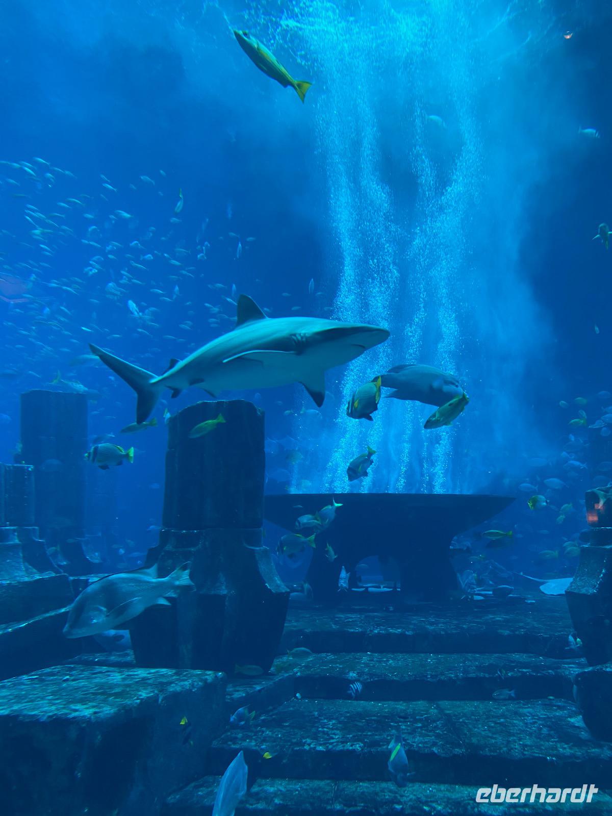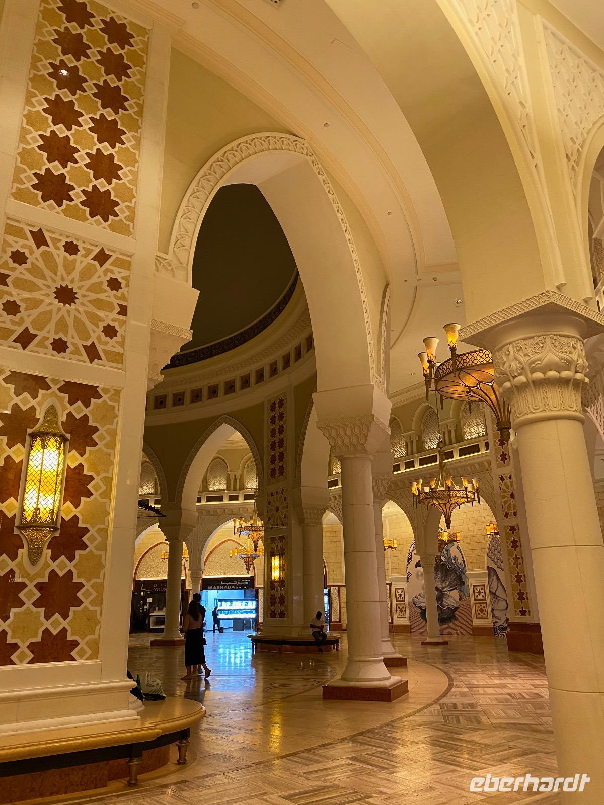 Nach einem kurzen Stop am Hotel ging es für einen Großteil der Reisegruppe bereits weiter und wir fuhren zur Palmeninsel. Über eine Brücke gelangten wir auf diese und fuhren den Stamm der Palme entlang bis wir durch einen Tunnel schließlich den „Wellenbrecher" erreichten. Hier befand sich das berühmte 5-Sterne-Hotel Atlantis, zu welchem wir nun fuhren. Hier erwartete uns ein sehr reichliches und äußerst schmackhaftes Mittagessen vom Buffet. Nach zahlreichen herzhaften Köstlichkeiten konnten wir verschiedene süße Häppchen vom äußerst umfangreichen Dessert-Buffet genießen. Satt und zufrieden verließen wir das Hotel schließlich wieder, nachdem wir noch etwas fotografieren konnten, insbesondere das Aquarium. Mit der Monorail verließen wir die Palmeninsel schließlich und wurden von unserem Bus zur Marina gebracht.
