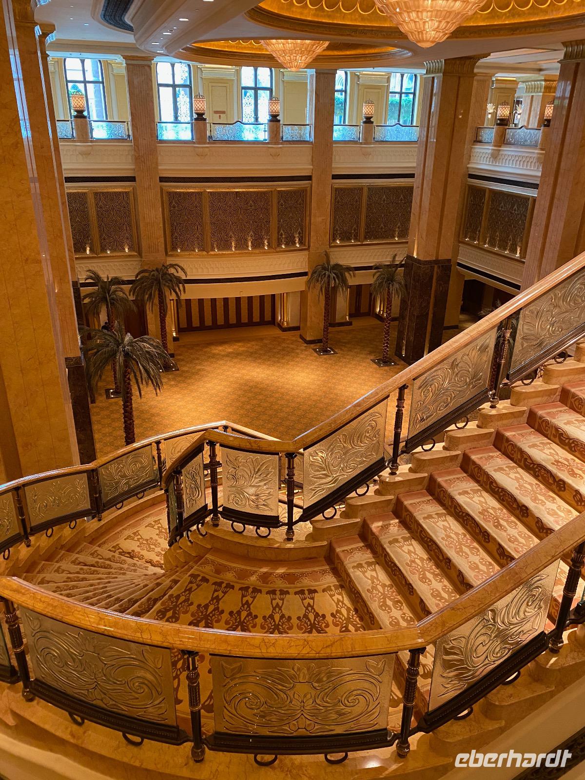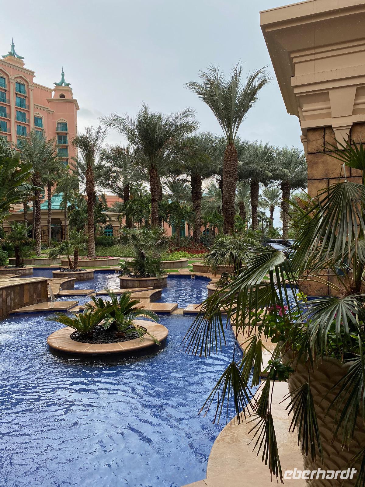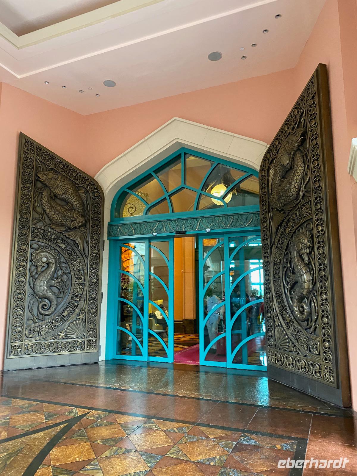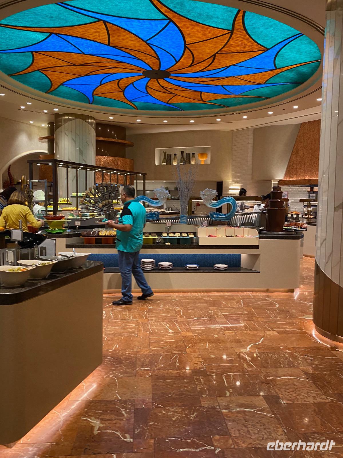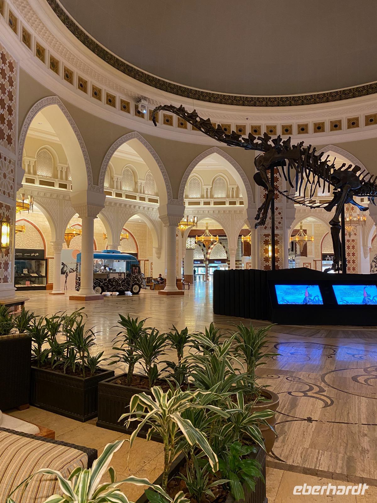 Nach einem kurzen Stop am Hotel ging es für einen Großteil der Reisegruppe bereits weiter und wir fuhren zur Palmeninsel. Über eine Brücke gelangten wir auf diese und fuhren den Stamm der Palme entlang bis wir durch einen Tunnel schließlich den „Wellenbrecher" erreichten. Hier befand sich das berühmte 5-Sterne-Hotel Atlantis, zu welchem wir nun fuhren. Hier erwartete uns ein sehr reichliches und äußerst schmackhaftes Mittagessen vom Buffet. Nach zahlreichen herzhaften Köstlichkeiten konnten wir verschiedene süße Häppchen vom äußerst umfangreichen Dessert-Buffet genießen. Satt und zufrieden verließen wir das Hotel schließlich wieder, nachdem wir noch etwas fotografieren konnten, insbesondere das Aquarium. Mit der Monorail verließen wir die Palmeninsel schließlich und wurden von unserem Bus zur Marina gebracht.