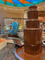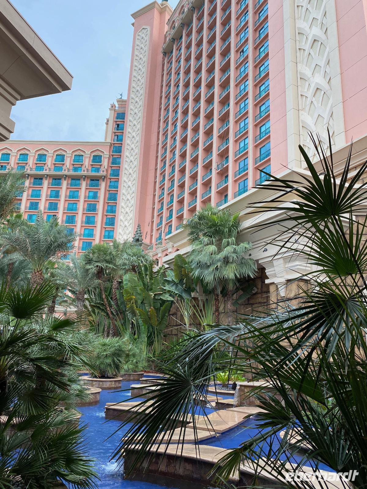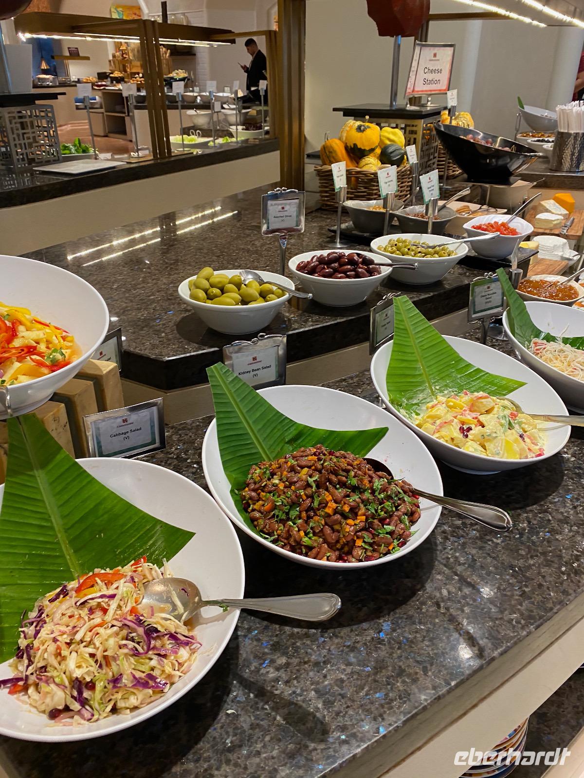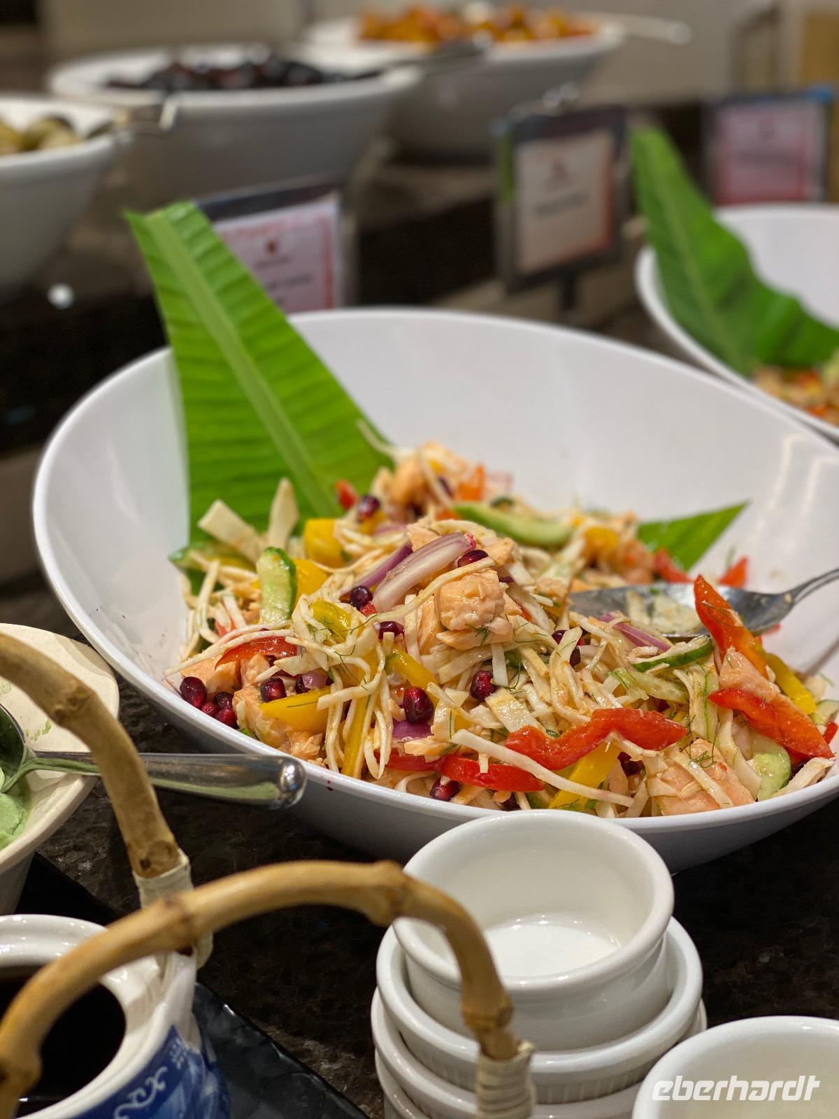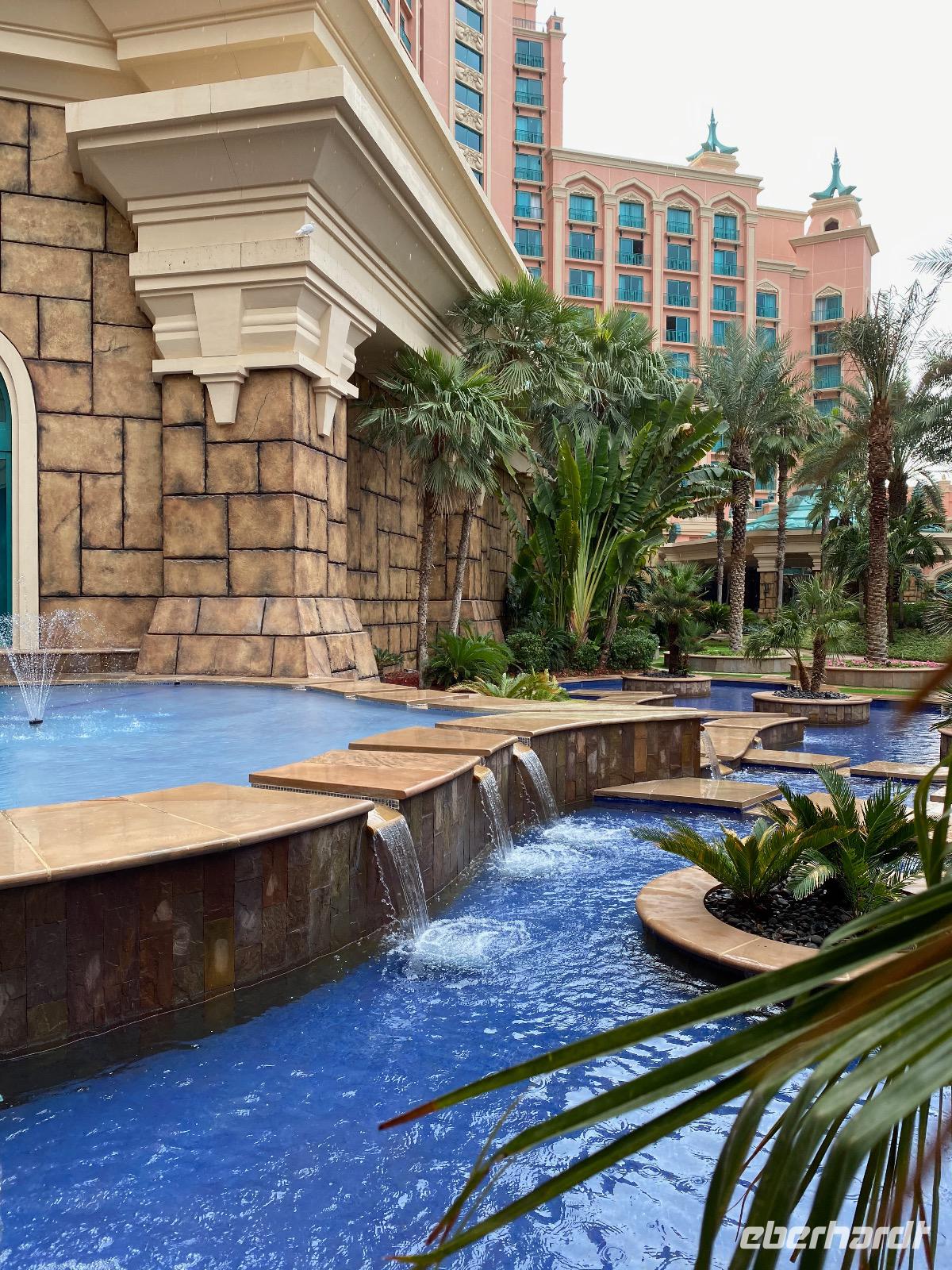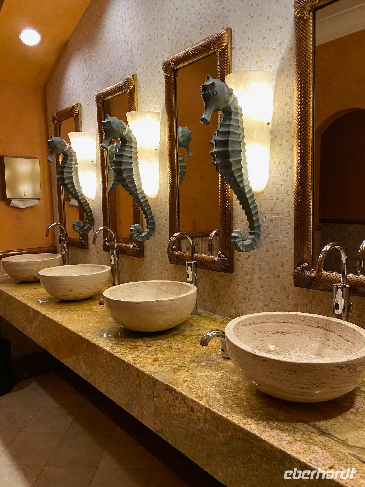 Nach einem kurzen Stop am Hotel ging es für einen Großteil der Reisegruppe bereits weiter und wir fuhren zur Palmeninsel. Über eine Brücke gelangten wir auf diese und fuhren den Stamm der Palme entlang bis wir durch einen Tunnel schließlich den „Wellenbrecher" erreichten. Hier befand sich das berühmte 5-Sterne-Hotel Atlantis, zu welchem wir nun fuhren. Hier erwartete uns ein sehr reichliches und äußerst schmackhaftes Mittagessen vom Buffet. Nach zahlreichen herzhaften Köstlichkeiten konnten wir verschiedene süße Häppchen vom äußerst umfangreichen Dessert-Buffet genießen. Satt und zufrieden verließen wir das Hotel schließlich wieder, nachdem wir noch etwas fotografieren konnten, insbesondere das Aquarium. Mit der Monorail verließen wir die Palmeninsel schließlich und wurden von unserem Bus zur Marina gebracht.