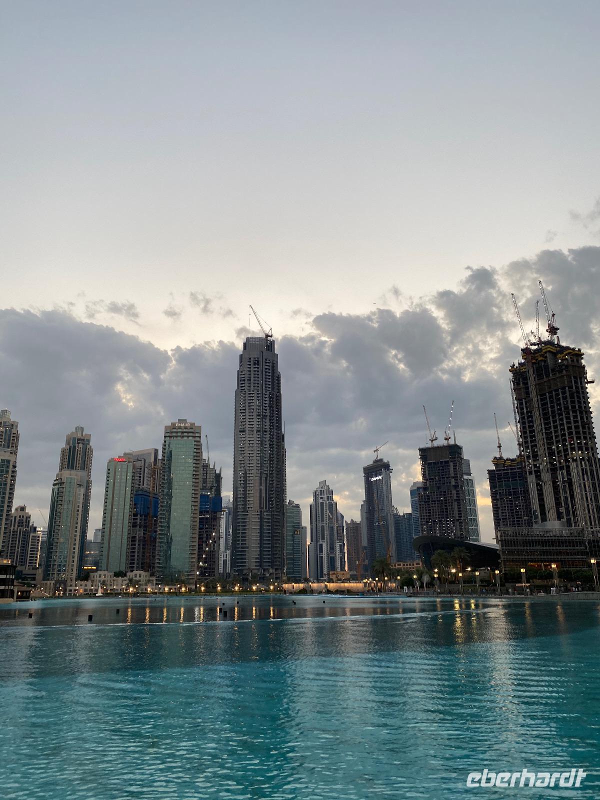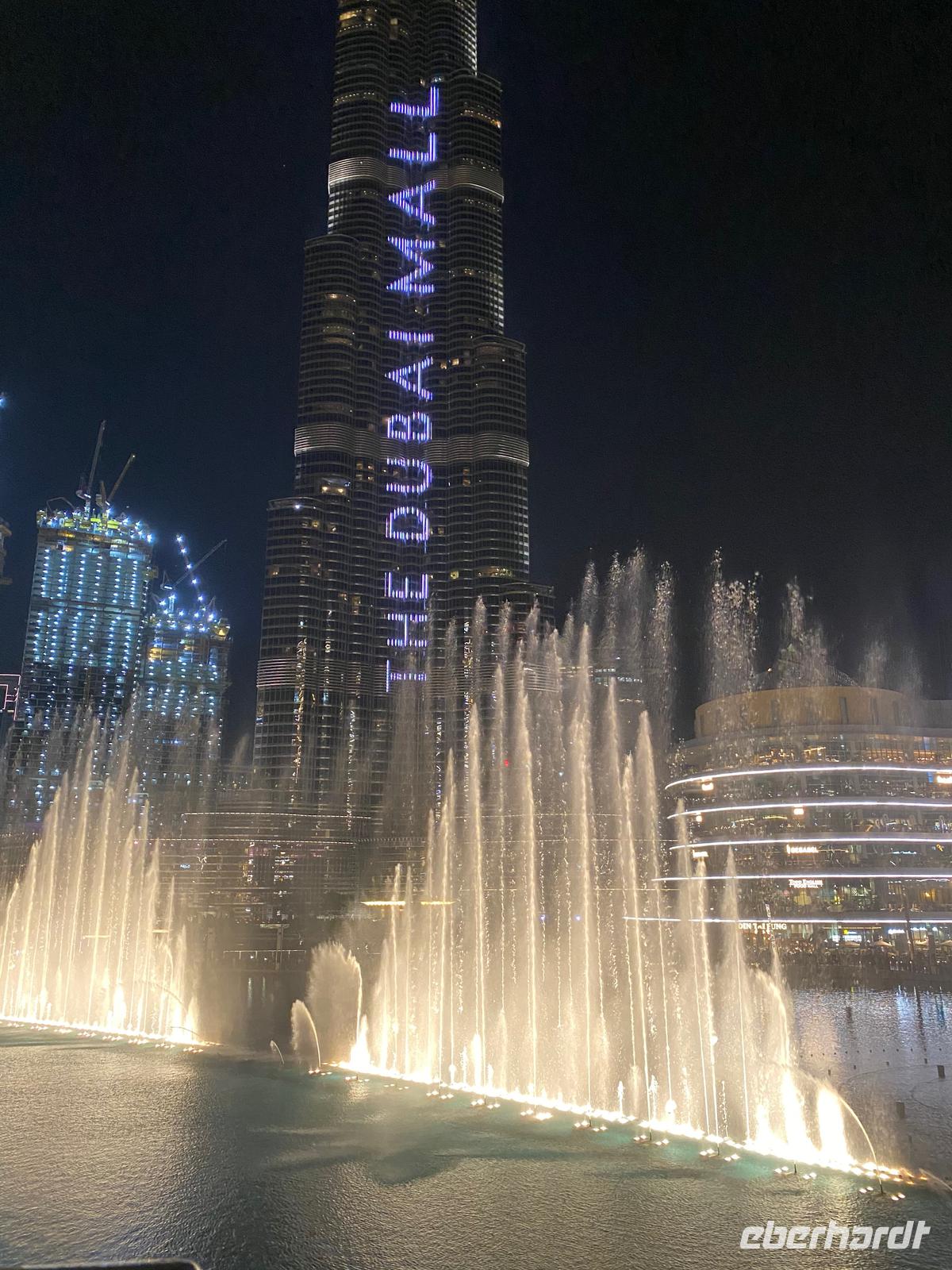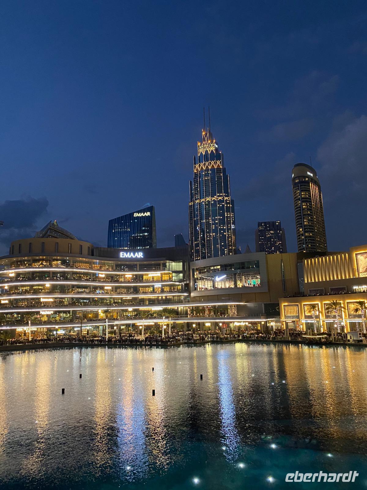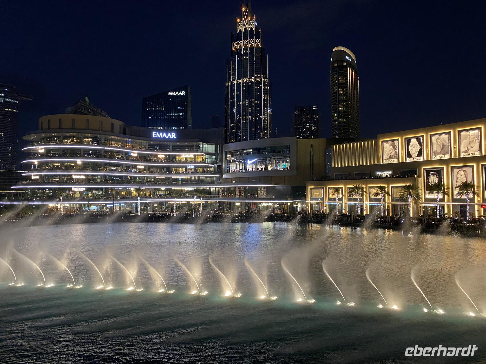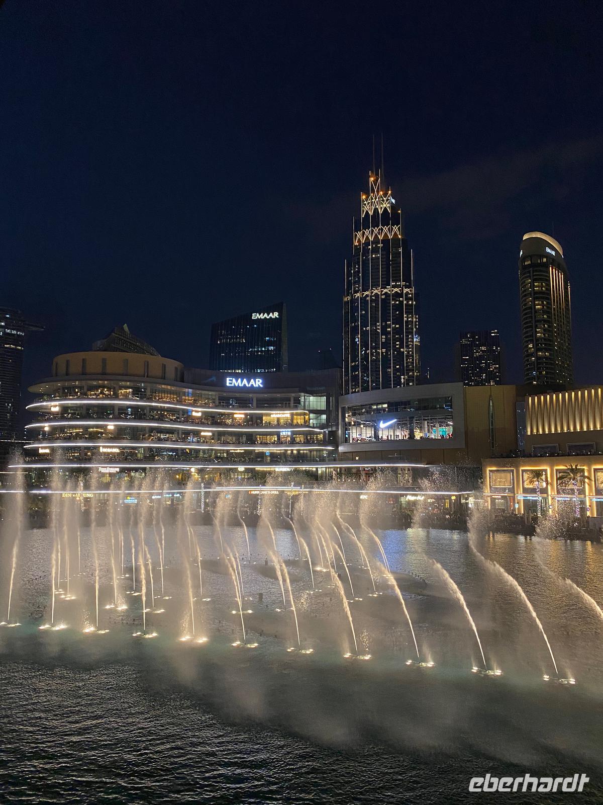 Schließlich trafen wir uns bei einsetzender Dämmerung wieder, um die Mall gemeinsam zu verlassen und uns auf den Weg zum Restaurant für das heutige Abendessen zu machen. Dieses lag an der anderen Seite des türkisblauen Wassers, direkt gegenüber der Mall sowie des Burj Khalifa. Kaum waren wir an unseren Plätzen angekommen, begannen auch schon die täglich ab 18.00 Uhr stattfindenden Wasserspiele. Riesige Fontänen stiegen in die Höhe, musikalisch untermalt und Teil einer wunderbaren Choreografie. Aller 30 Minuten durften wir das Schauspiel von Neuem bewundern, doch immer wieder war es etwas anders und mit einer anderen Musikart unterlegt. Absolut beeindruckend! Dabei ließen wir uns ein sehr reichliches und schmackhaftes, typisch arabisches Abendessen schmecken. Ein toller Ausklang eines Tages voller Highlights. Satt und zufrieden verließen wir das Restaurant und spazierten durch die imposante, beleuchtete Stadt hindurch zu unserem Bus, welcher uns sicher zurück zu unserem Hotel brachte.