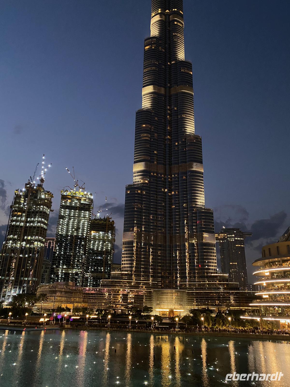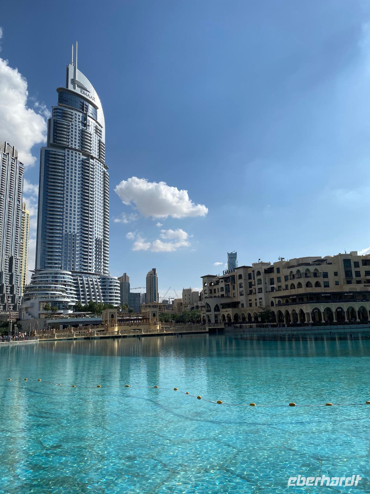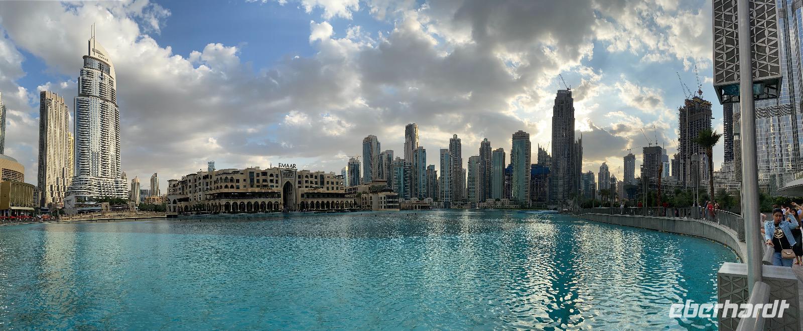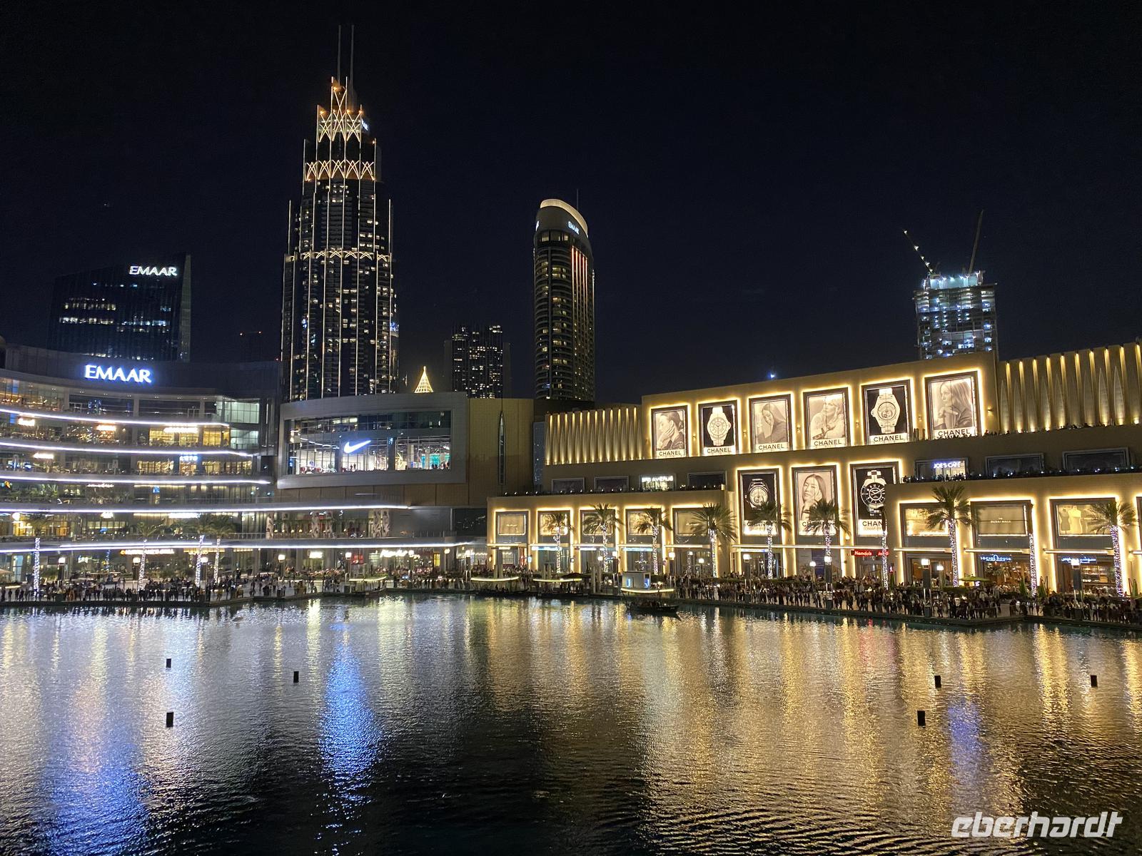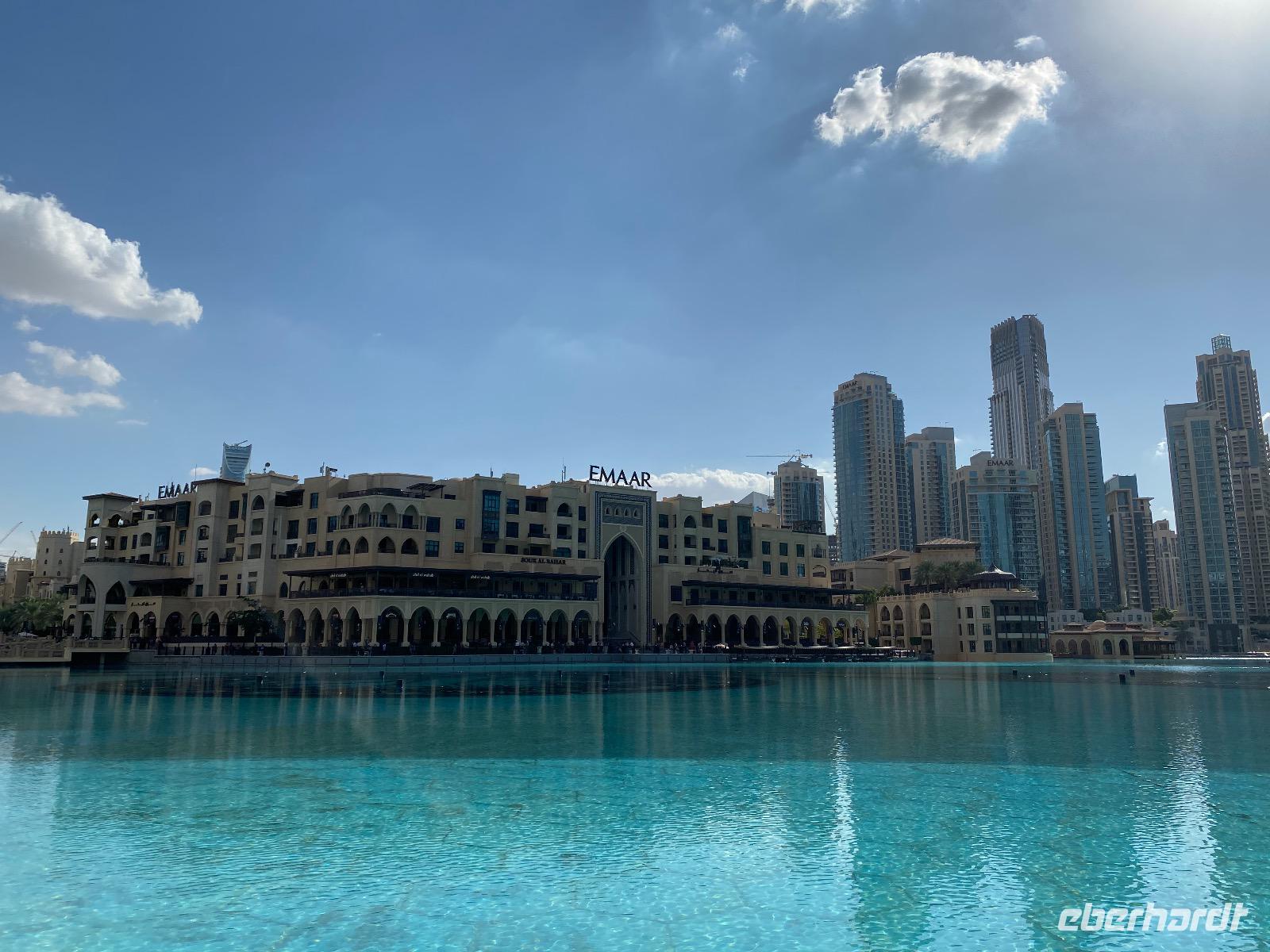 Schließlich trafen wir uns bei einsetzender Dämmerung wieder, um die Mall gemeinsam zu verlassen und uns auf den Weg zum Restaurant für das heutige Abendessen zu machen. Dieses lag an der anderen Seite des türkisblauen Wassers, direkt gegenüber der Mall sowie des Burj Khalifa. Kaum waren wir an unseren Plätzen angekommen, begannen auch schon die täglich ab 18.00 Uhr stattfindenden Wasserspiele. Riesige Fontänen stiegen in die Höhe, musikalisch untermalt und Teil einer wunderbaren Choreografie. Aller 30 Minuten durften wir das Schauspiel von Neuem bewundern, doch immer wieder war es etwas anders und mit einer anderen Musikart unterlegt. Absolut beeindruckend! Dabei ließen wir uns ein sehr reichliches und schmackhaftes, typisch arabisches Abendessen schmecken. Ein toller Ausklang eines Tages voller Highlights. Satt und zufrieden verließen wir das Restaurant und spazierten durch die imposante, beleuchtete Stadt hindurch zu unserem Bus, welcher uns sicher zurück zu unserem Hotel brachte.